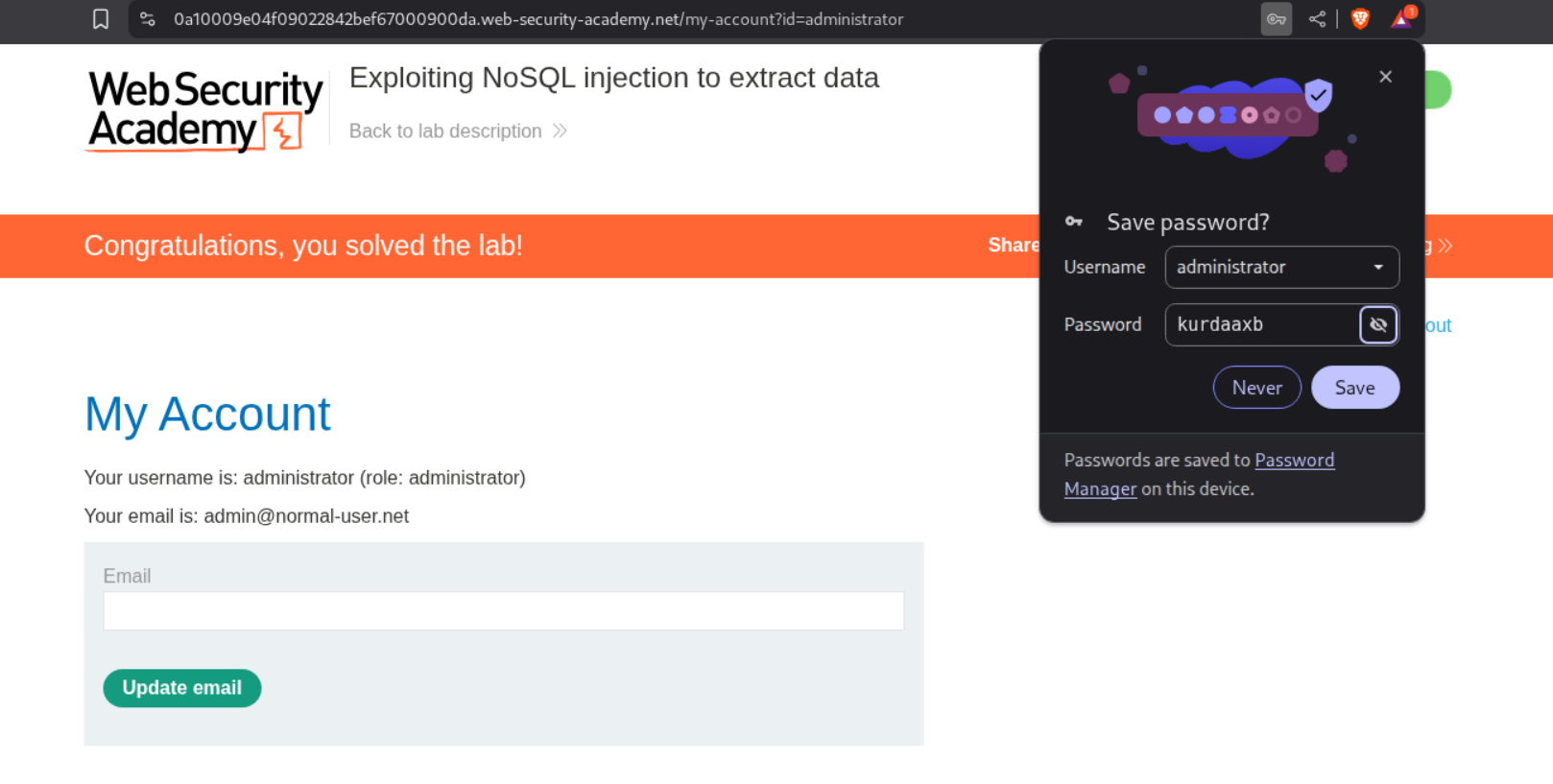 We need to exploit the NoSQL injection to extract the password for the administrator user.