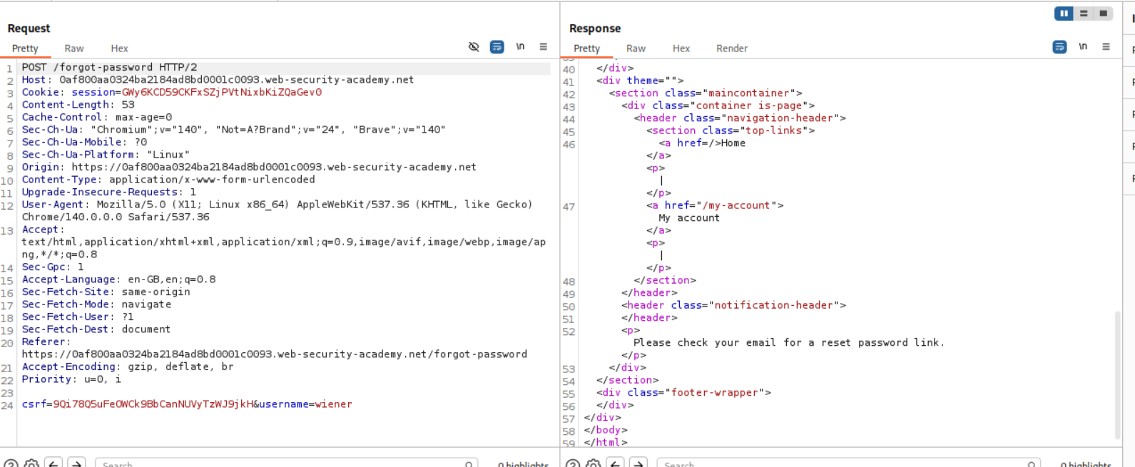 Next we send a forgot password reset. I sent one for wiener as well as carlos later on. We do not have access to a mail box obviously.