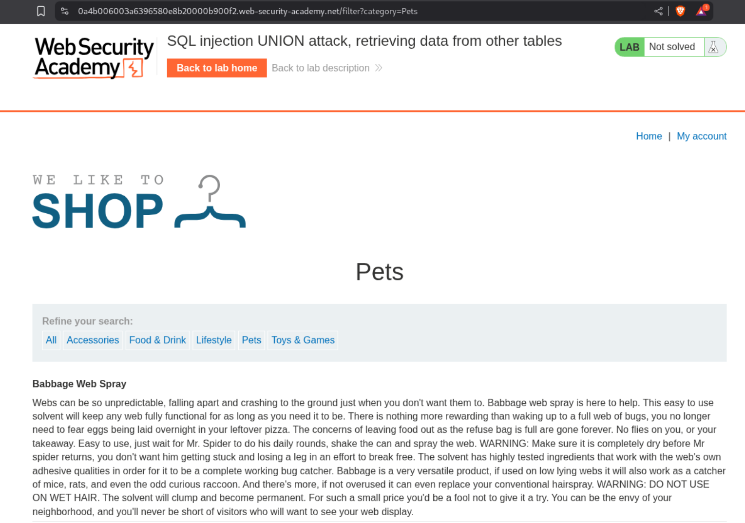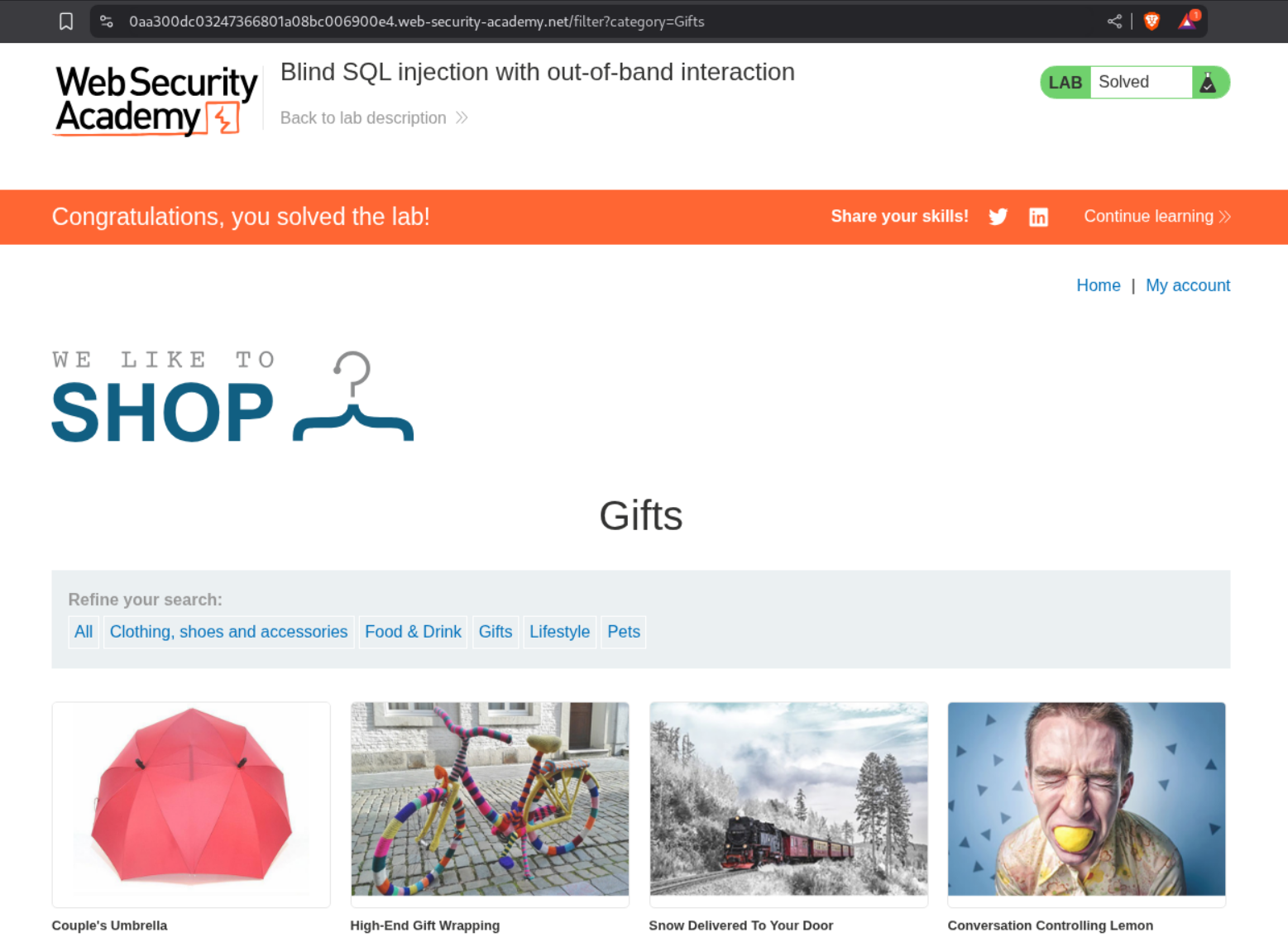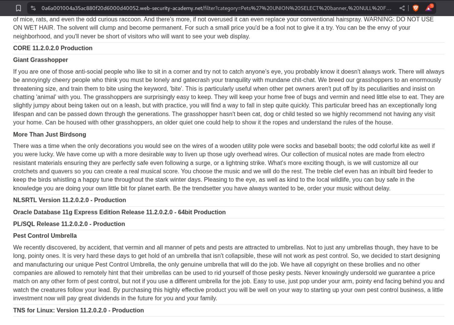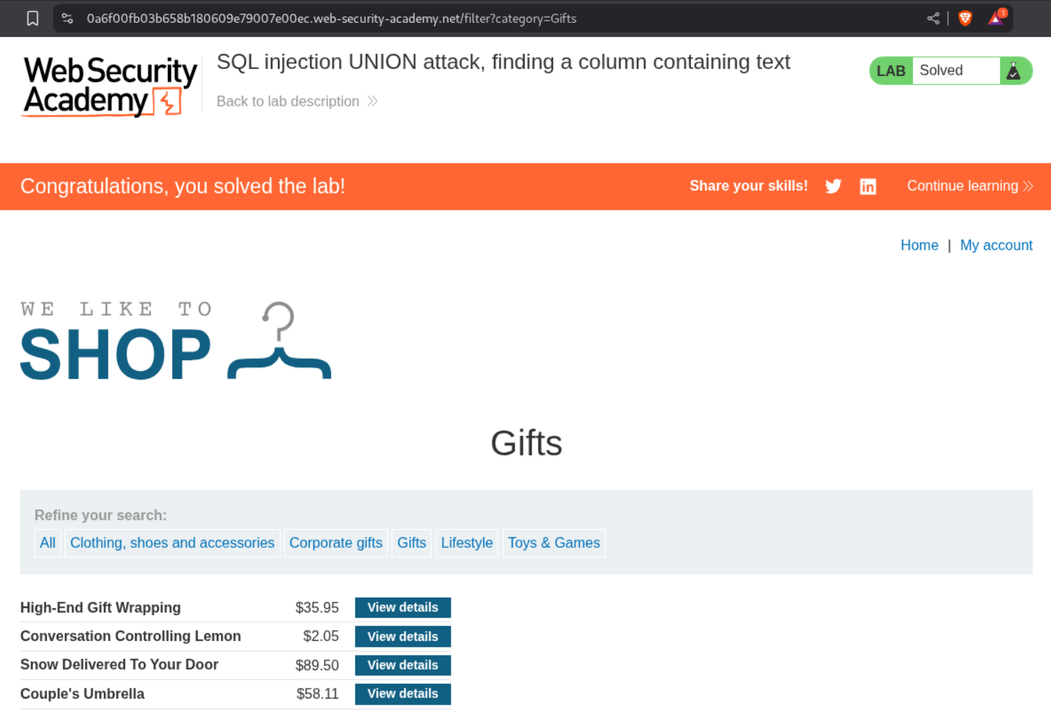 https://0a71008003e2b89780d0585c00140016.web-security-academy.net/filter?category=Gifts%27%20OR%20%271%27%20=%20%271%27%20--%20-