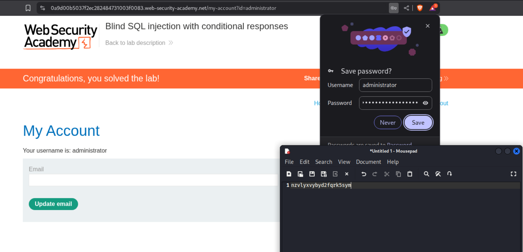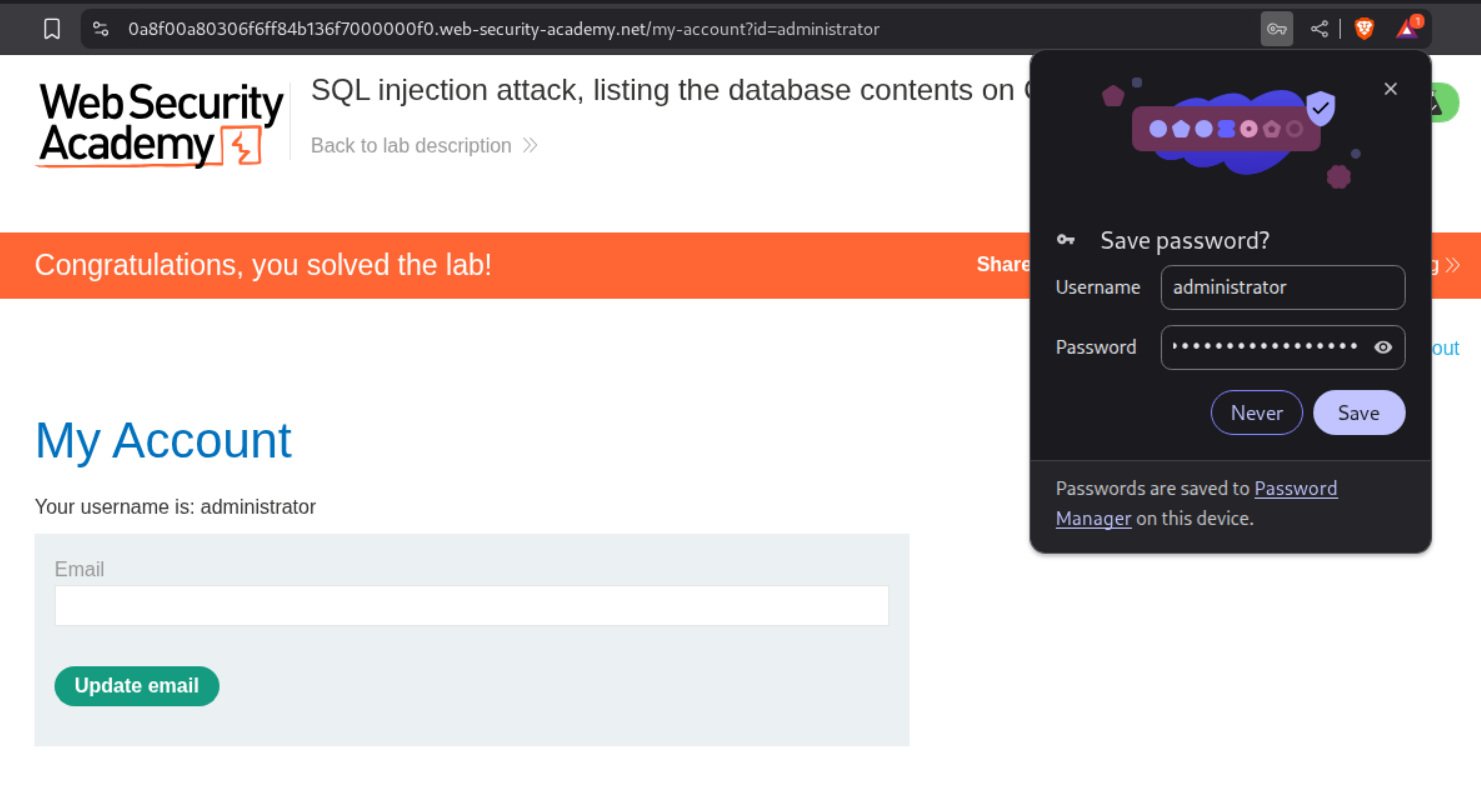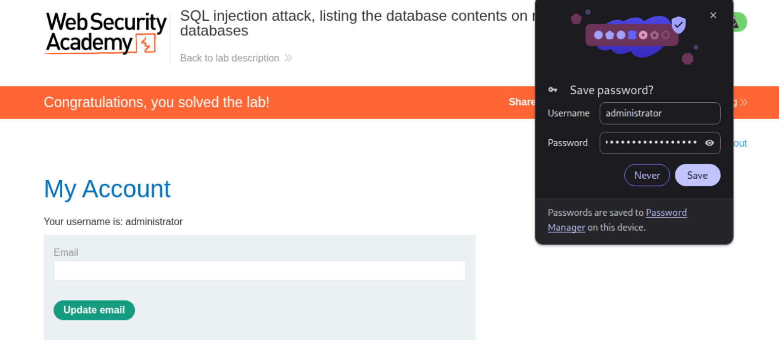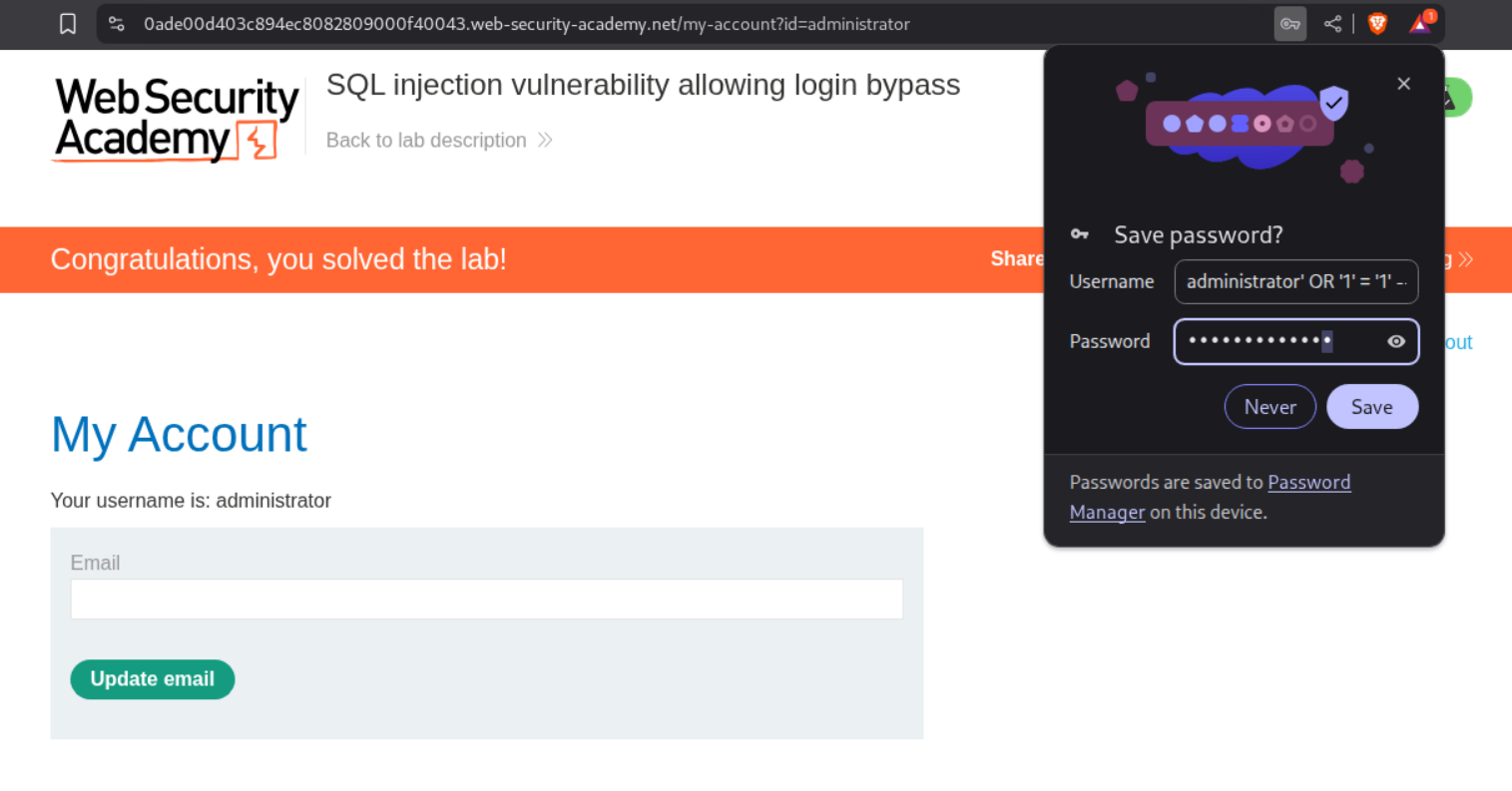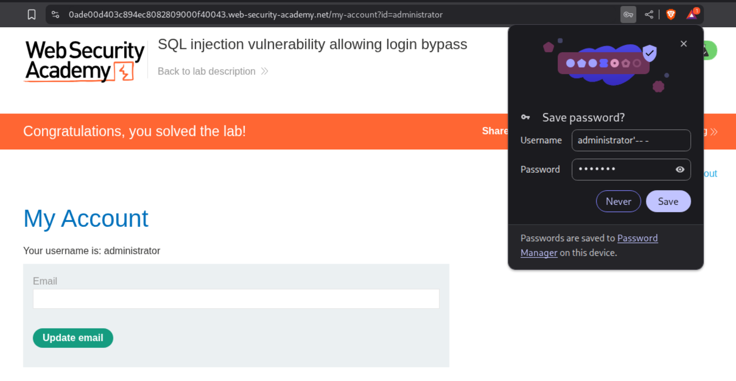 SQL injection remains one of the most dangerous web vulnerabilities despite being well-documented. The practical experience from these labs reinforced the importance of using parameterized queries and proper input validation in all database interactions. Moving forward, I’ll continue exploring advanced web vulnerabilities and working toward completing the BSCP certification path
