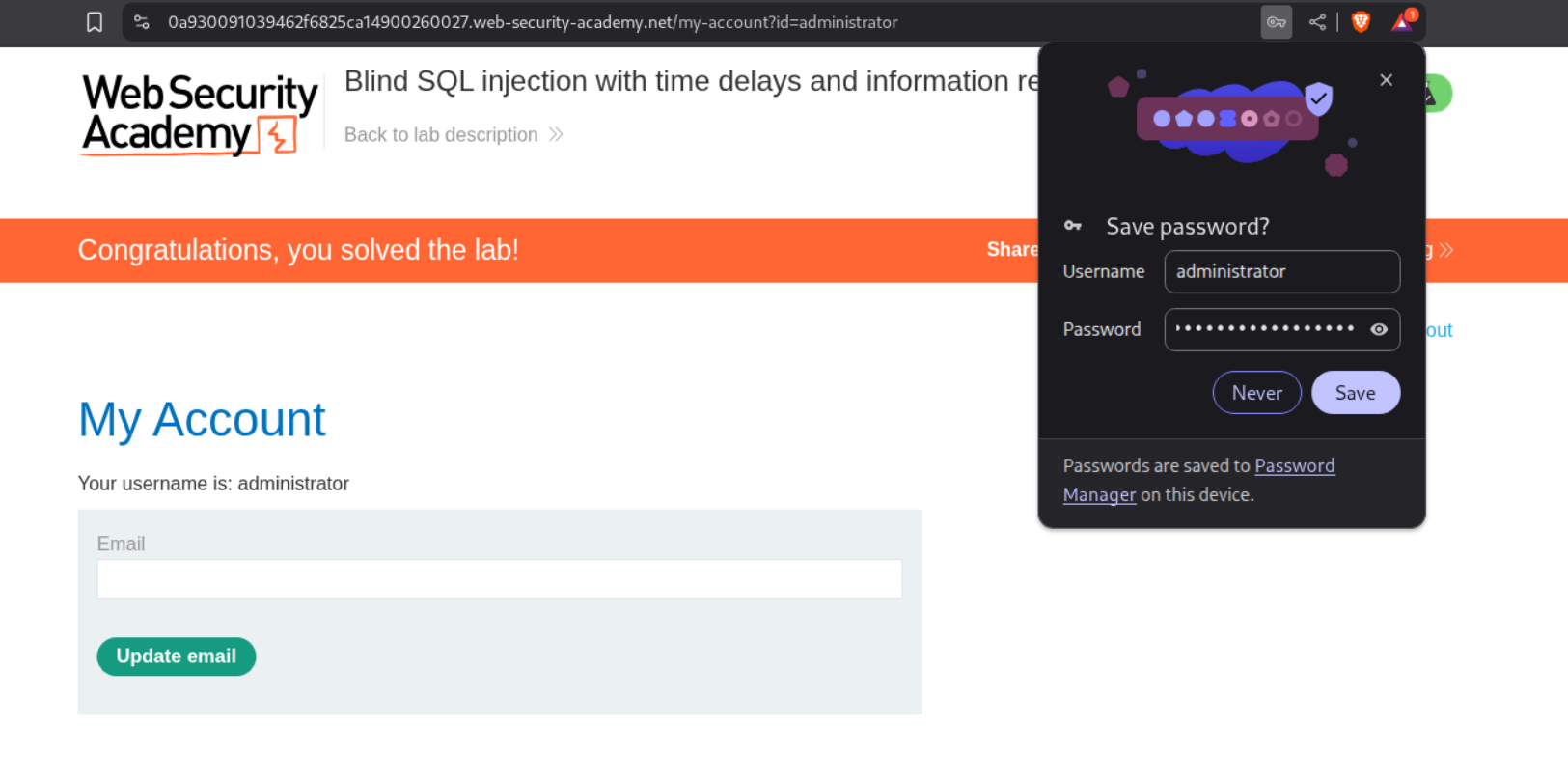 I started the lab by triggering a time delay. The following payload works as admdinistrator is 13 characters long.