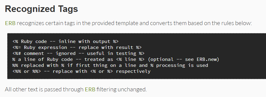 | ERB | Ruby | <%= expression %> | <%= system("id") %> or <%= `id` %> |