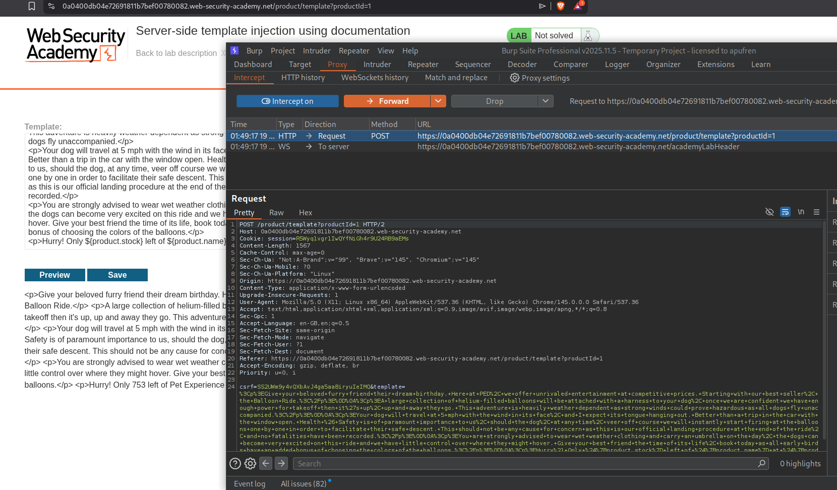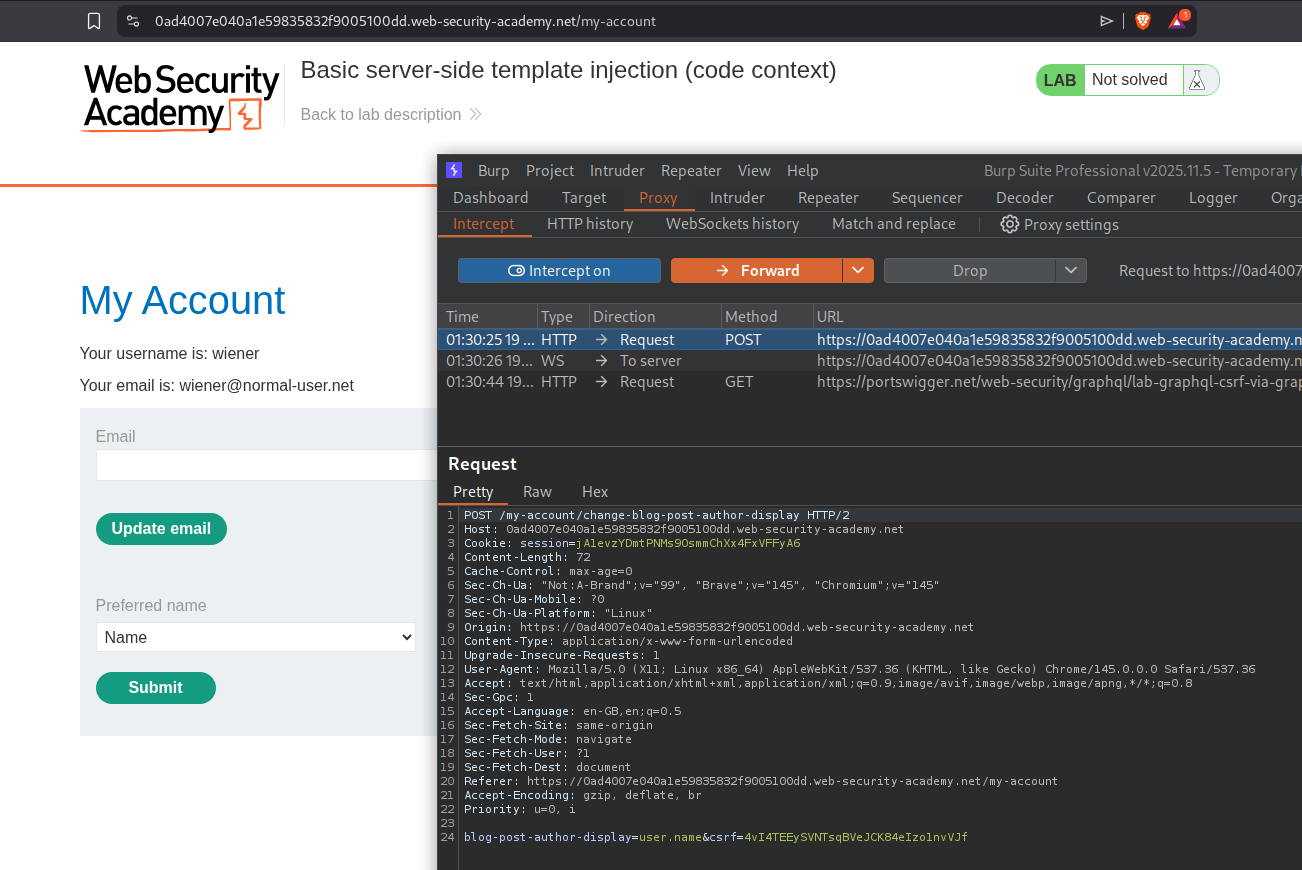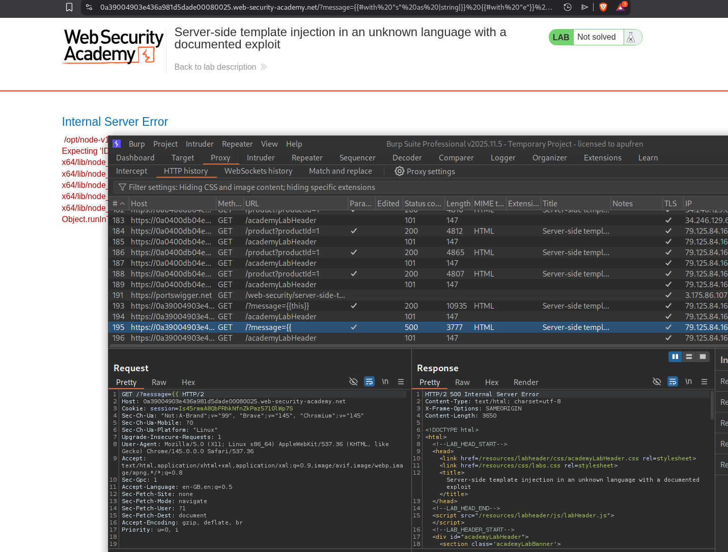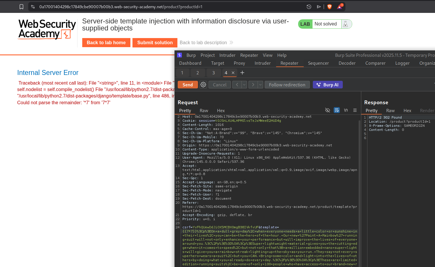 Completed all 7 Server-Side Template Injection (SSTI) labs from Portswigger. SSTI is one of the most impactful web vulnerabilities—when template engines process user input without sanitization, attackers can inject template expressions that execute arbitrary code on the server. These labs covered exploiting SSTI across five different template engines: ERB (Ruby), Tornado (Python), FreeMarker (Java), Handlebars (JavaScript), and Django (Python)—from basic expression injection to sandbox escapes and custom exploit development using leaked source code. Below is a detailed explanation of SSTI vulnerabilities followed by step-by-step walkthroughs for each lab.