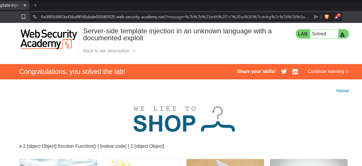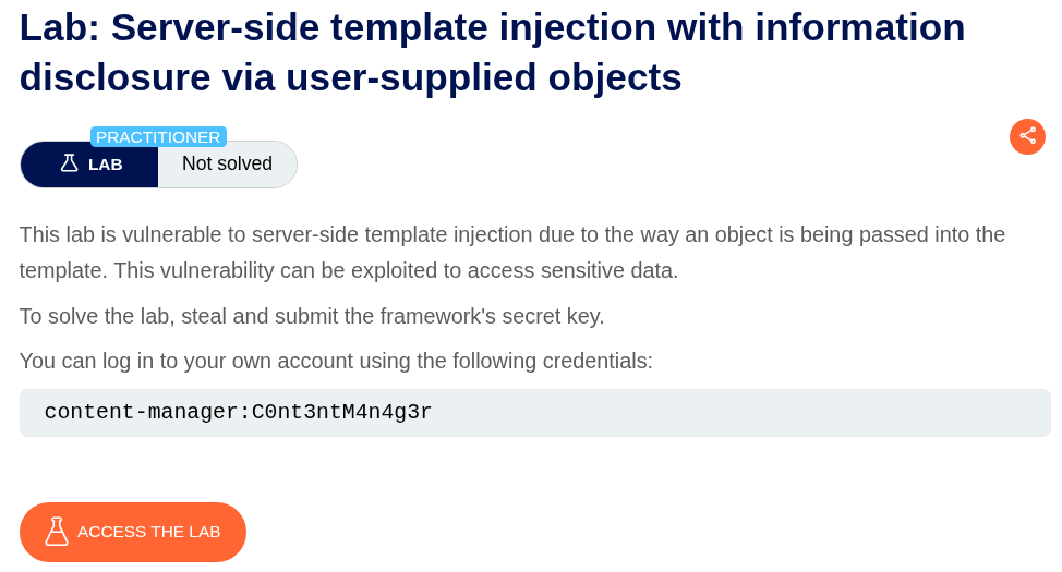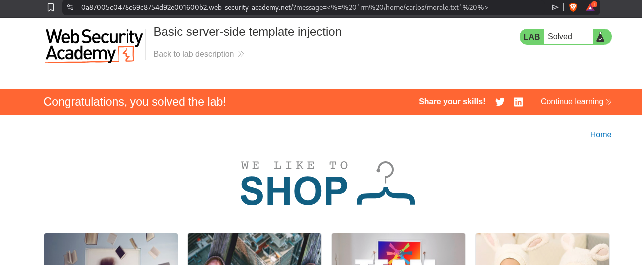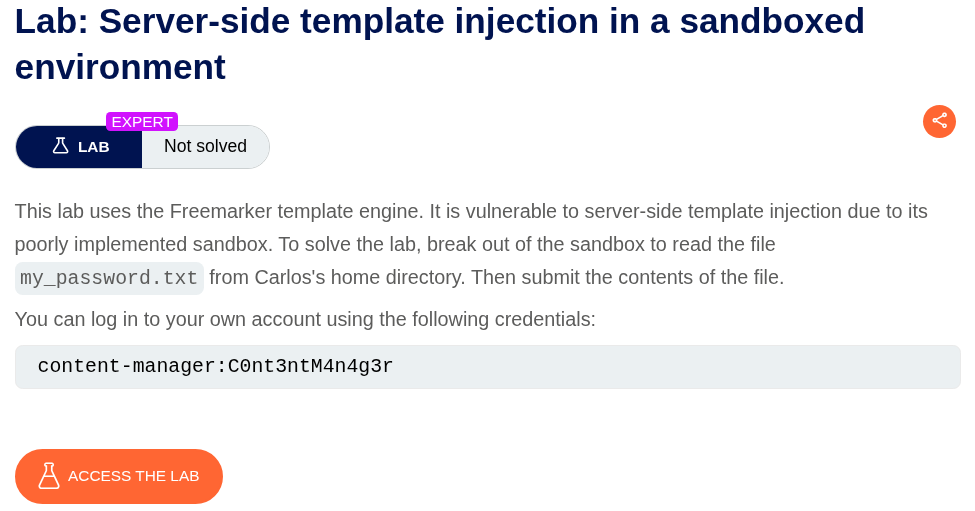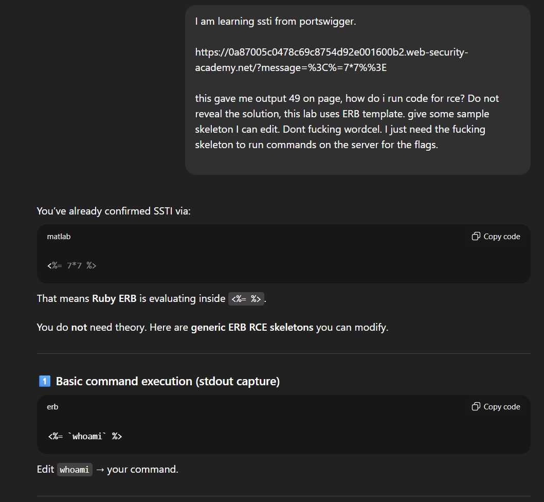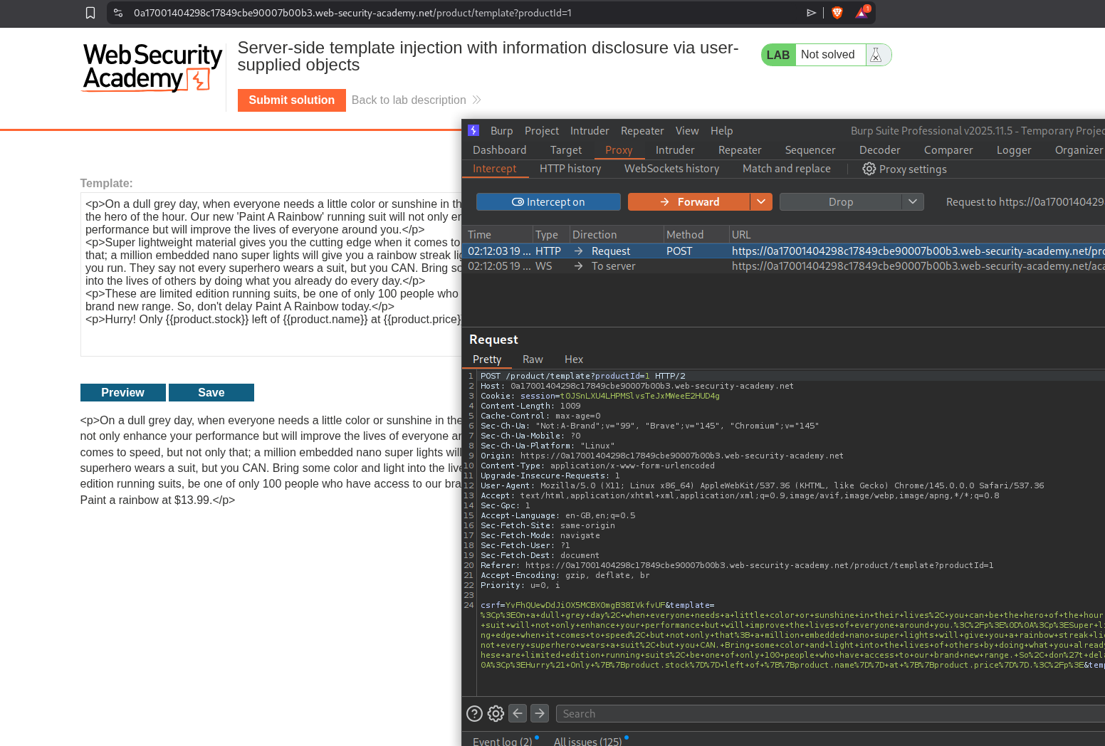 Completed all 7 Server-Side Template Injection (SSTI) labs from Portswigger. SSTI is one of the most impactful web vulnerabilities—when template engines process user input without sanitization, attackers can inject template expressions that execute arbitrary code on the server. These labs covered exploiting SSTI across five different template engines: ERB (Ruby), Tornado (Python), FreeMarker (Java), Handlebars (JavaScript), and Django (Python)—from basic expression injection to sandbox escapes and custom exploit development using leaked source code. Below is a detailed explanation of SSTI vulnerabilities followed by step-by-step walkthroughs for each lab.