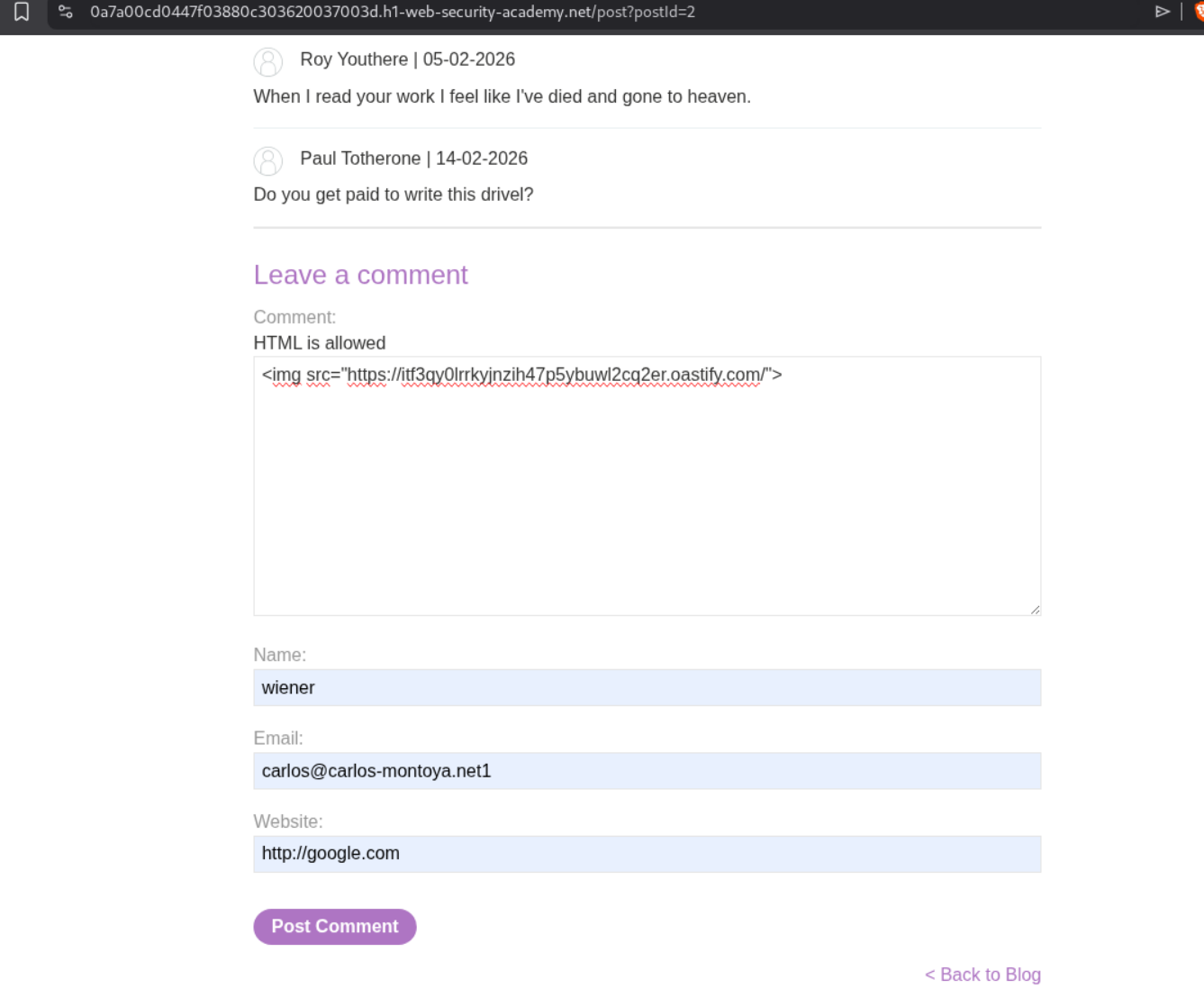 After a while, I sent it with the exploit server link. It gets reflected in the 2 places first, then after some time in 3 places.
