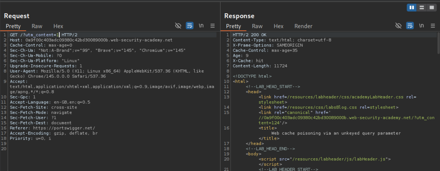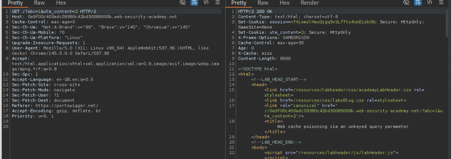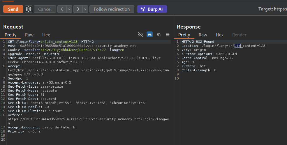 We also found the utm_content parameter in the request using param miner. We can get this cached on the GET /login?lang=en like GET /login?lang=en?utm_content=123.