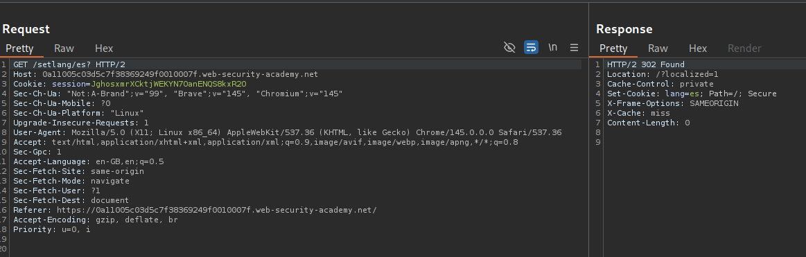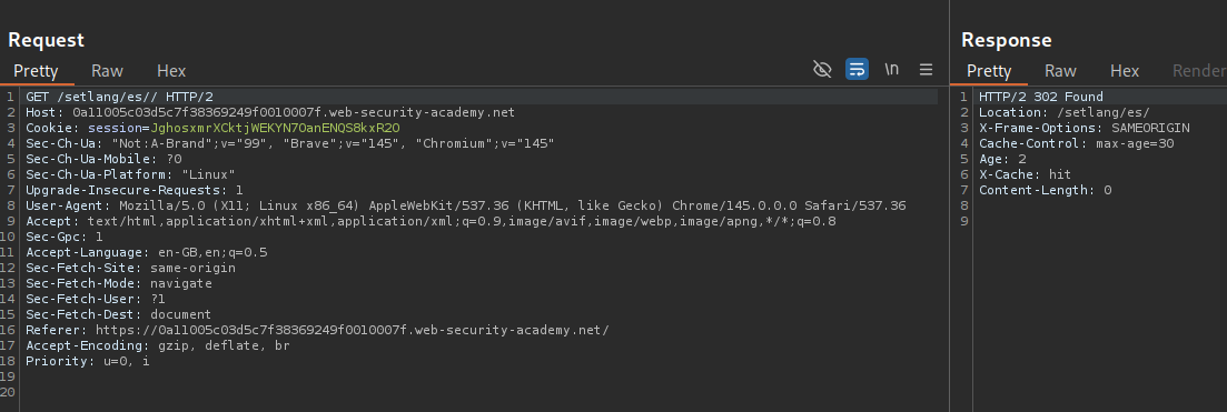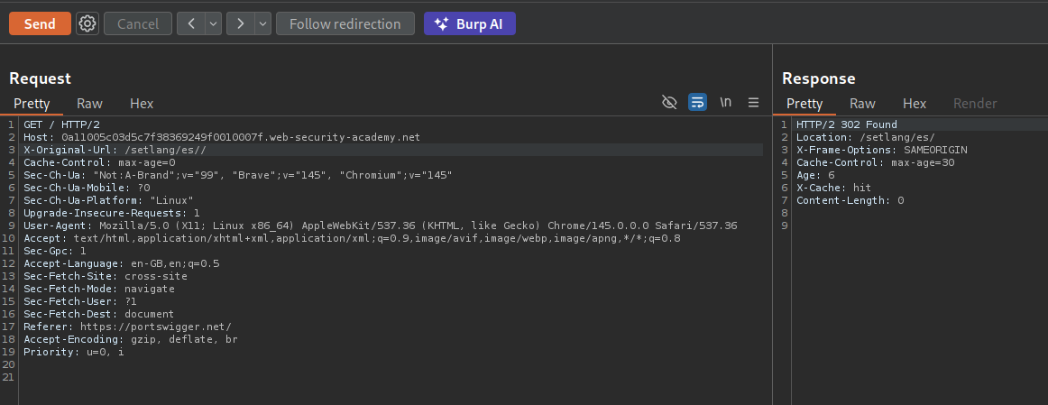 We need to redirect all users to the Spanish page. For that we will use the X-Original-Url header. Adding X-Original-Url with /login and adding a cache buster, we will see that we are redirected to the login page when we visit the page with the cache buster.
