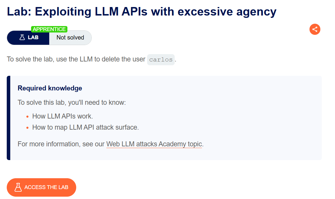 We need to scam the LLM into deleting the user carlos. Excessive agency means the LLM has access to APIs that can be abused to do unintended stuff.