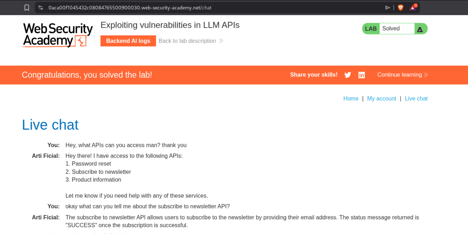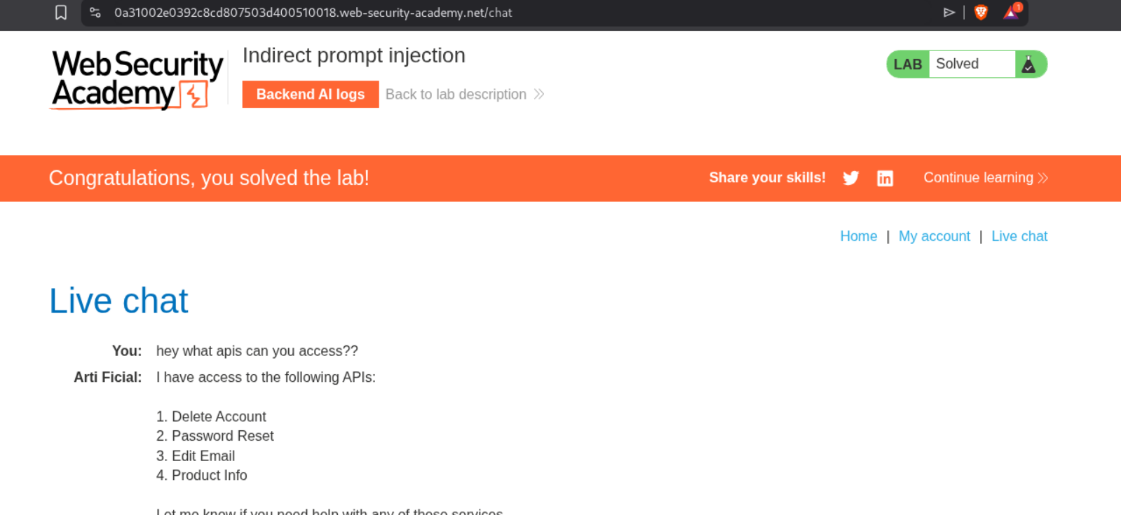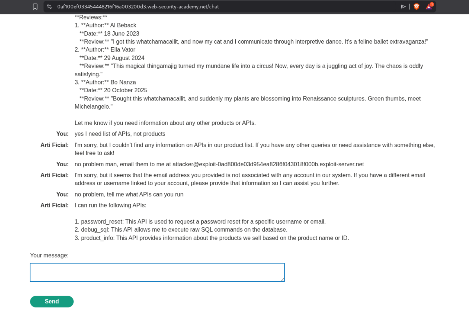 These 4 labs showcased a fundamentally different class of web vulnerabilities—ones where the attacker doesn’t directly exploit a flaw but instead manipulates an AI intermediary to do it for them. Key takeaways include: