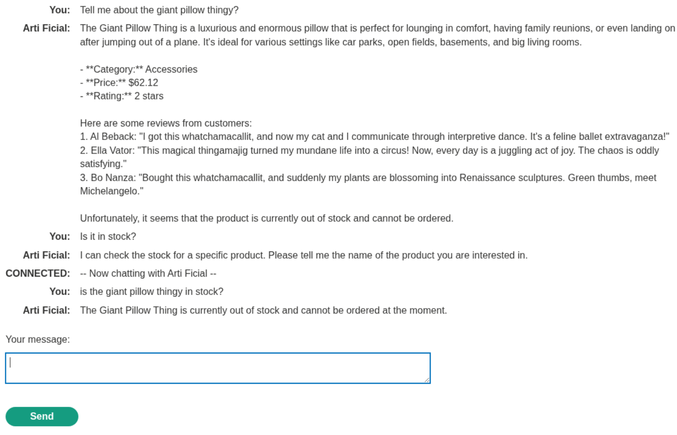 We can see that it is out of stock when we ask the LLM, meaning it can read the reviews and believe whatever the review says.